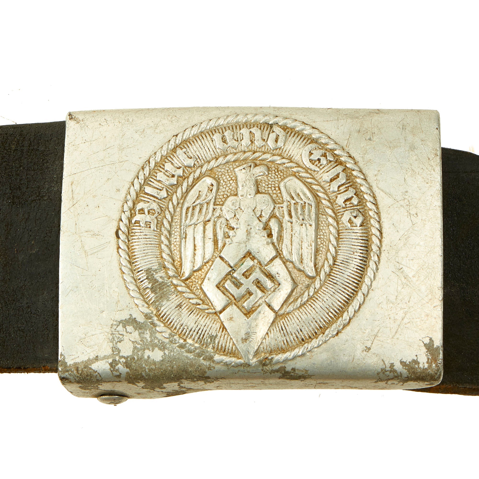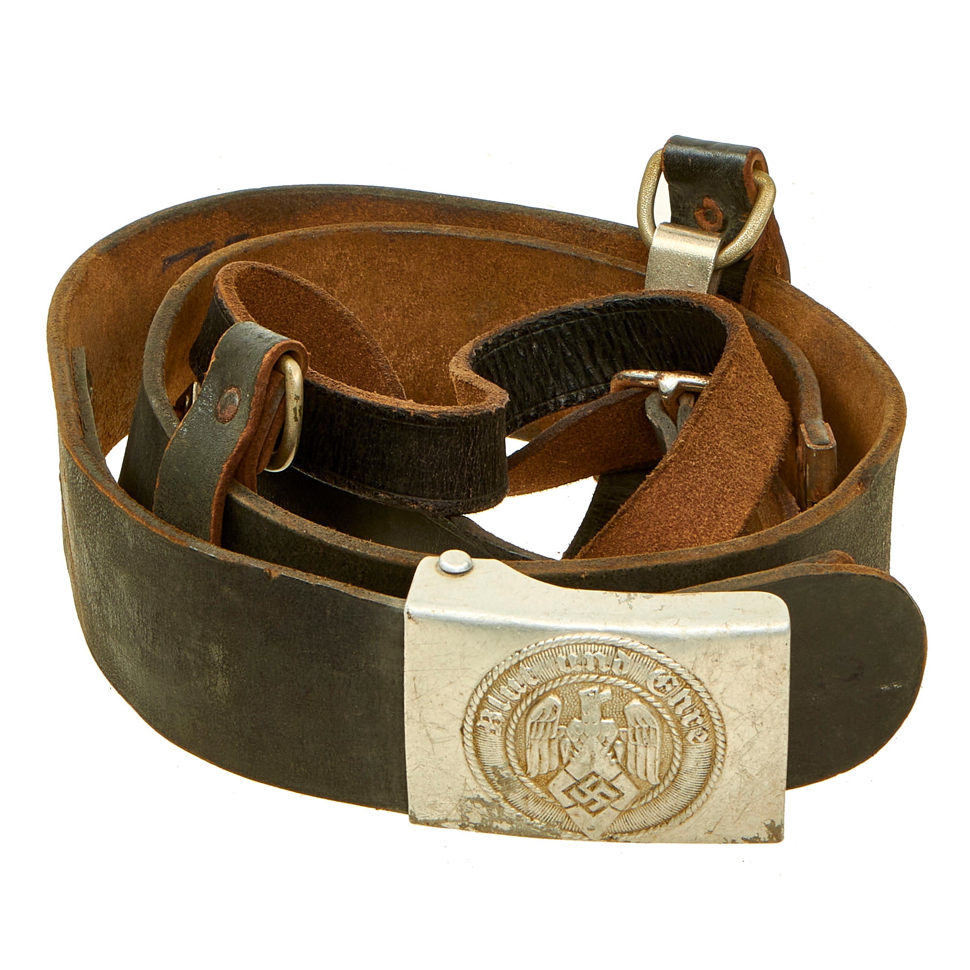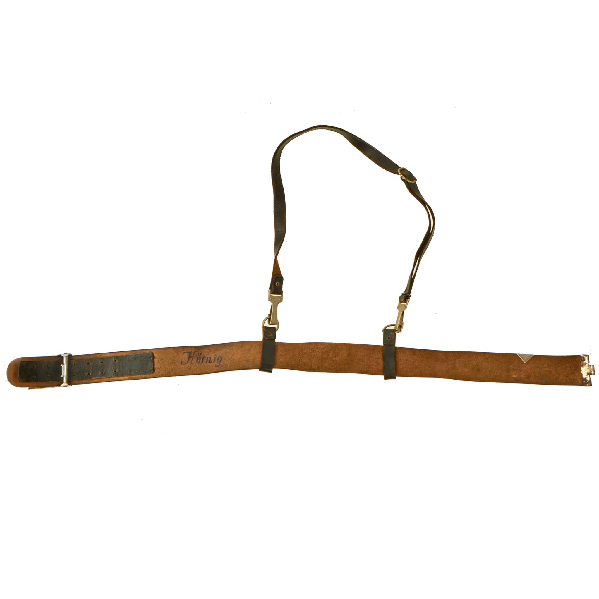 Original Item: Only One Available. This is a very nice WWII German HJ aluminum Belt Buckle (Koppelschloß), complete with the correct knife belt and even the hard to find cross strap. Even better, both the buckle AND the belt have the name Hörnig written on them in blue, so this looks be a matched set that has been together for over 80 years!