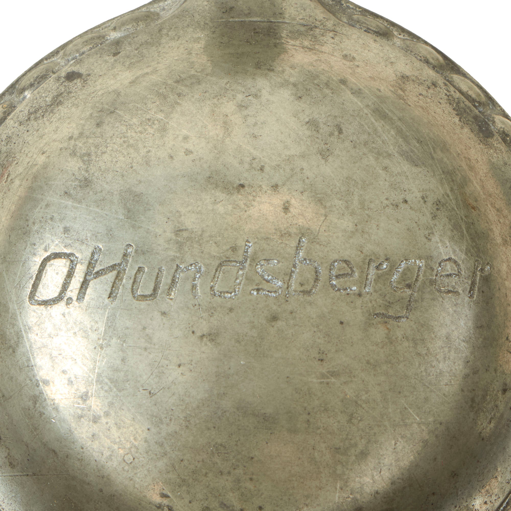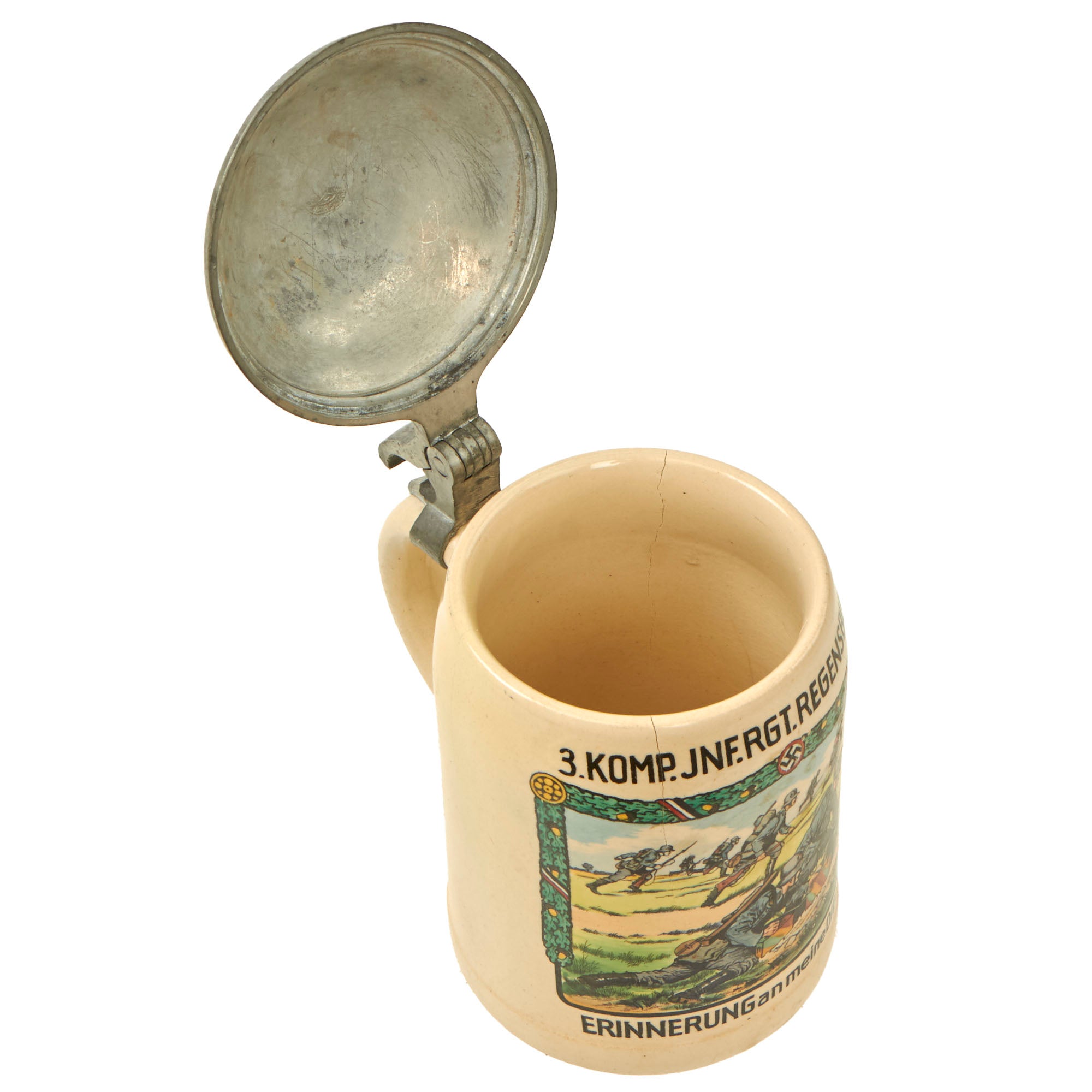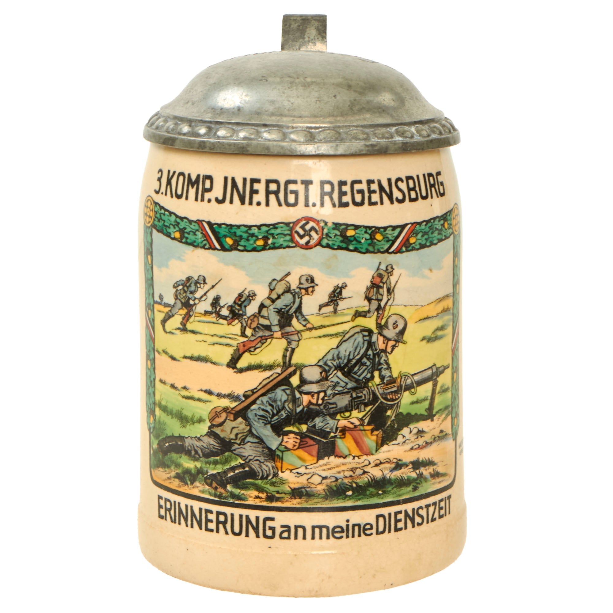 At the top of the stein under the lid it indicates that the stein is for service in 3. KOMP. JNF. RGT. REGENSBURG, for the 3rd Company, Infantry Regiment Regensburg, a pre-war unit that was a vestige of the Weimar Republic Reichswehr. On the top of the lid it is named to O. Hundsberger, and at the bottom under the battle scene it has standard ERINNERUNG an meine DIENSTZEIT, which translates to "In memory of my service". It is a 10/20 (0.5liter) size as marked by the handle, and measures approximately 6 inches tall. There is not as much ornamentation and text as we sometimes see on these, however these varied widely, and we have seen this exact same basic design before.