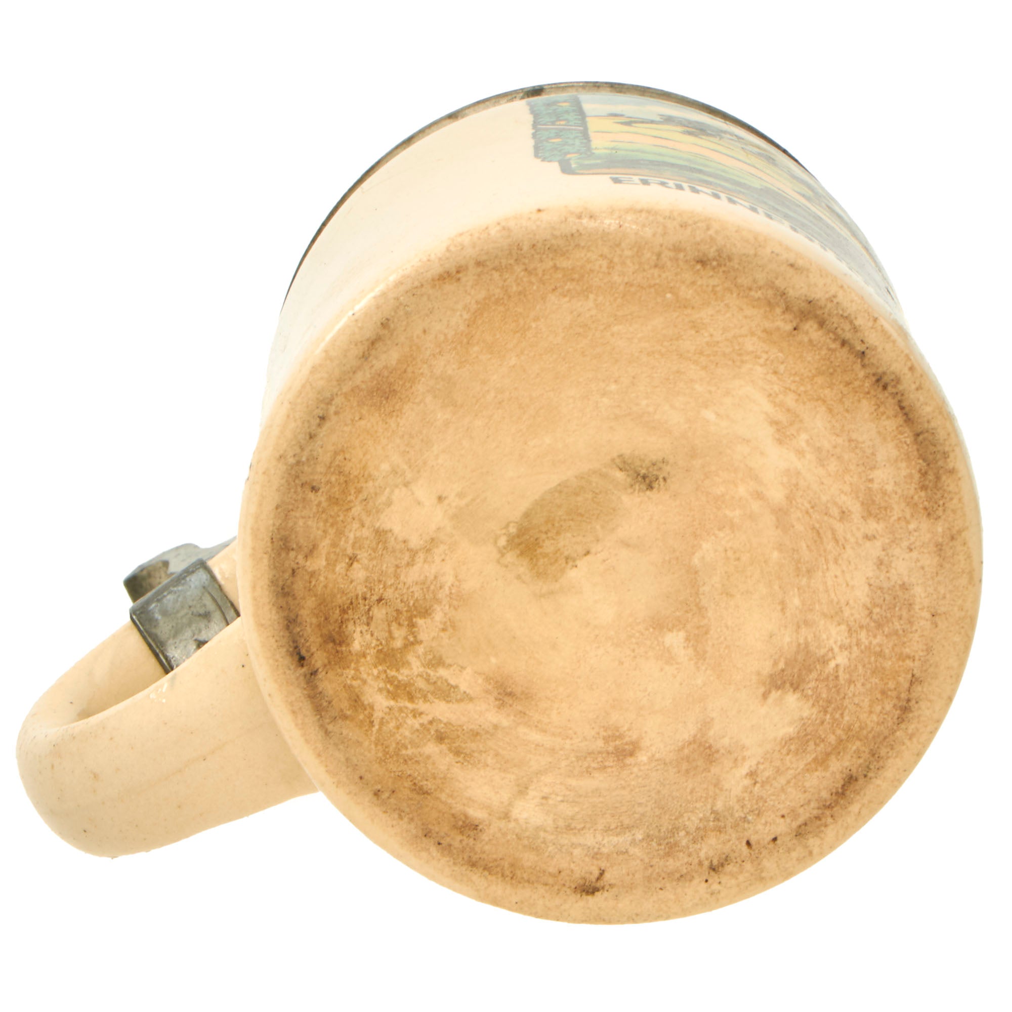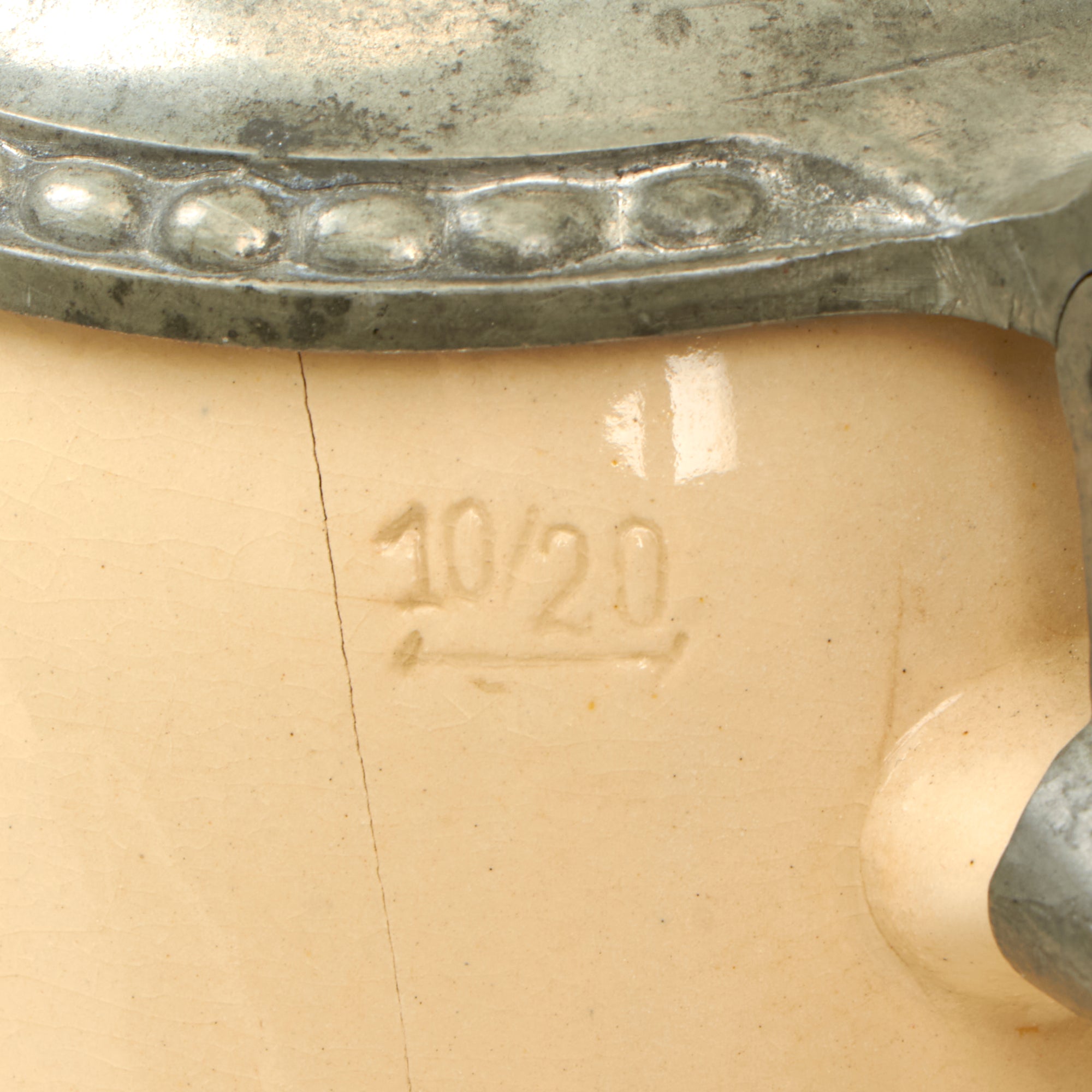 Condition is very good, with a lovely patina, though it does appear that the stein has cracked due to age in several areas, such as right by the size marking and through the front panel. We see no evidence of damage from being dropped, so we assume that due to improper firing or storage over the decades these cracks developed.