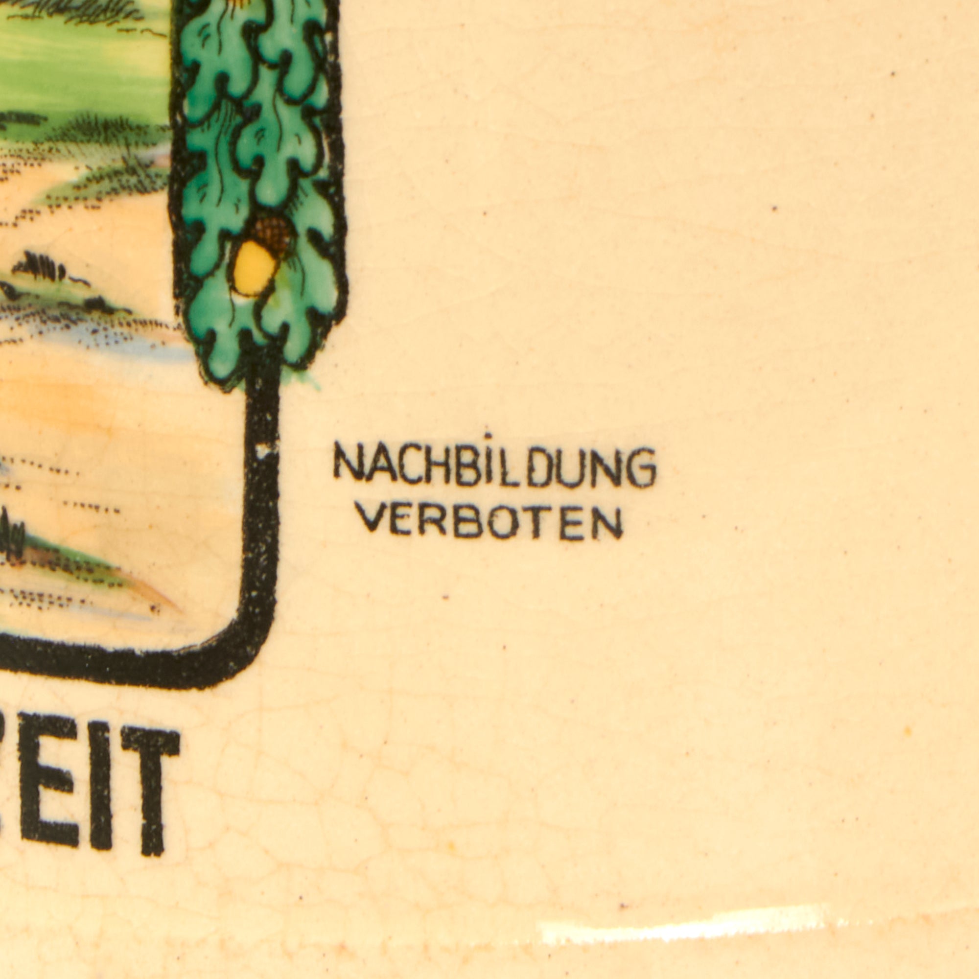 This is a totally genuine WWII Third Reich era produced ceramic .5L beer stein with a hinged pewter lid. This is a souvenir that would have been purchased by a Heer Army Infantry soldier during the pre WWII Era. The stein features a lovely battle scene, showing Infantry soldiers advancing across the field, with a Maxim 08/15 in a support roll to the bottom. It shows the iconic camouflage pattern often used on early / pre wwii cammo cans. To the right of the panel is a small NACHBILDUNG VERBOTEN "reproduction prohibited" notice.