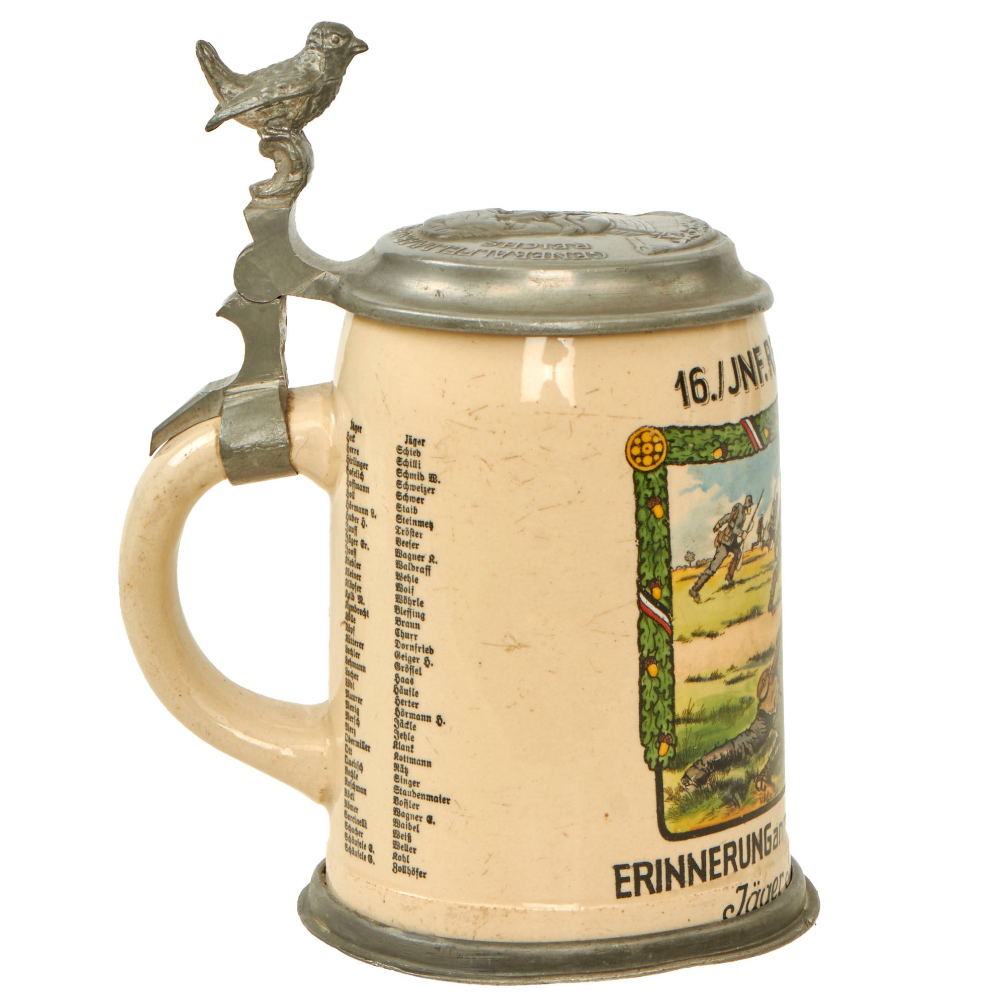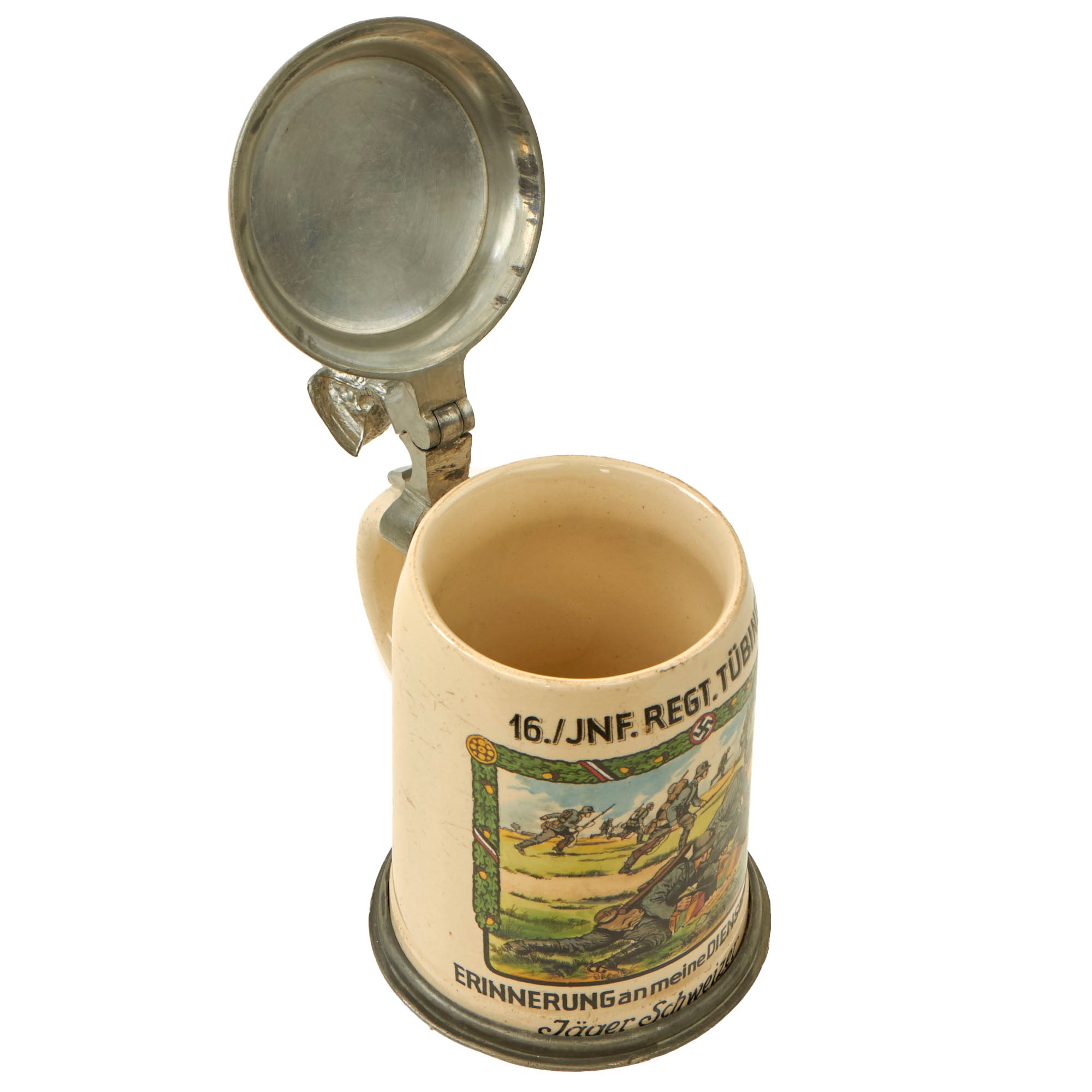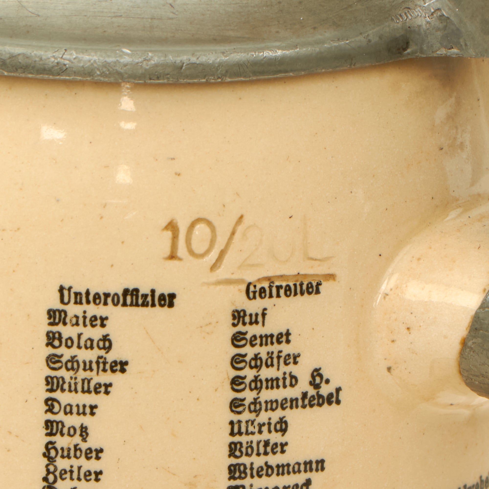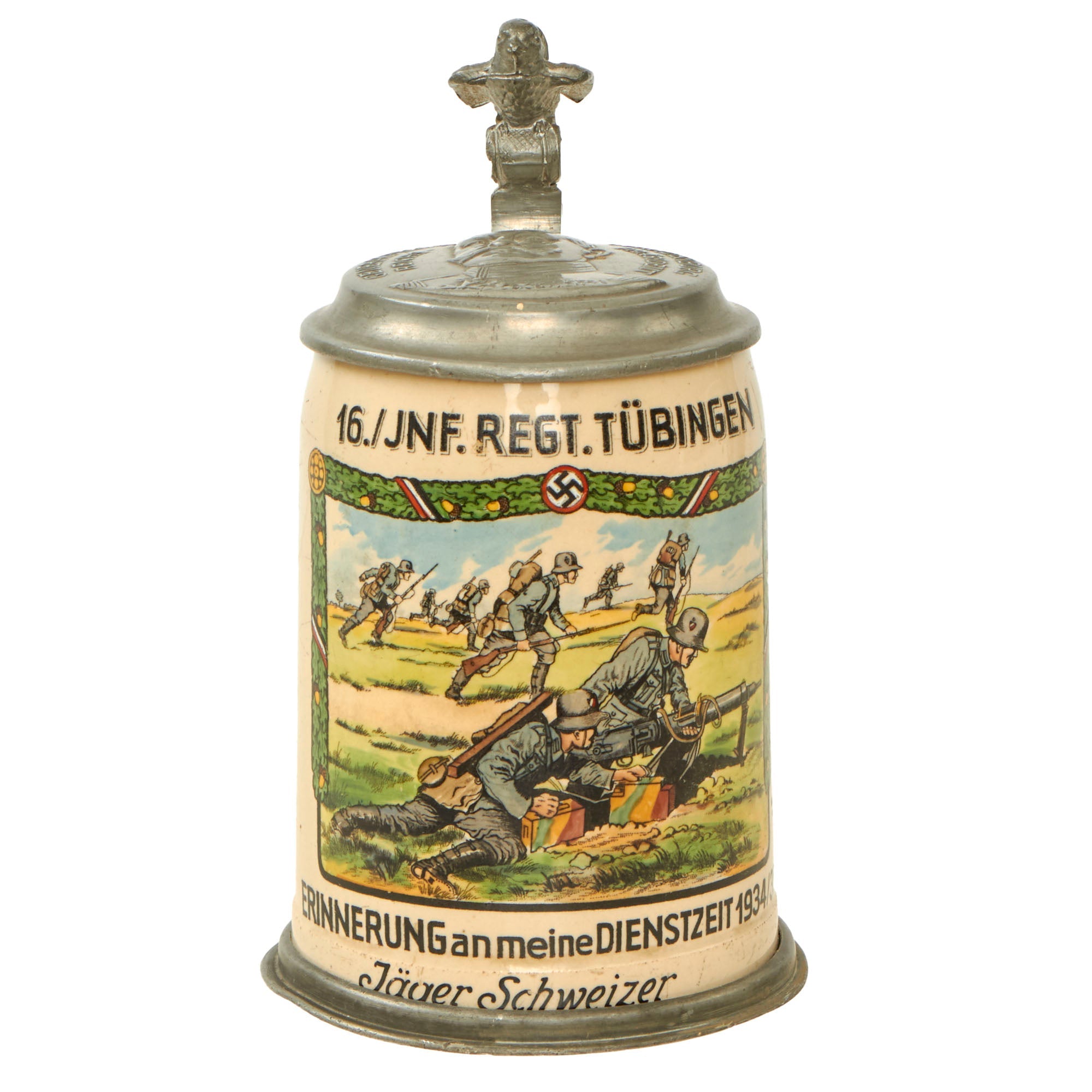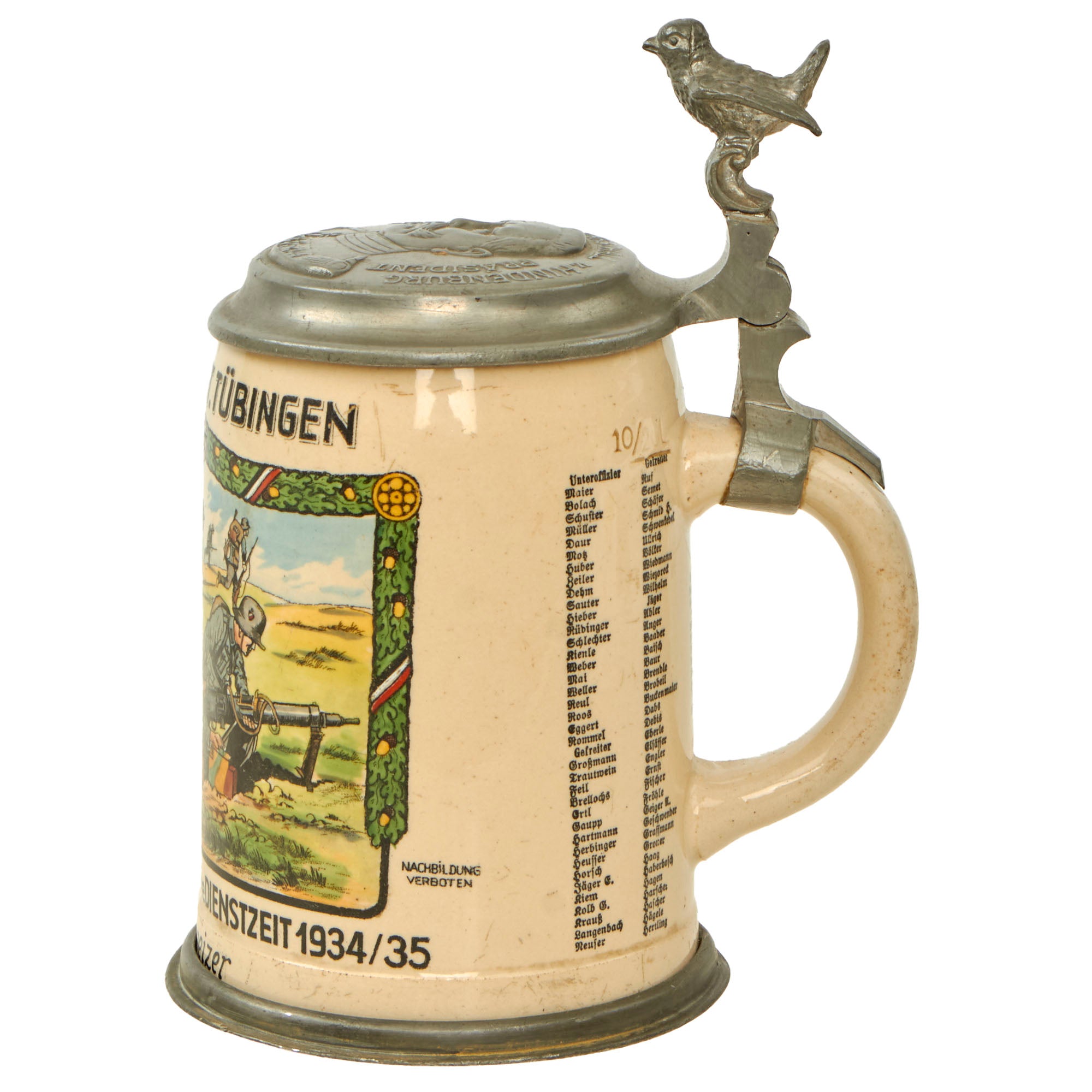 At the top of the stein under the lid it indicates that the stein is for service in 16. / JNF. REGT. TÜBINGEN, for the 16th Company, Infantry Regiment Tübingen, a pre-war unit that was a vestige of the Weimar Republic Reichswehr. At the bottom of the stein just above the pewter trim it is named to Jäger Schweizer, above this has the standard ERINNERUNG an meine DIENSTZEIT 1934/35, which translates to "In memory of my service 1934-35". To the right of this is a list of the members of the company, which look to all be NCO and Enlisted personnel.