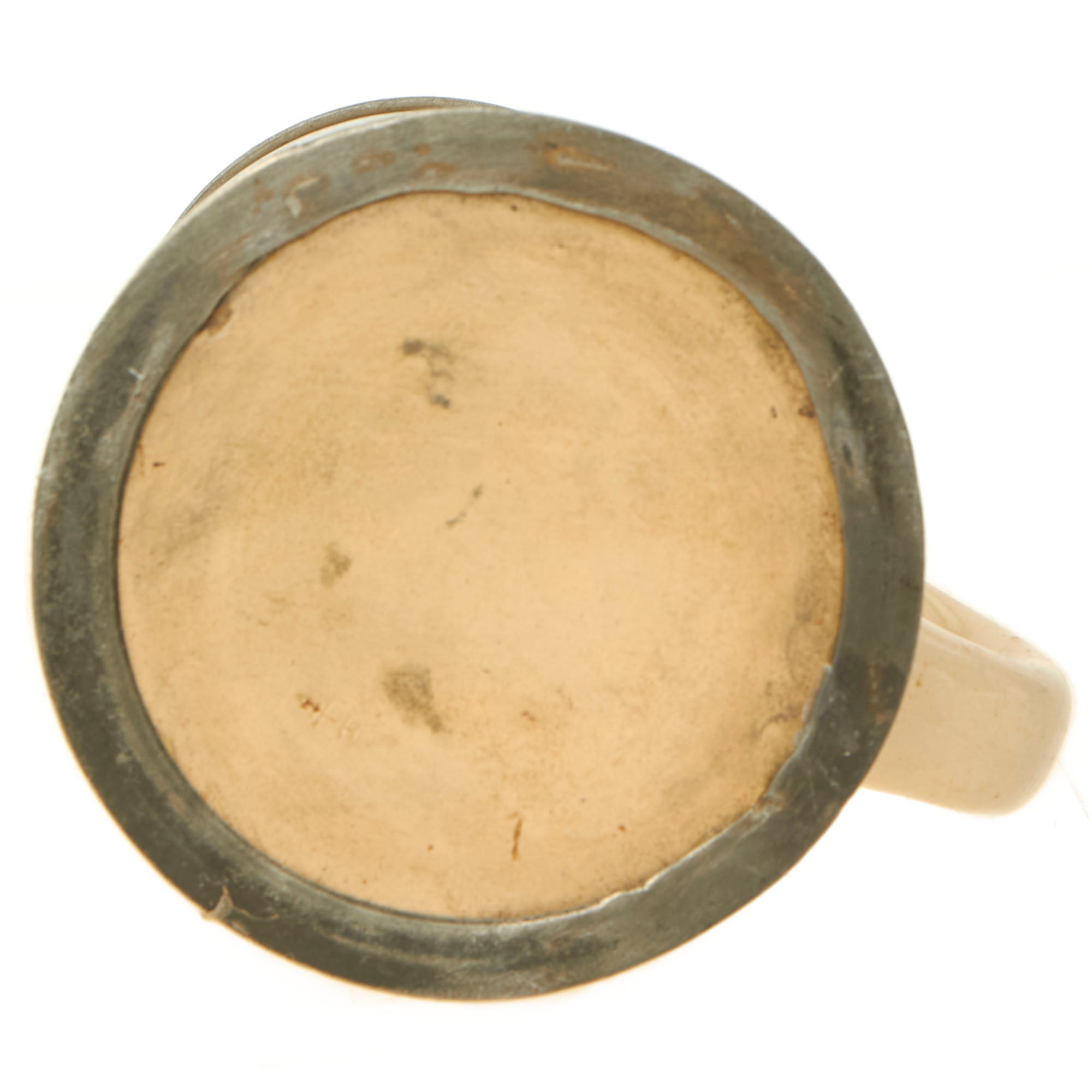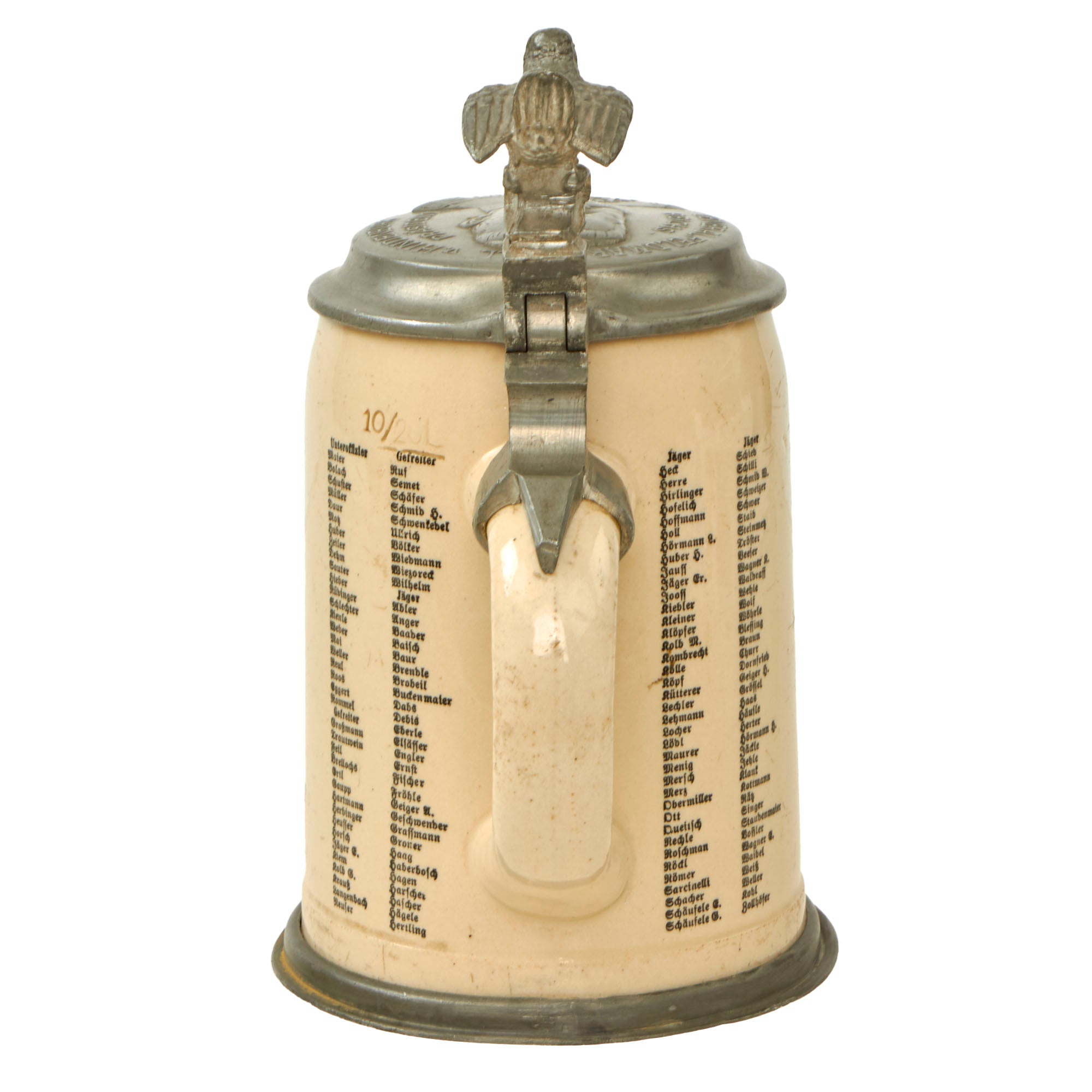 The stein has retained its bright colors and its pewter lid, which shows an embossed bust of Reichspräsident Paul von Hindenburg, who passed away in 1934, right during the period of service of Schweizer. Most likely these were already made, and there was no reason to update them, as the office was abolished once Hindenburg passed away. It is a 10/20L (0.5liter) size as marked by the handle, and measures approximately 6 inches tall