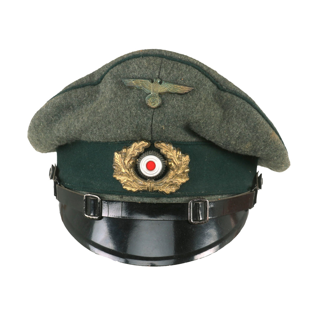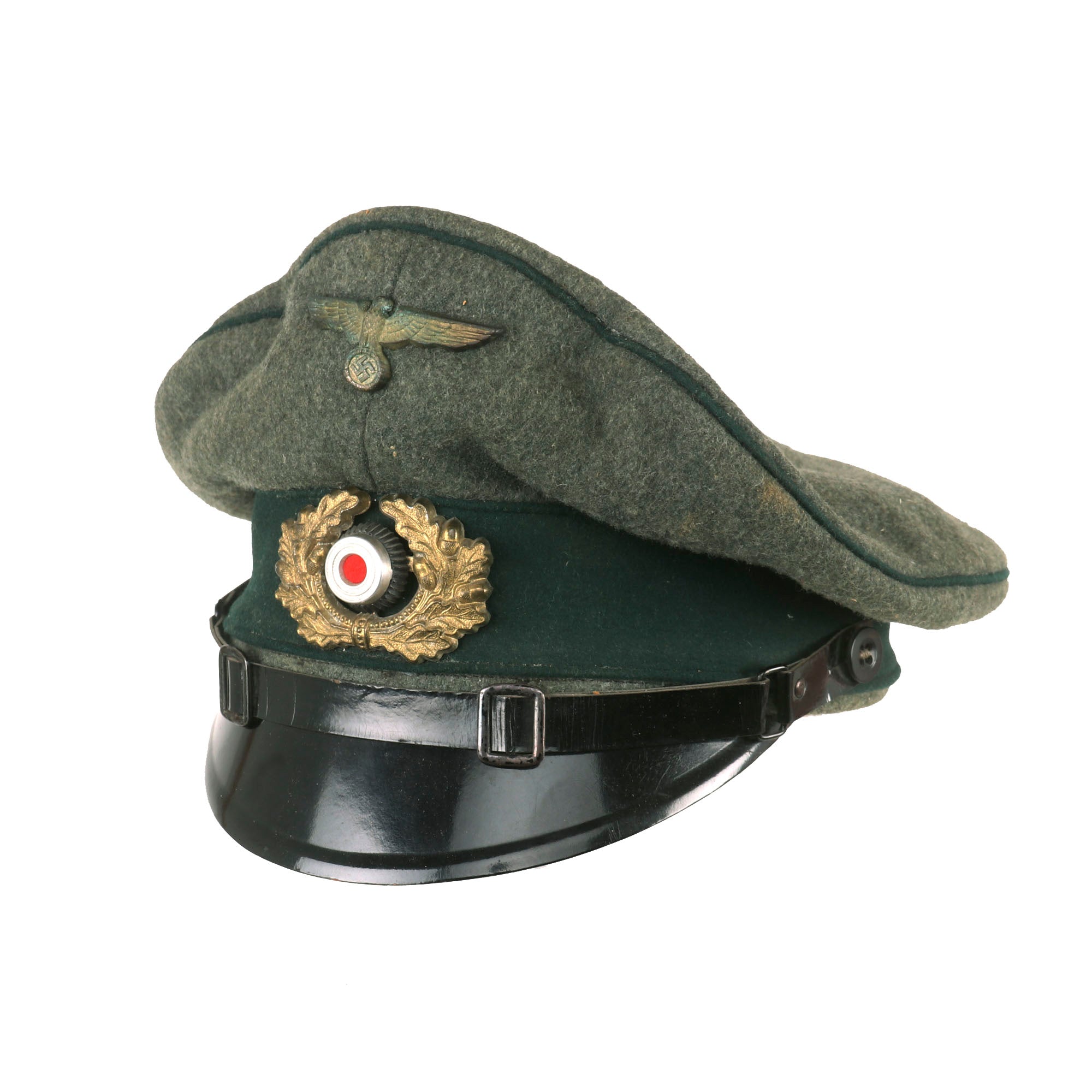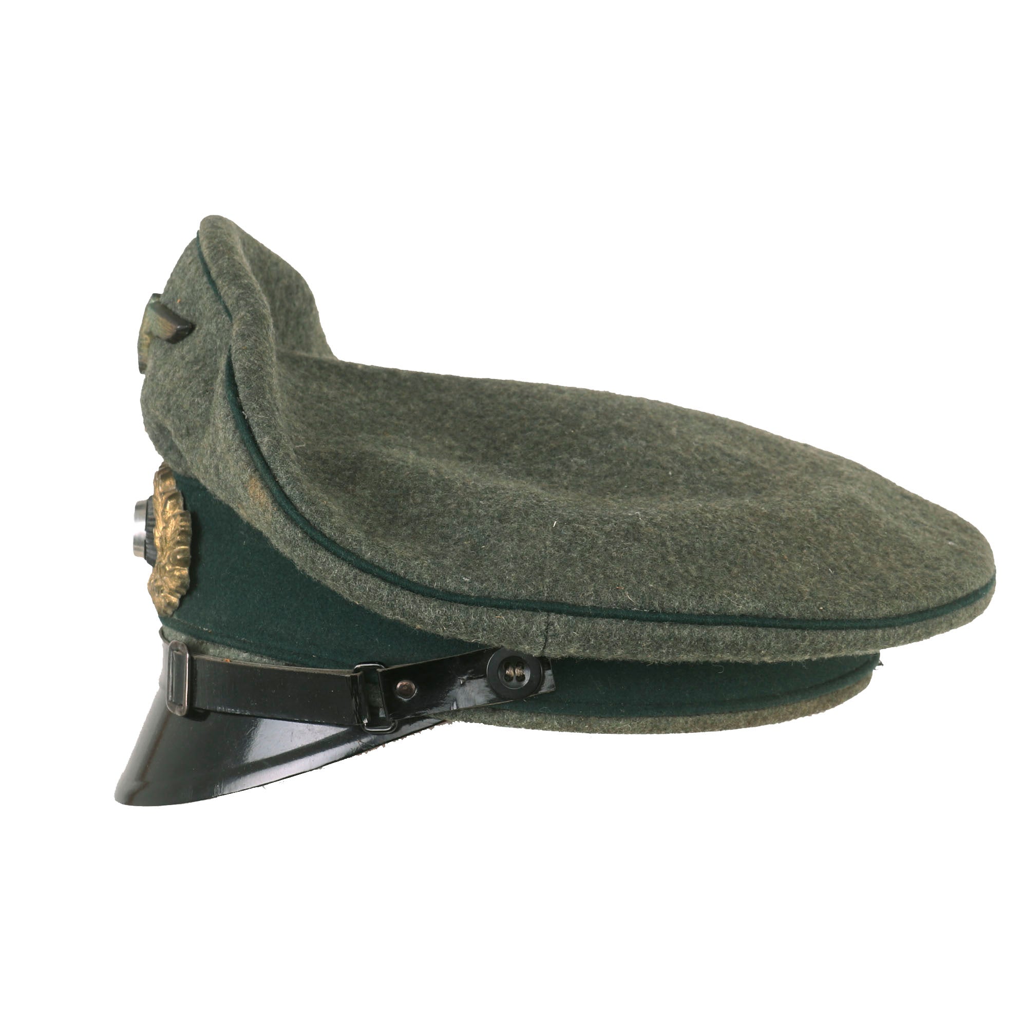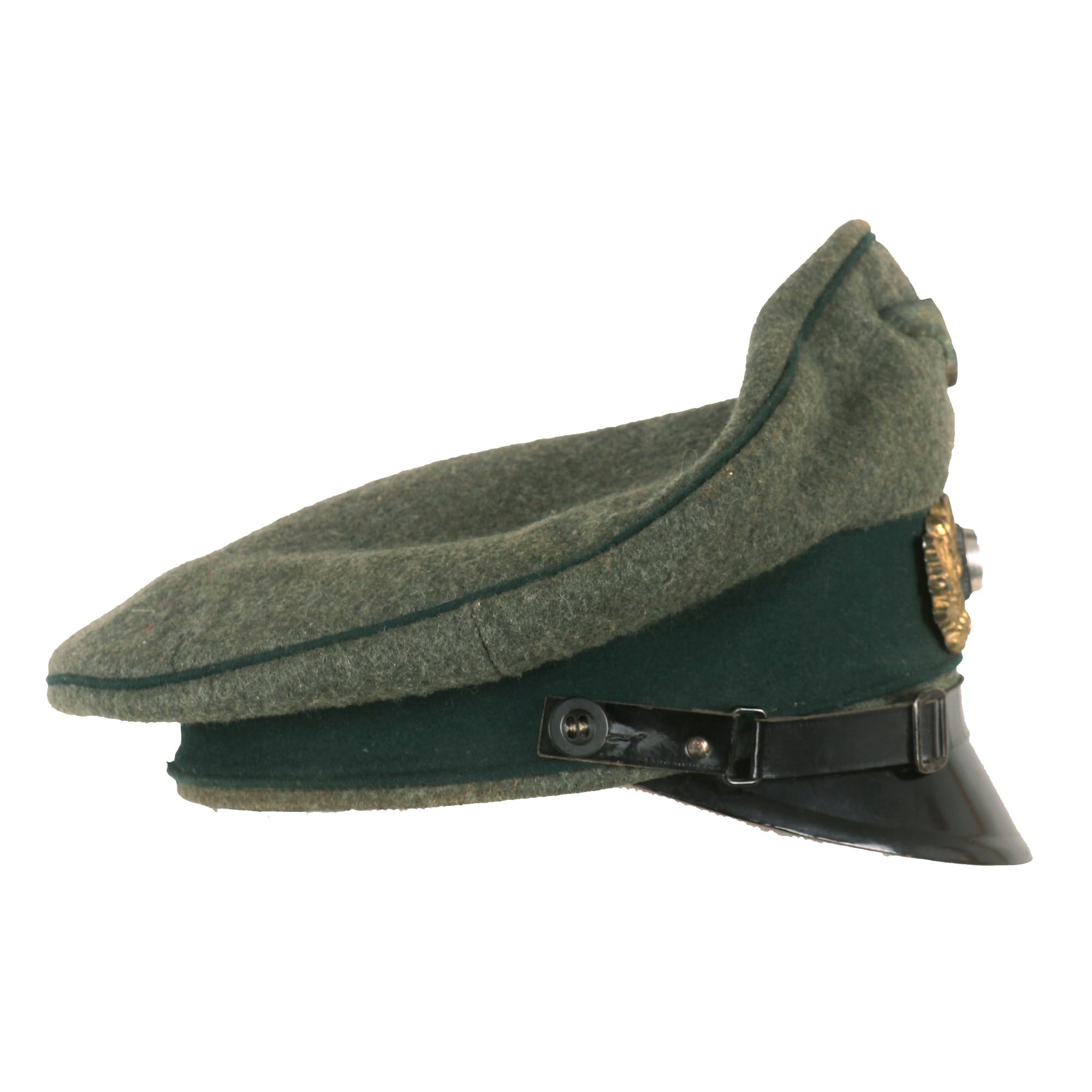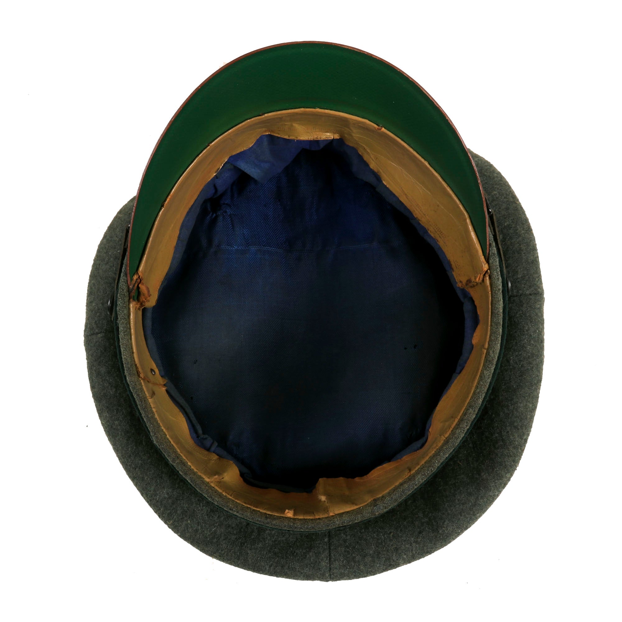 Original Item: Only One Available. This is a lovely service used condition German WWII Kriegsmarine Küstenartillerie (Navy Coastal Artillery) EM/NCO Schirmmütze Visor Cap, with a lovely "Crushed" shape. This "saddle-form" shape is highly desirable, accomplished by removing the crown support stiffener ring. The cap shows high quality fabrication, made with typical feldgrau (Field Gray) green / gray wool with a flaschengrün (dark bottle-green) "badge cloth" band and a traditional high front, with matching bottle green piping around the top. This is very similar to the Army Heer visor cap, except that there are no corps colors around the green band, and the insignia are Kriegsmarine Gold.