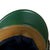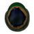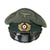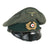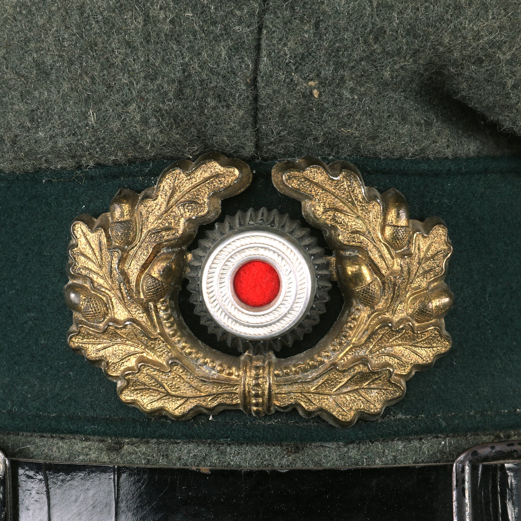 It is decorated with a well detailed stamped gold washed alloy Wehrmachtadler National Eagle insignia on the peak and and an open gold washed cast aluminum oak leaf and acorn wreath surrounding an aluminum and metal tri-color cockade on the band. These are in very good shape, and have a lovely patina on the gold washed components, particularly the eagle, which has had the bronze powder oxidize to green. The cap has the correct black patent leather EM/NCO chin strap with double buckles. The visor / peak on this cap is the typical black-finished "vulcanfibre" pressed composite material. It is in great shape, still well-attached to the cap, and is checkered green on the underside.