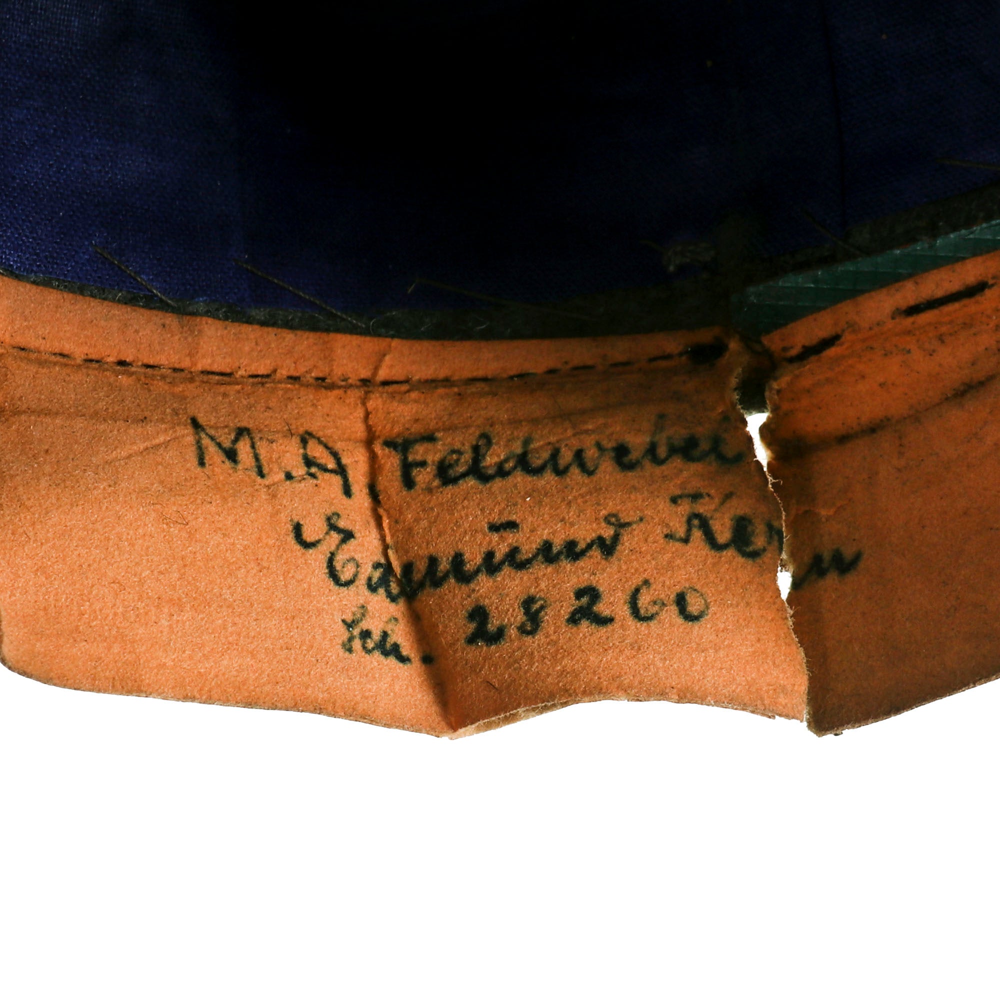 The writing is in Kurrentschrift, an older form of Germanic script writing, which unfortunately has many letters looking almost identical, so we had trouble trying to decipher what it reads. However, we are fairly certain that it is "Edmund", which would be written "Edmŭnd" in Kurrent. His rank is given as M.A. Feldwebel, or Marineartillerist Feldwebel, equivalent to a Petty Officer 1st Class in the U.S. Navy. Definitely some fantastic research potential here!