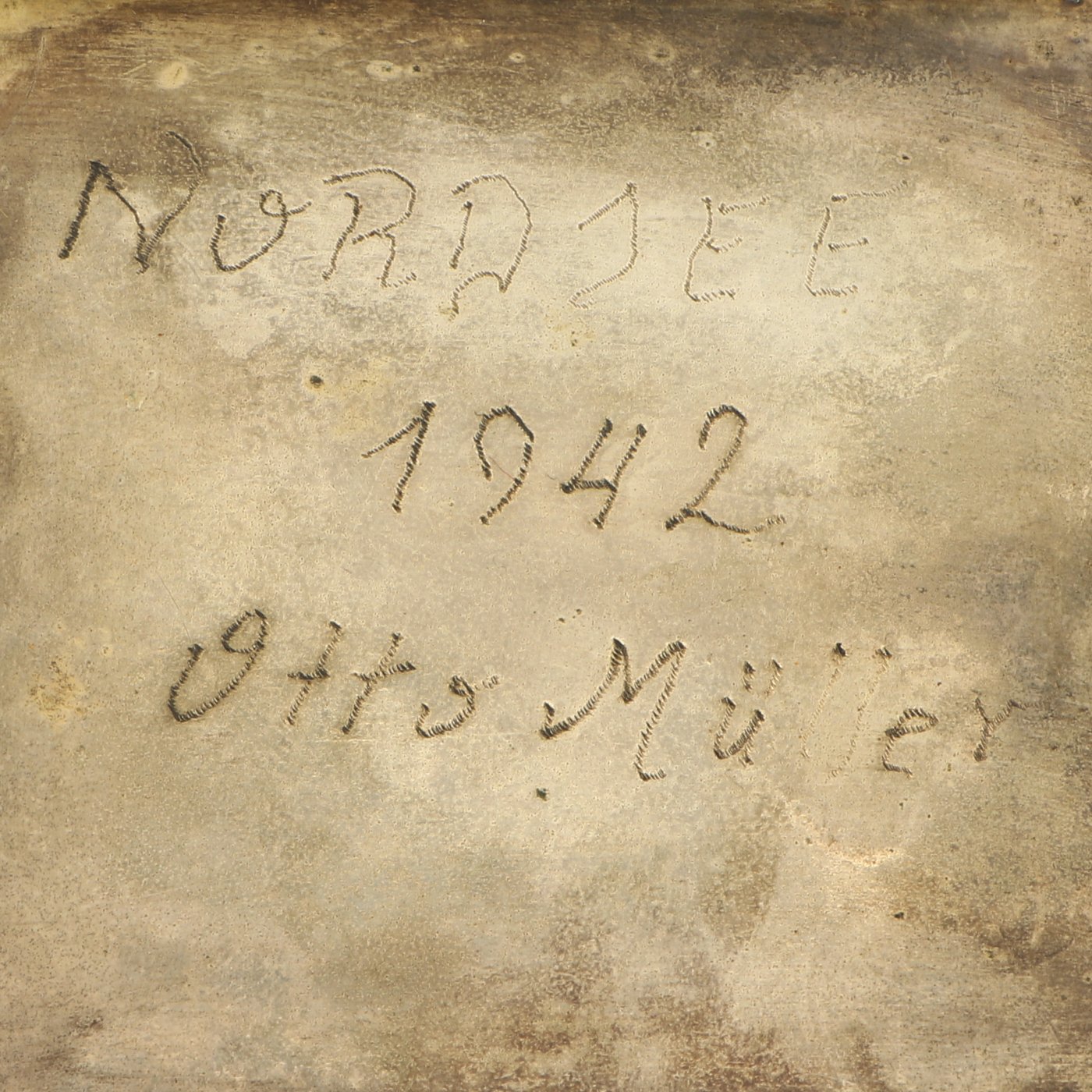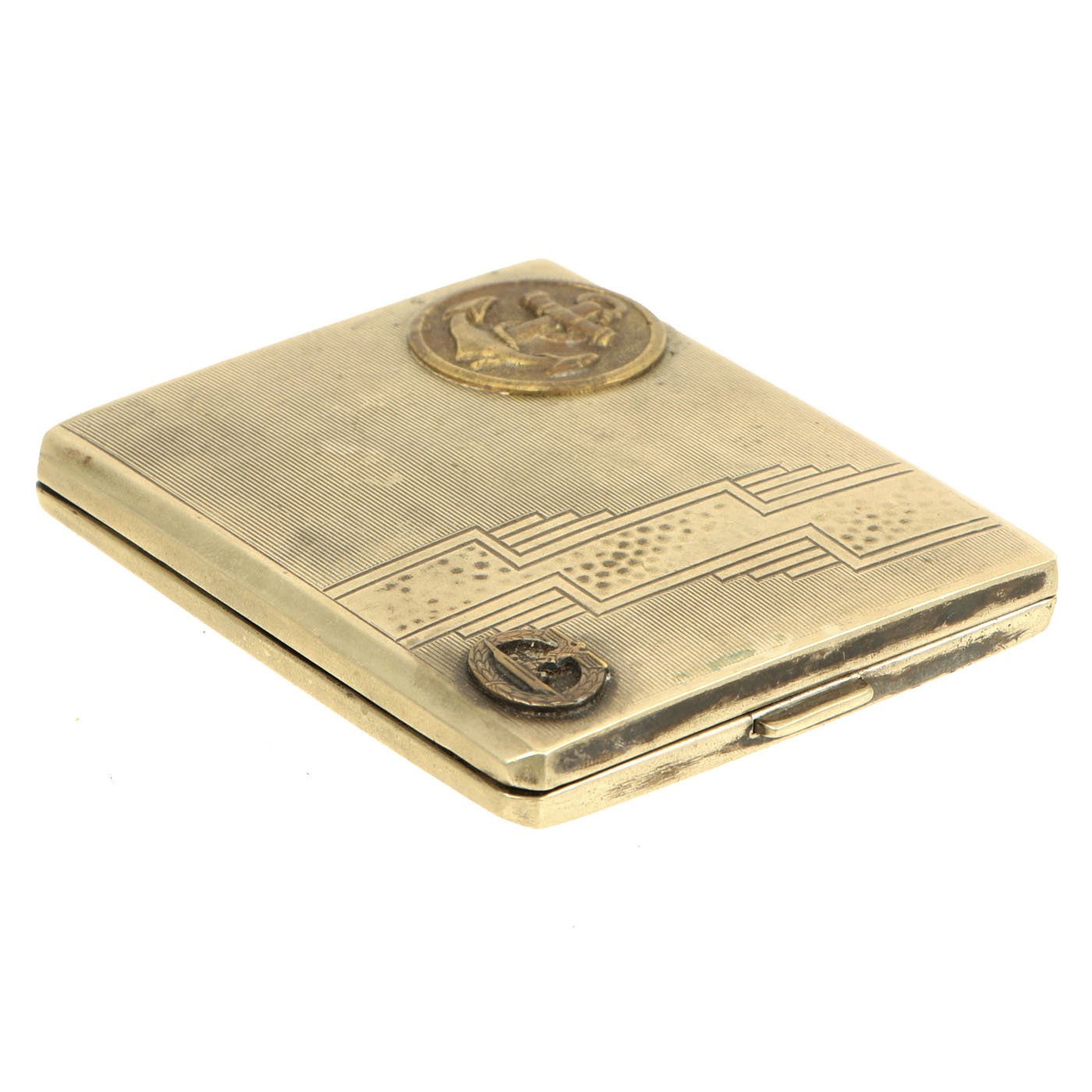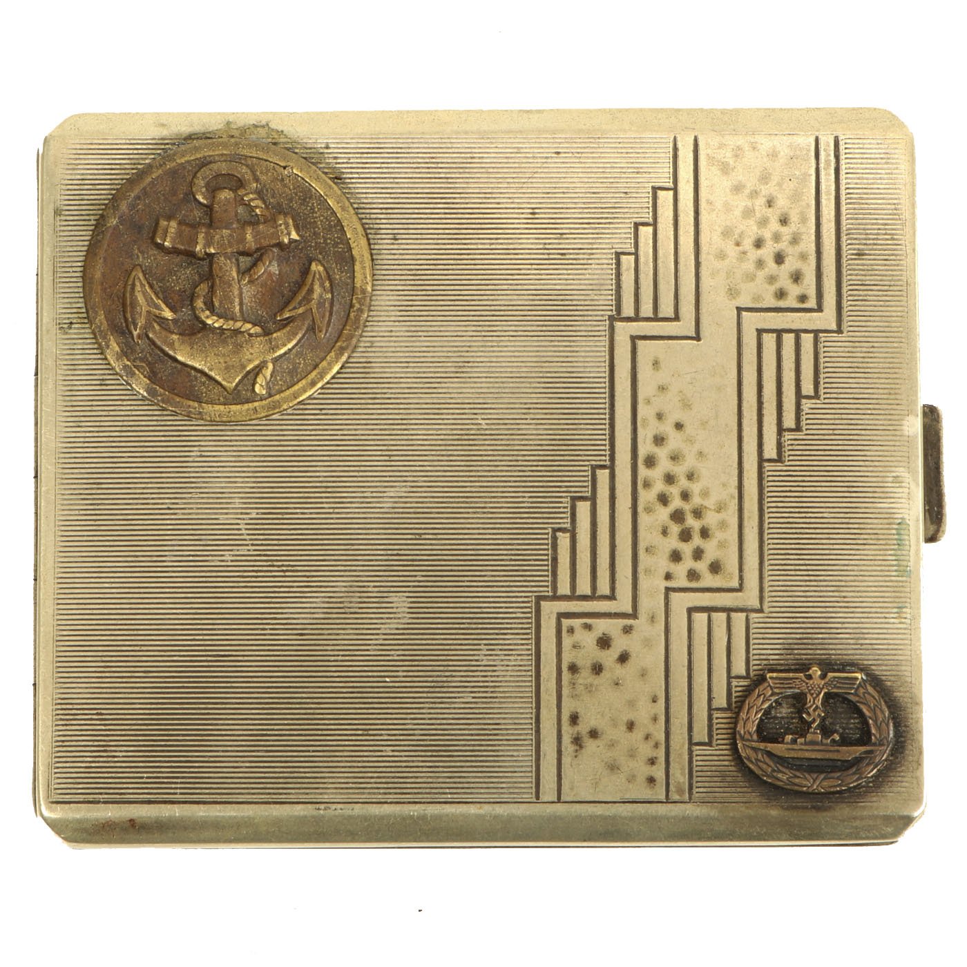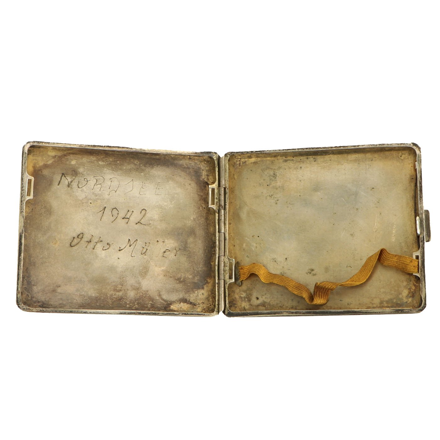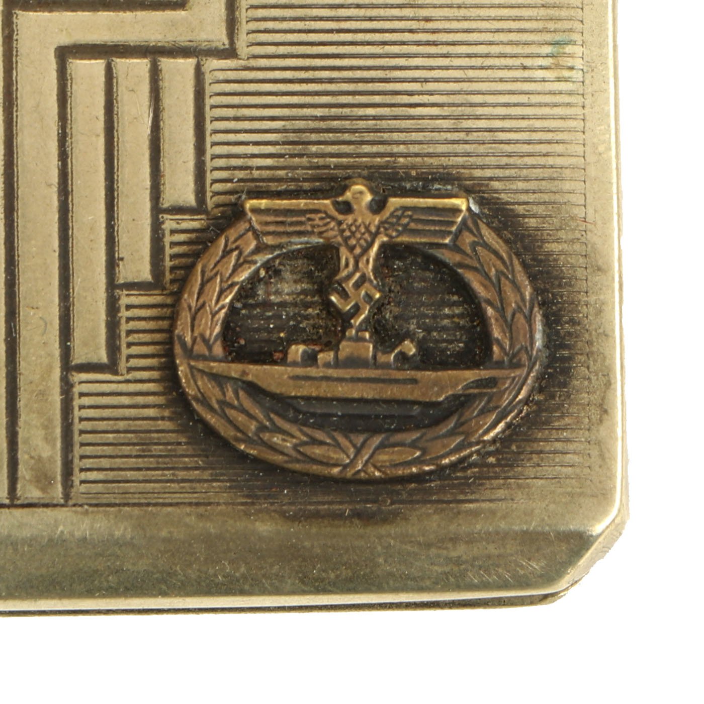 Original Item: One of a Kind. This was just acquired from a collector at a large military collection. This is a very nice German WWII Kriegsmarine U-boat marked Cigarette case, made from what looks to be nickel alloy, which was once washed gold inside. The latch is marked ALPACCA, a known brand of German WWII era cigarette cases. When opened, the left compartment is named and dated as follows: