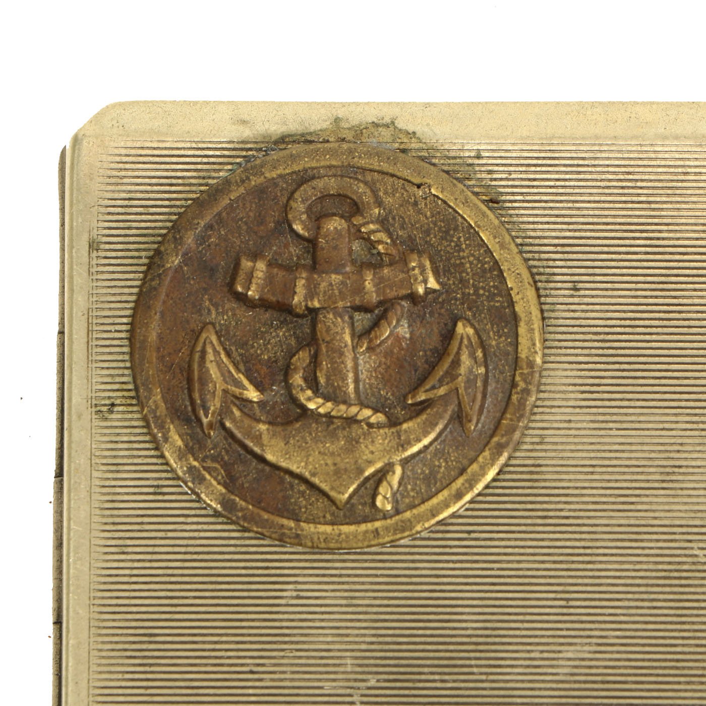 The lid of the case has two brass insignia: a Naval "Fouled Anchor" in the upper left, and a miniature U-boat War Badge in the lower right. They have definitely been on the case for some time, and we have no doubts regarding authenticity.