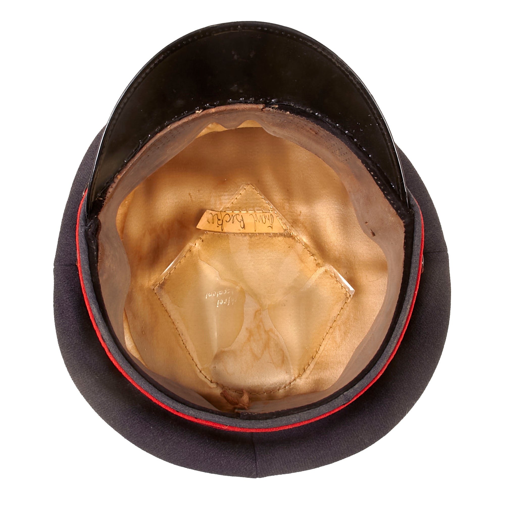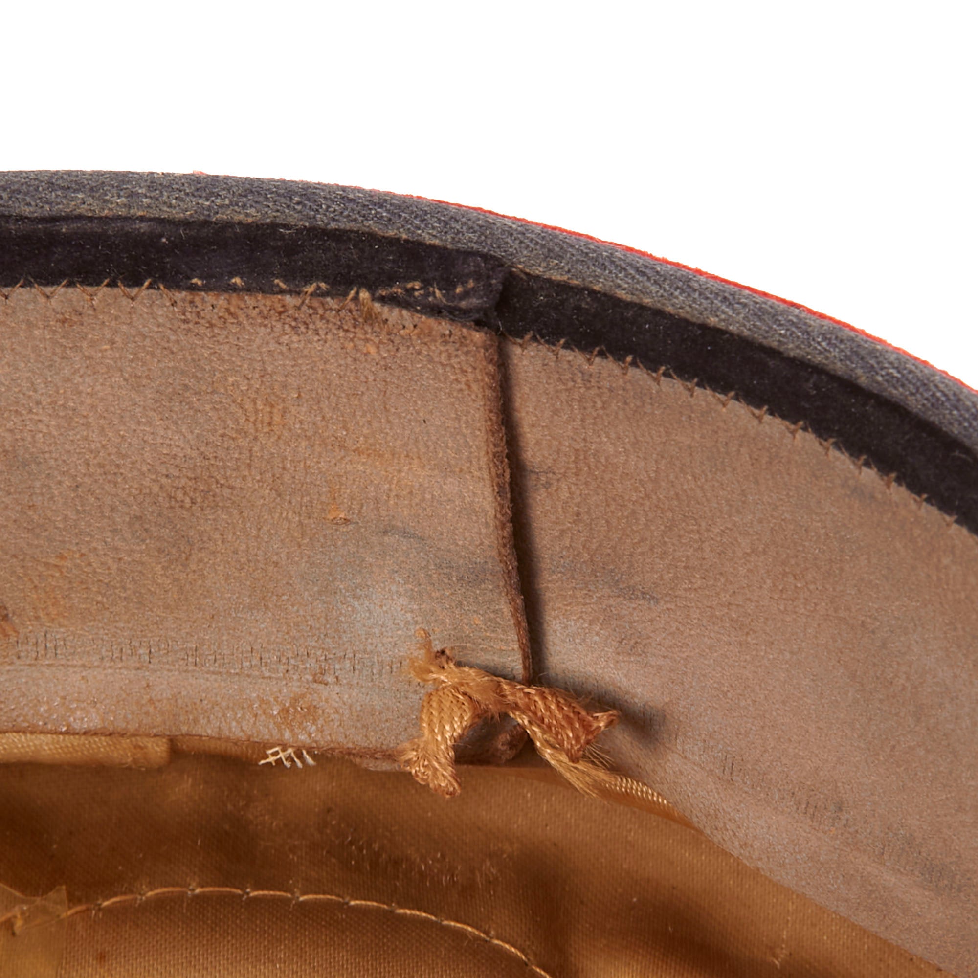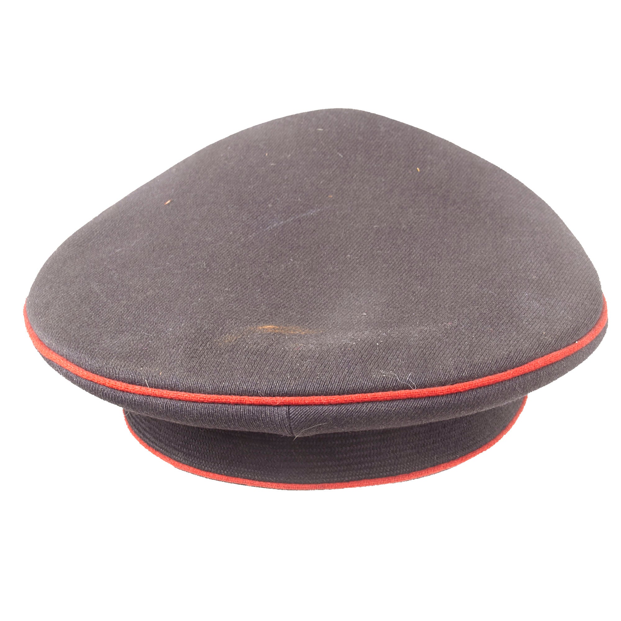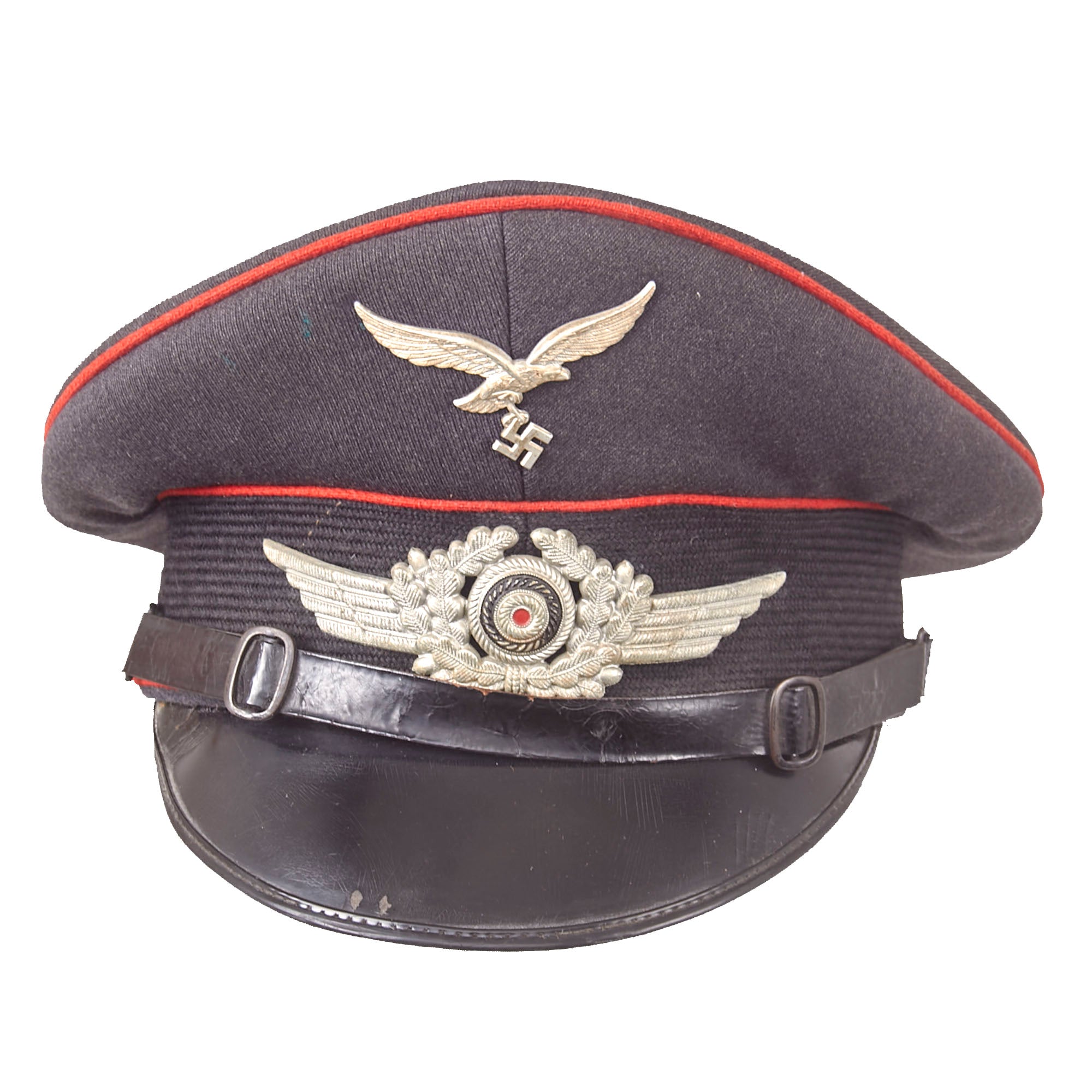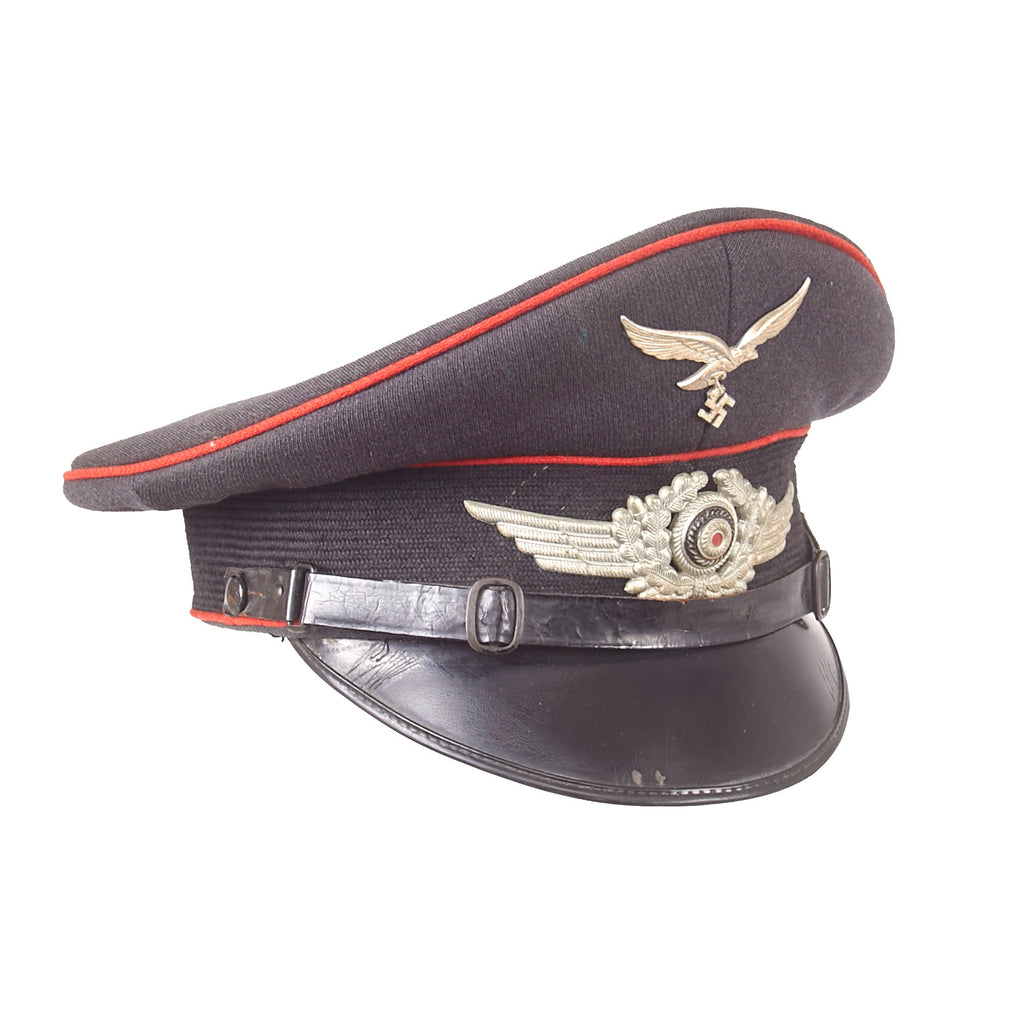 Original Item: Only One available. This is a lovely condition Luftwaffe Flak Artillery EM/NCO Schirmmütze Visor Cap, which is size marked 57 on the underside of the sweatband. This wonderful honest example is an original high quality manufactured cap, and still has the original crown support stiffener ring, so the sides of the crown have not slumped down over the years. It has a lovely relaxed look that looks great. It is fabricated in Luftwaffe blue gray Fliegerblau ( Flier's Blue) "whipcord" weave wool gabardine, with wide black ribbed wool cap band, plus three rows of deep red (tiefrot) color piping around the circumference. This is the Luftwaffe Waffenfarbe (corps color) for Anti-aircraft troops and other Artillery.