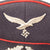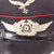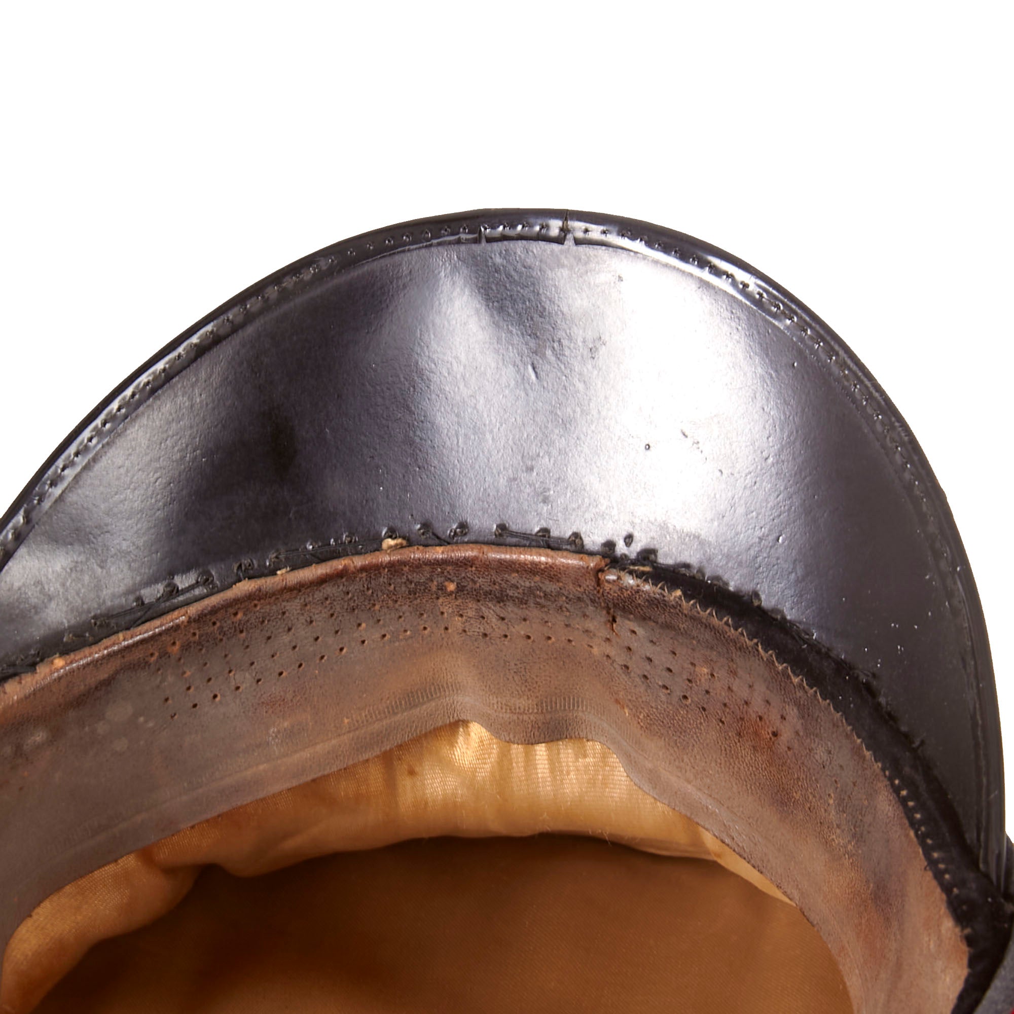 The peak visor cap retains an excellent, high quality, aluminum pin Luftwaffe eagle with swas, and an aluminum oak leaf wreath with stylized wings and central painted tri-color cockade on the band. These show some light oxidation to the exterior, and the paint on the cockade is a bit worn, but they still look great. The chinstrap and buttons are still present and in very good condition, though there is some chipping to the finish of the buttons, which happens over time. The leather also shows some "melting" and cracking to the finish, which is typical age related degradation. The visor looks to be made of pressed paper or some variety of vulcanfibre, and has a love pattern of checking and crazing due to age. The underside is black in color, and the original edge trim is fully present, however it has some cracking and the stitching on the center has pulled out. We can see that some of the stitching holding it in place has been redone, and it is relatively loosely attached to the body.