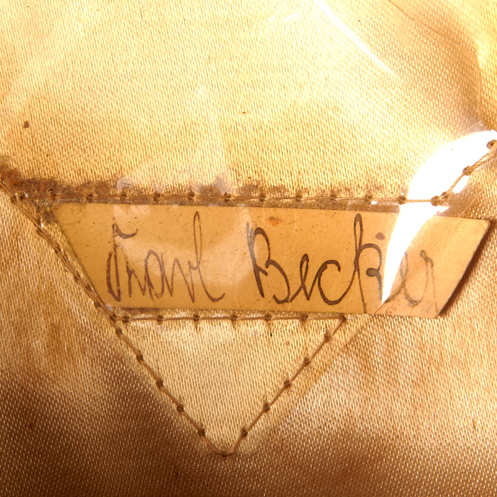 The inside of the cap is lined with lovely cream colored rayon faux silk, which shows only light staining. The original celluloid sweat shield diamond is still mostly present, however it has cracked in several places, with part towards the rear missing. There is no maker logo, but we can see remnants of Stirndruckfrei / Deutschesreichspatent (forehead pressure free - German Patent) on the surface of the remnants. There is a paper label in the name tag slot, which looks to read Karl Becker. The sweatband is made of gray finished leather, and is in very good condition considering the age, showing wear and staining from use, with only a small tear on the forehead vent area. The stitching holding it in place has degraded a bit.