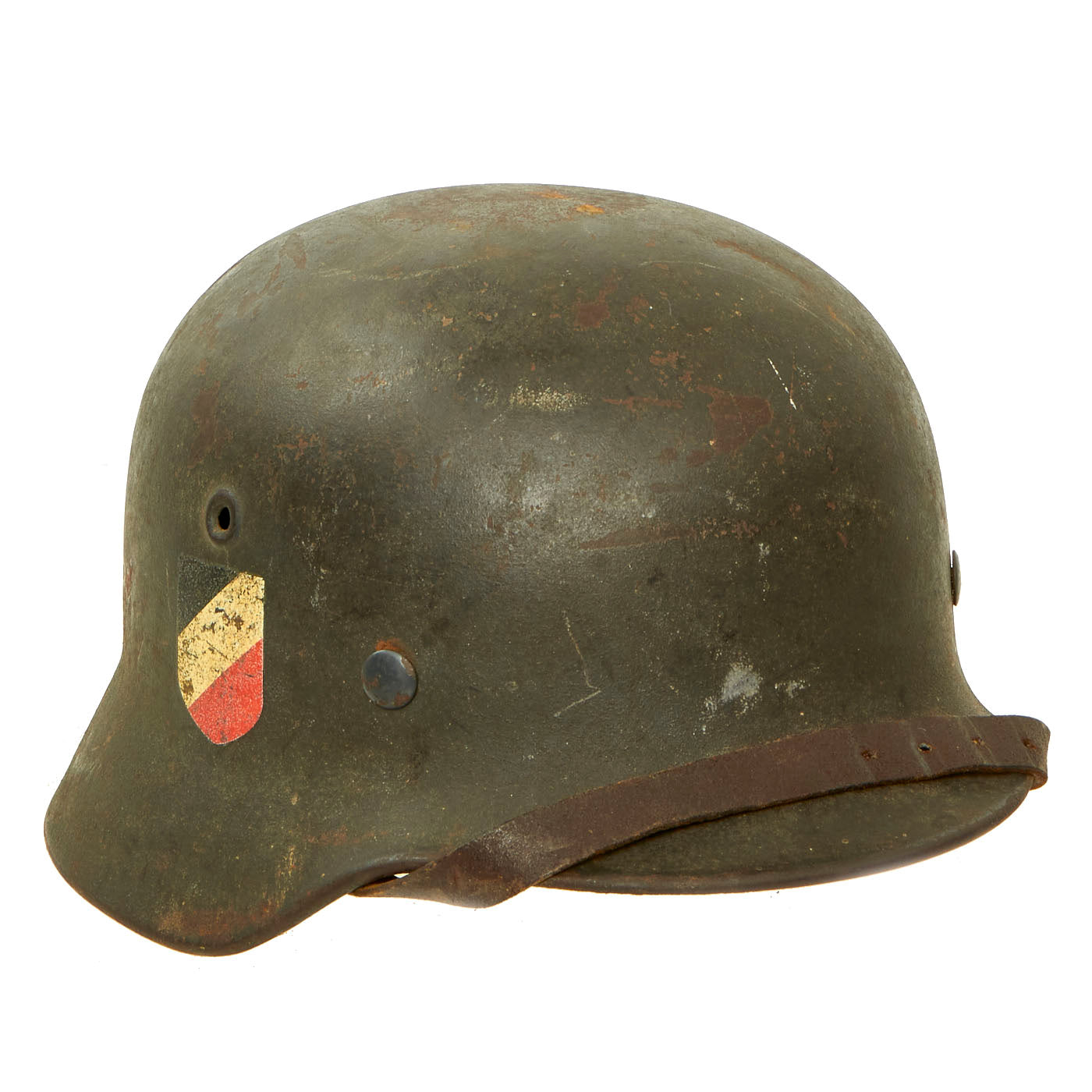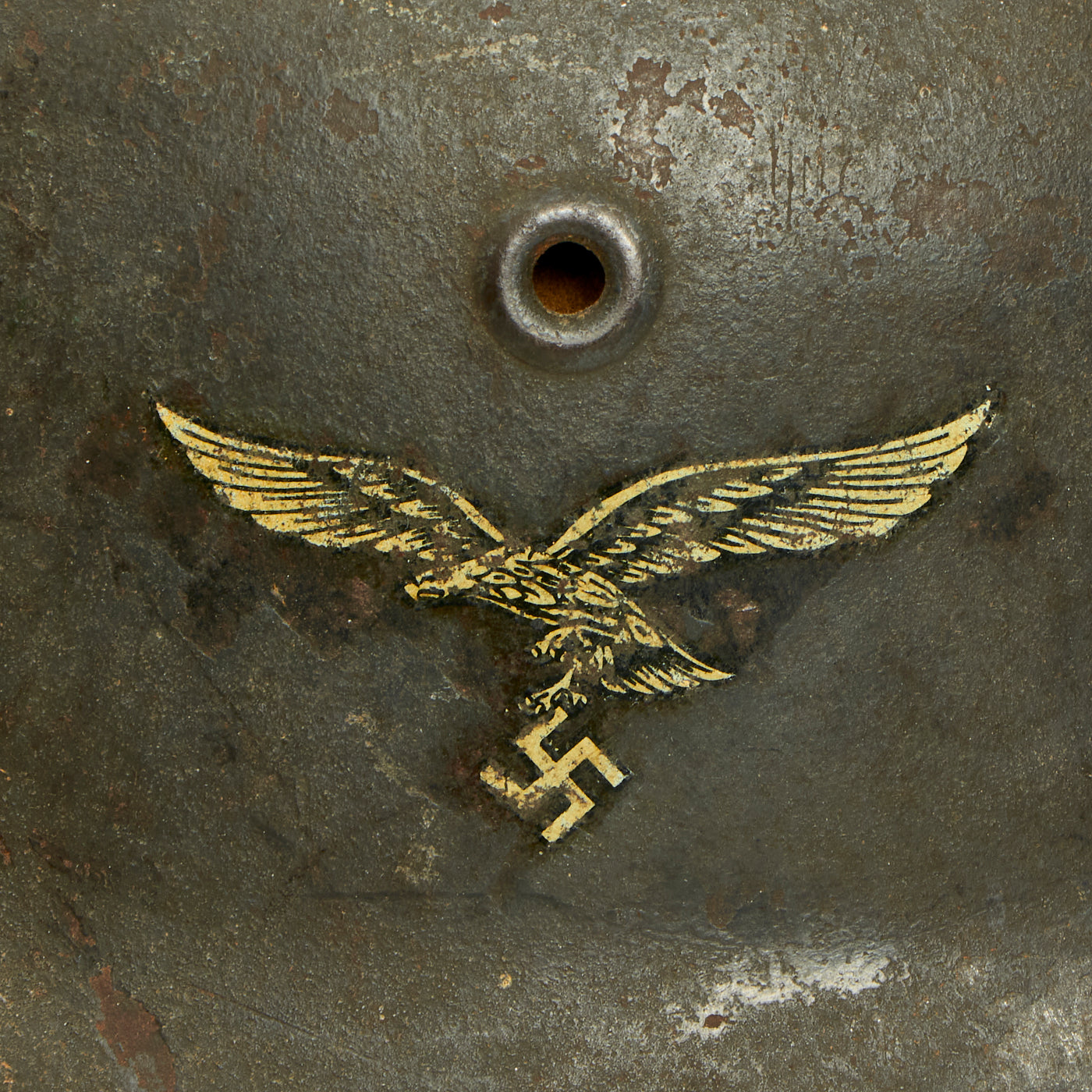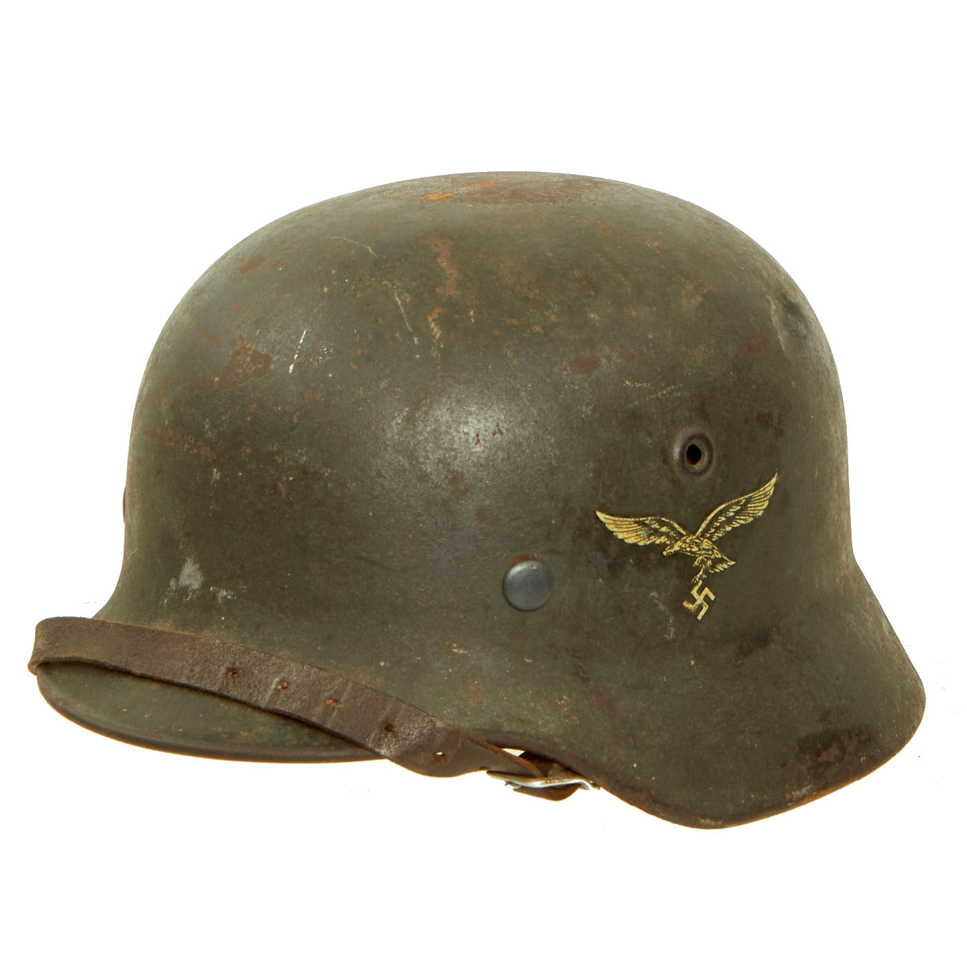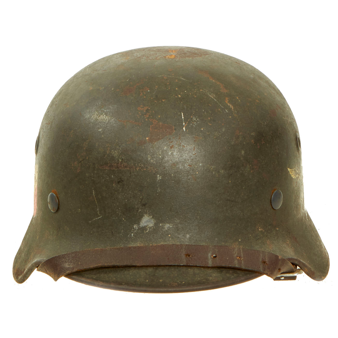 Original Item: Only One Available. This is a very nice all original example Model 1935 German WWII "double decal" helmet with a Luftwaffe Eagle decal on the left side, and a "National Colors" decal on the right. The use of the second decal was discontinued in 1940, and in 1943 it was ordered that helmets with the national colors have them removed, so finding a helmet with both still intact is a real treat!