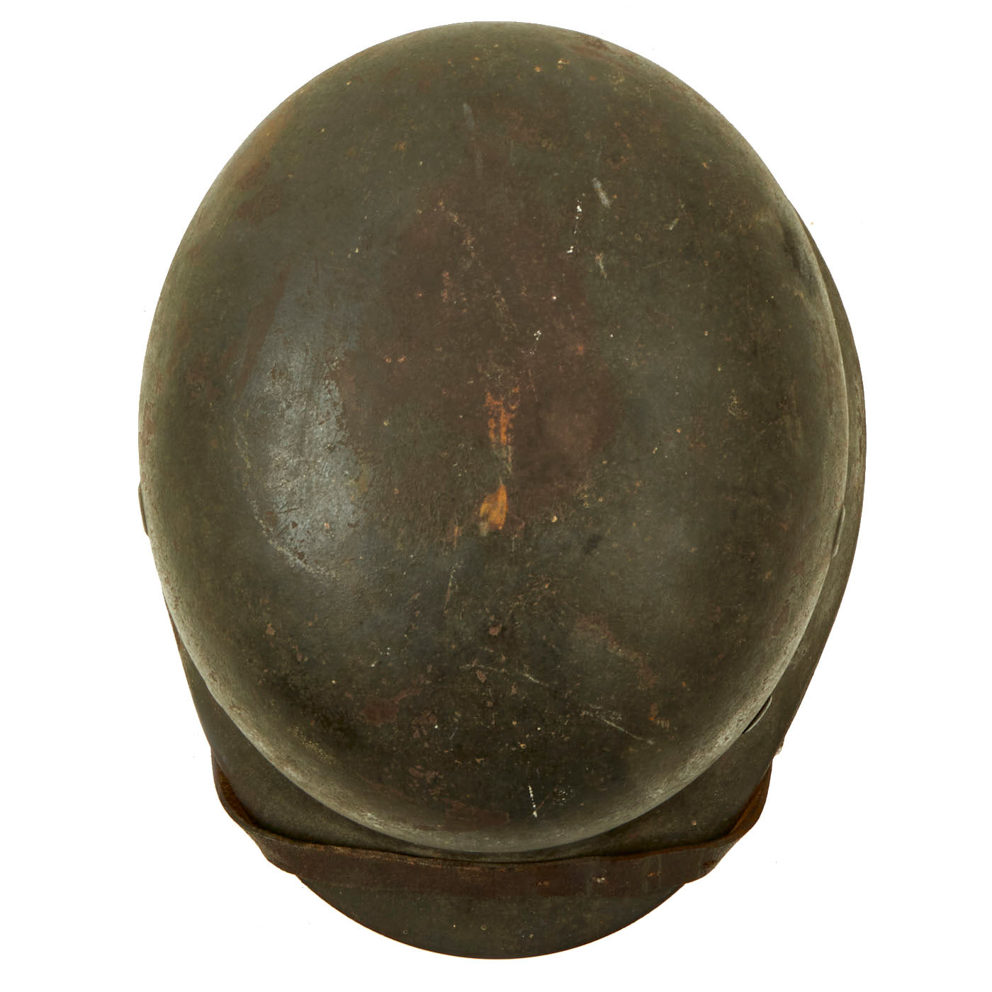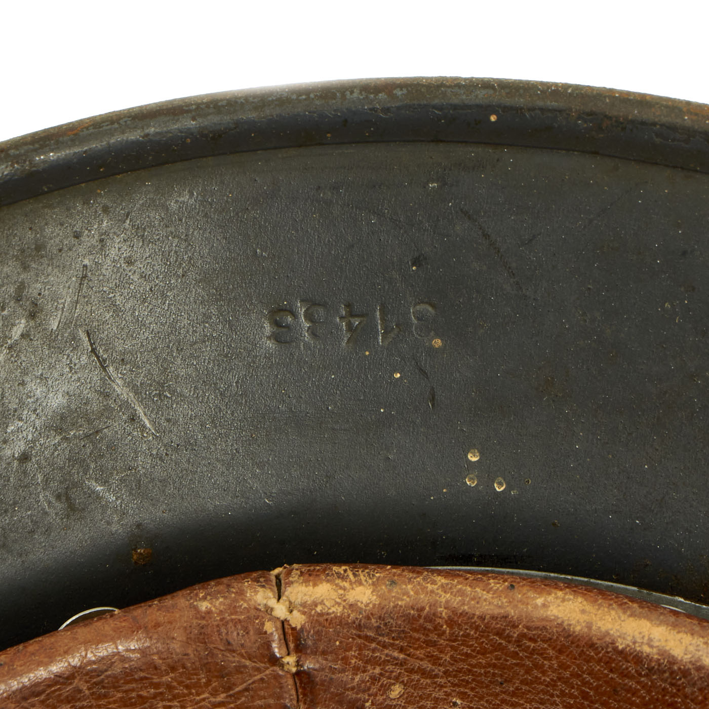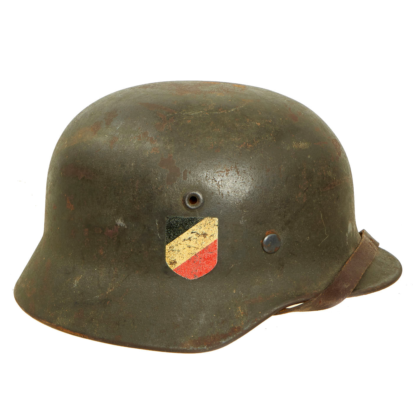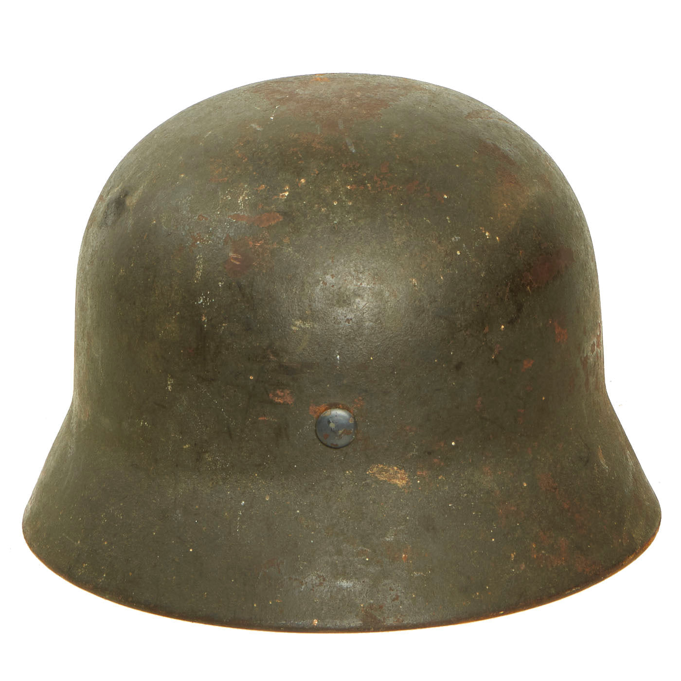 Original Item: Only One Available. This is a very nice all original example Model 1935 German WWII "double decal" helmet with a Luftwaffe Eagle decal on the left side, and a "National Colors" decal on the right. The use of the second decal was discontinued in 1940, and in 1943 it was ordered that helmets with the national colors have them removed, so finding a helmet with both still intact is a real treat!