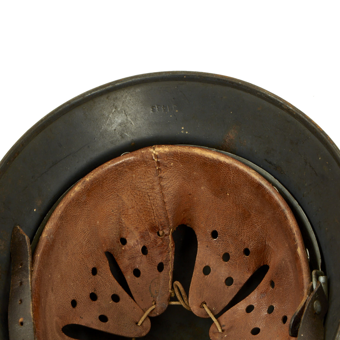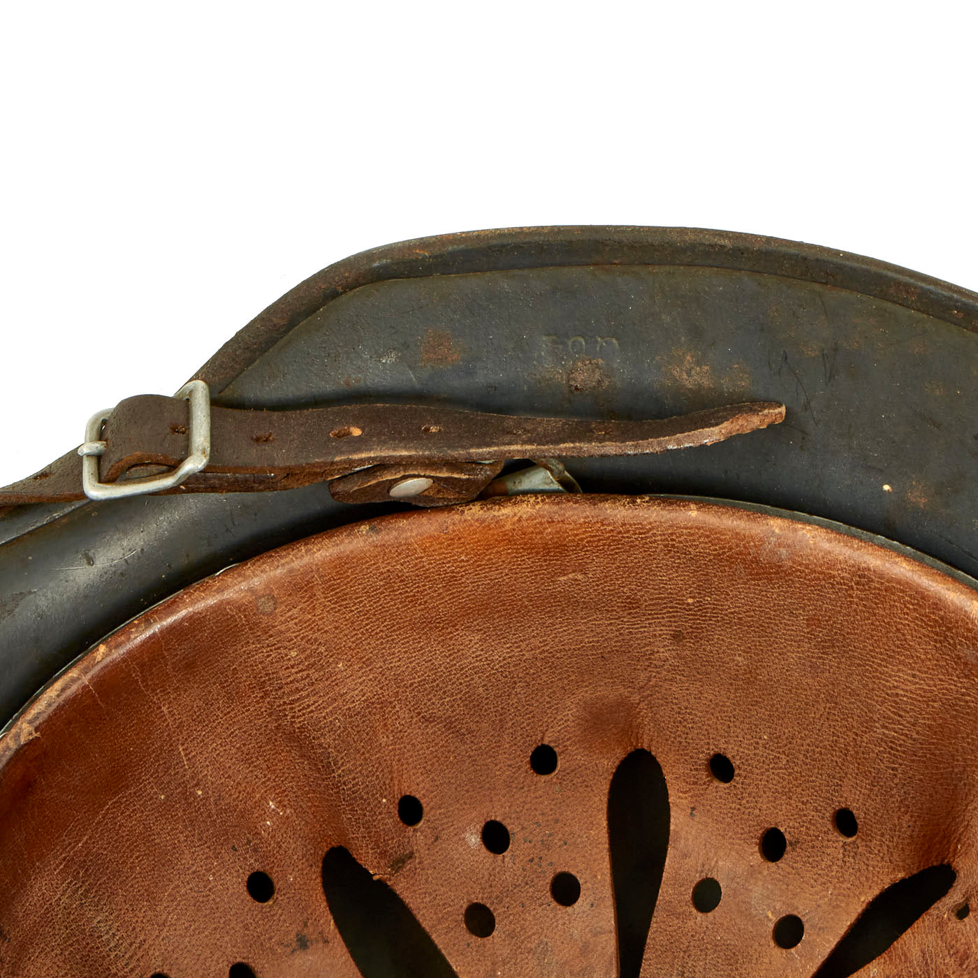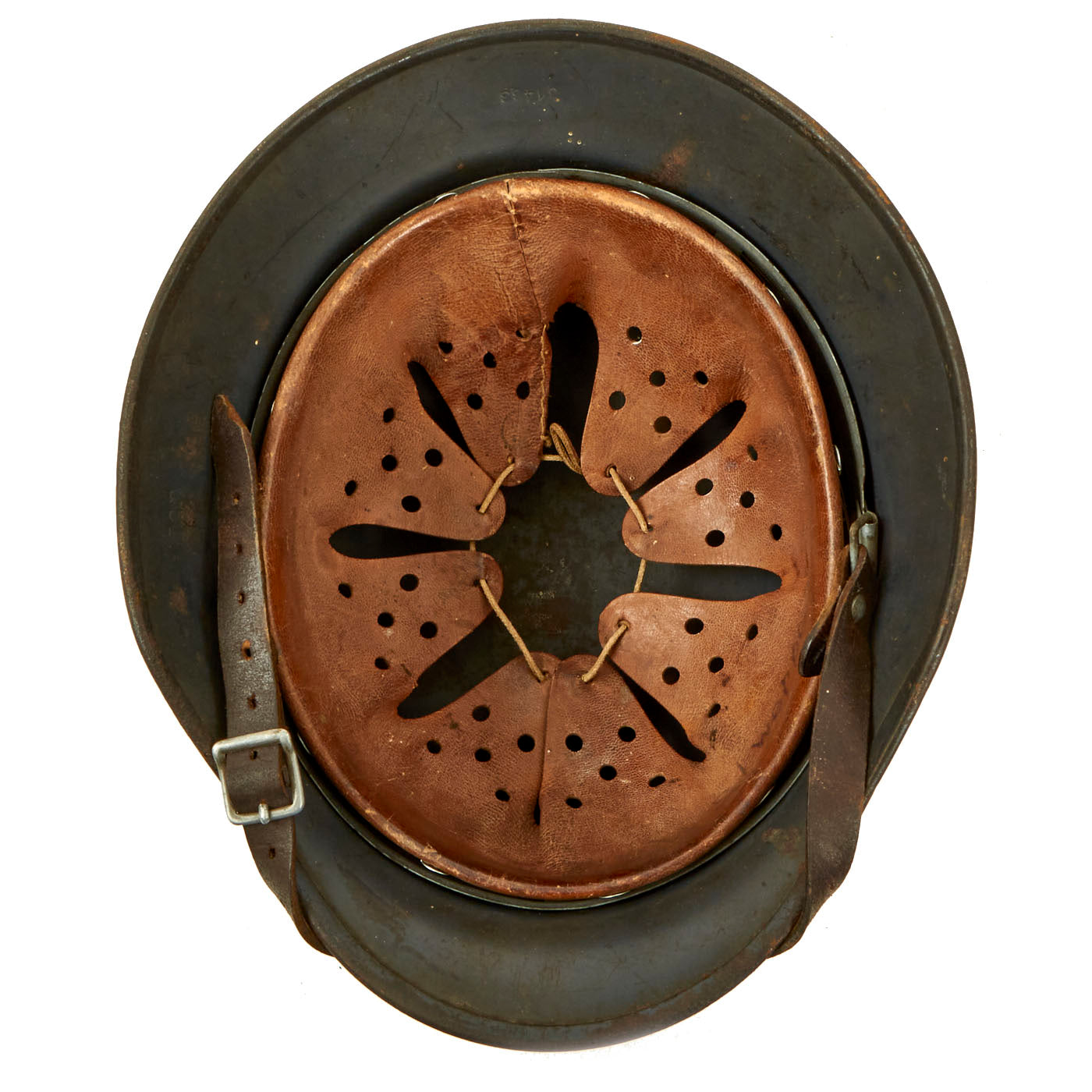 This stamped sheet steel construction helmet retains about 80% of the original lightly textured blue-gray Luftwaffe fliegerblau (flyer's blue), and is in very good condition overall. It is possible that it originally had a smooth exterior paint job, and was overpainted, as the interior is smooth. There is light overall wear and scuffing, and the top of the helmet has an area about 2" x 3" where most of the paint is missing, which has allowed the shell to oxidize. There are however no major dents or damage. The National Colors decal is retained at about 80%, with checking from age and some wear, as well as some chips and scrapes. The Luftwaffe decal is retained at about 65%, with overall wear with some flaking, and a great off white color. They have a lovely service worn look.