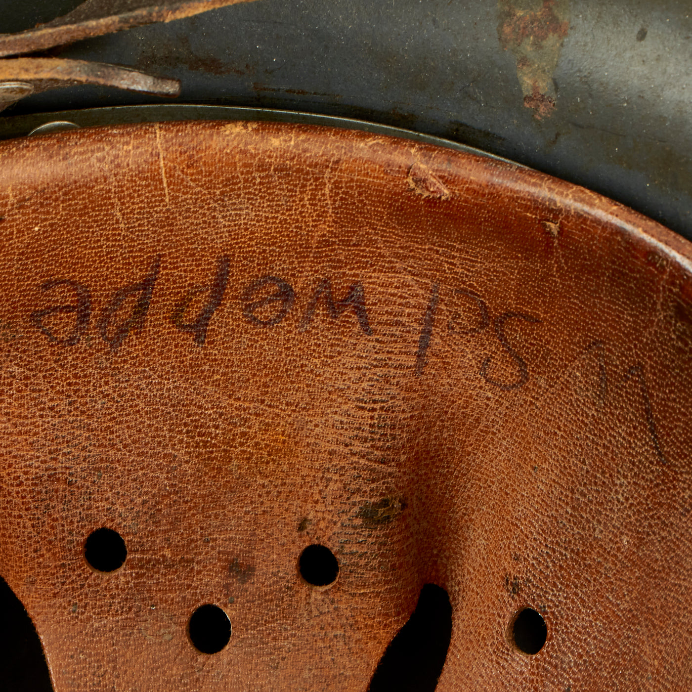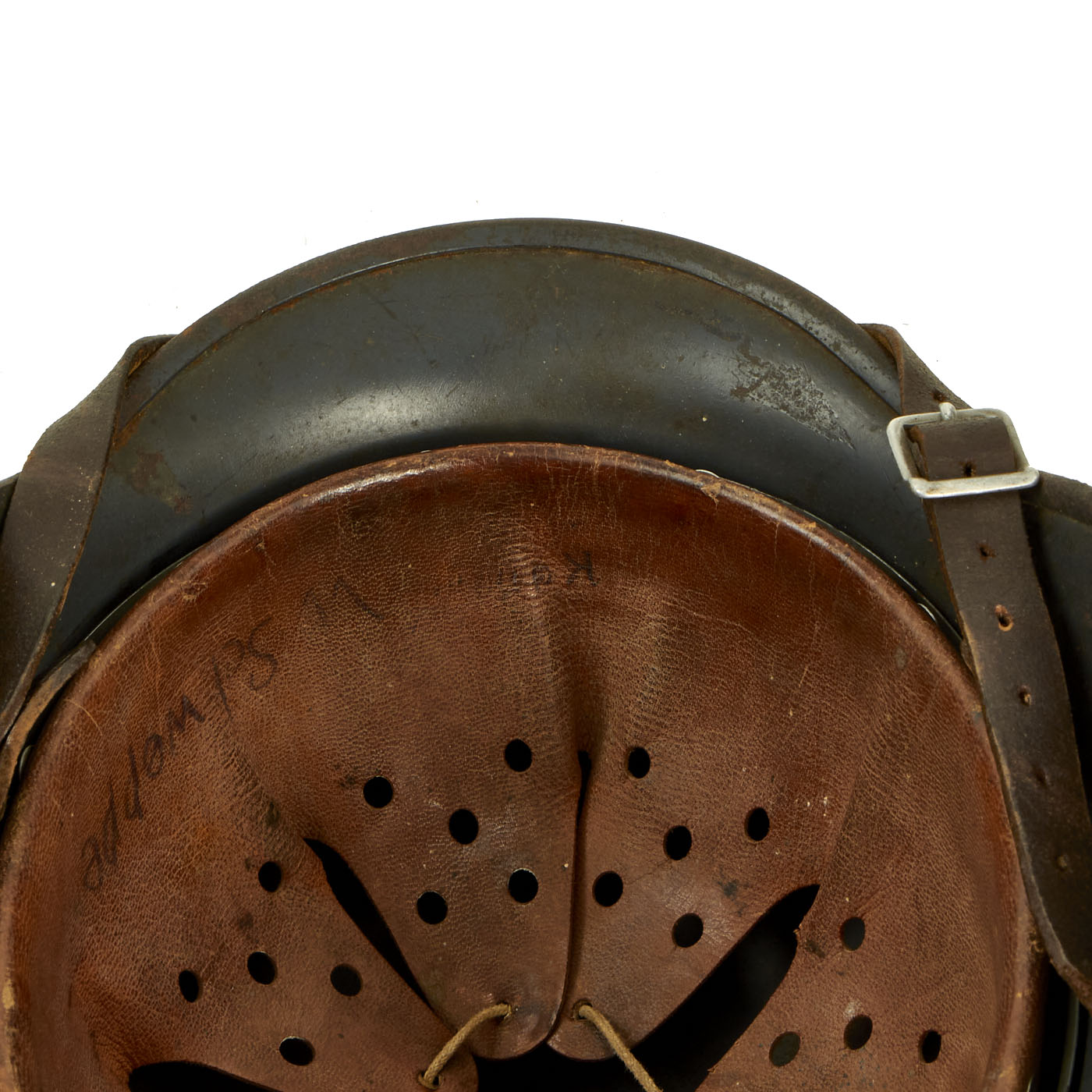 This date is exactly what we would expect on a double decal helmet with a transitional type paint job. The attached chinstrap is in very good condition, and is maker marked KLOPFER. It has an aluminum buckle with aluminum attachment studs, so it is definitely correct for the 1940 period, as they were changing over from aluminum to steel fittings.
