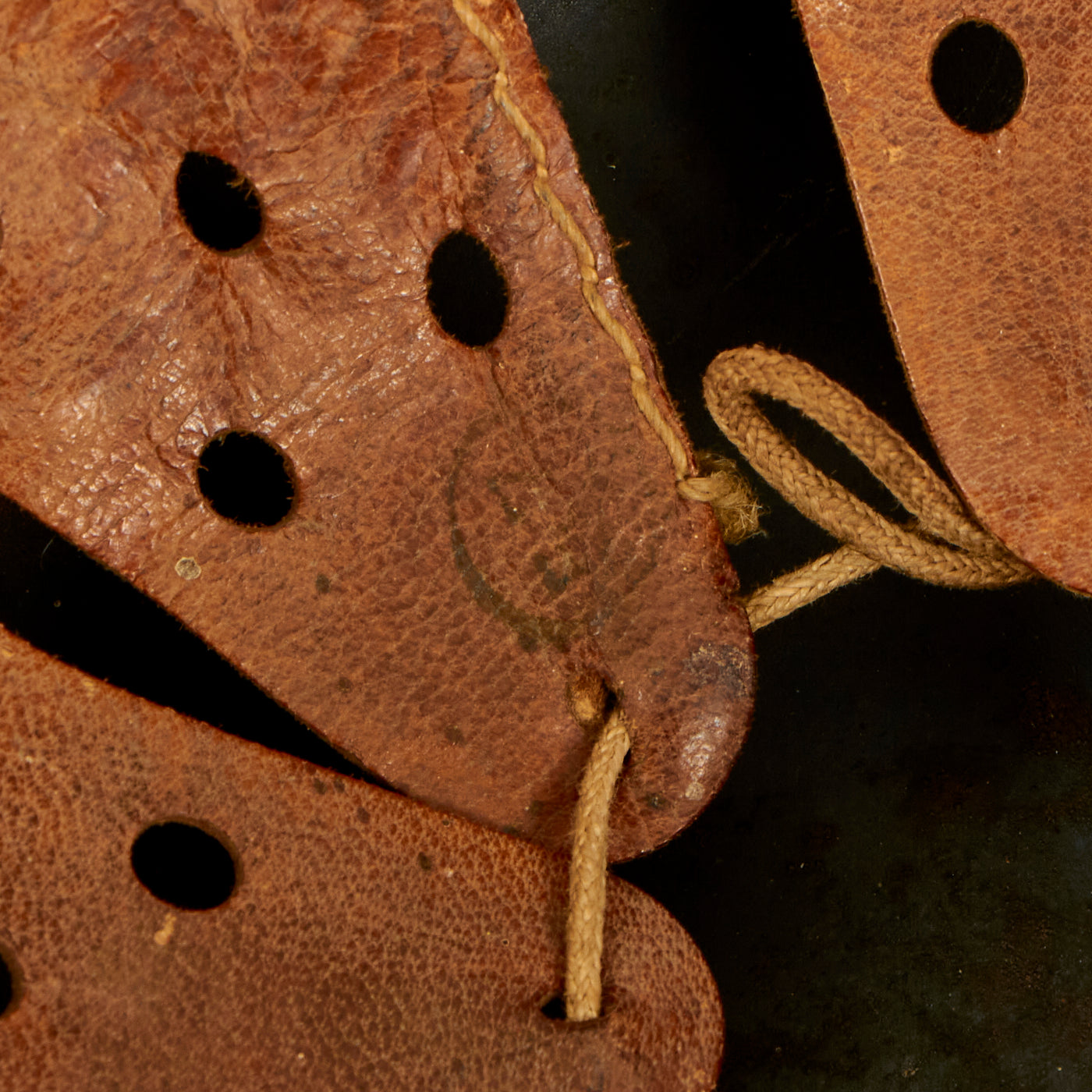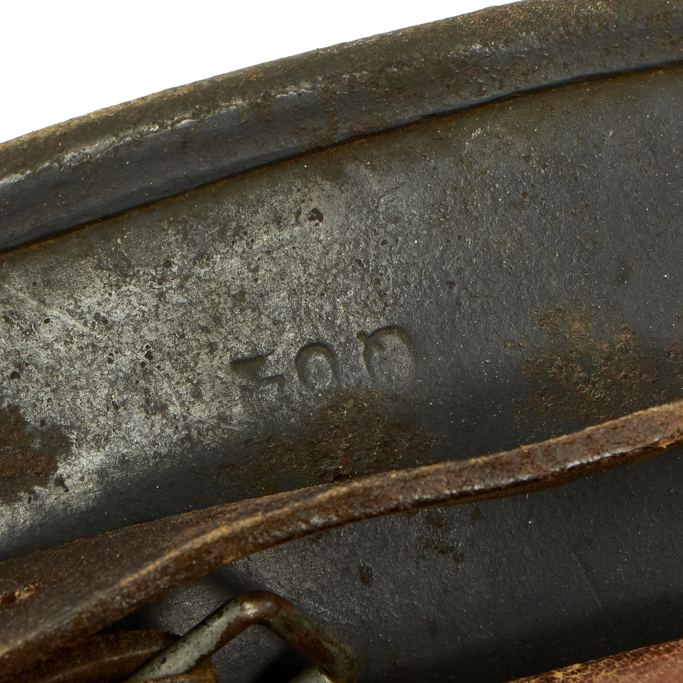 The reverse, interior, neck guard apron is serial number stamped 31433 and the interior, left side, apron has the stamped manufacturer's code and size, Q64 indicating that it was manufactured by F.W. Quist G.m.b.H. in the German city of Esslingen. Size 64 is a nice smaller size that can accommodate liners from 56cm to 57cm or US 7 to 7 1/8. Size 64 shells are harder to find and are therefore more valuable to a collector.