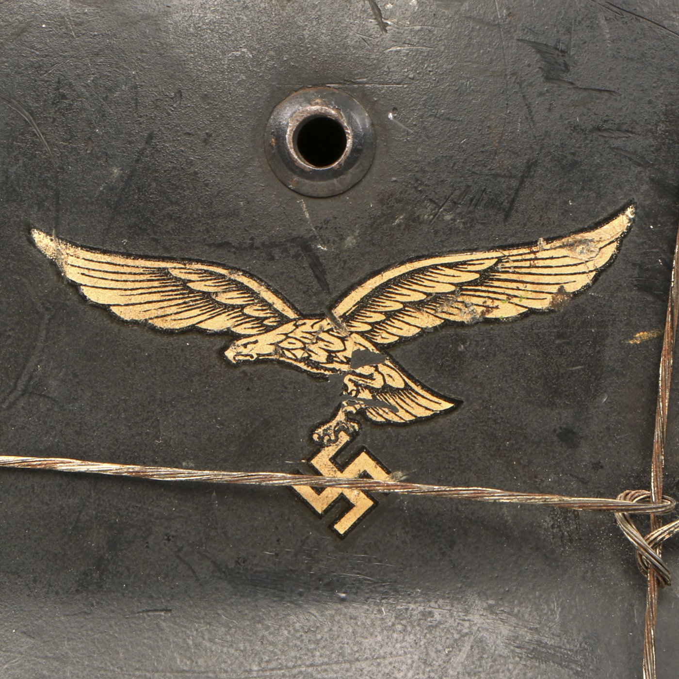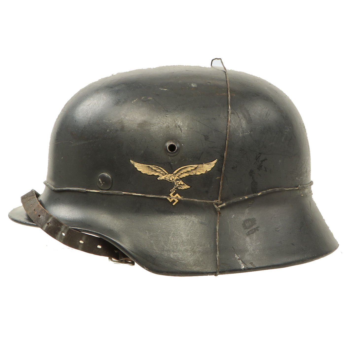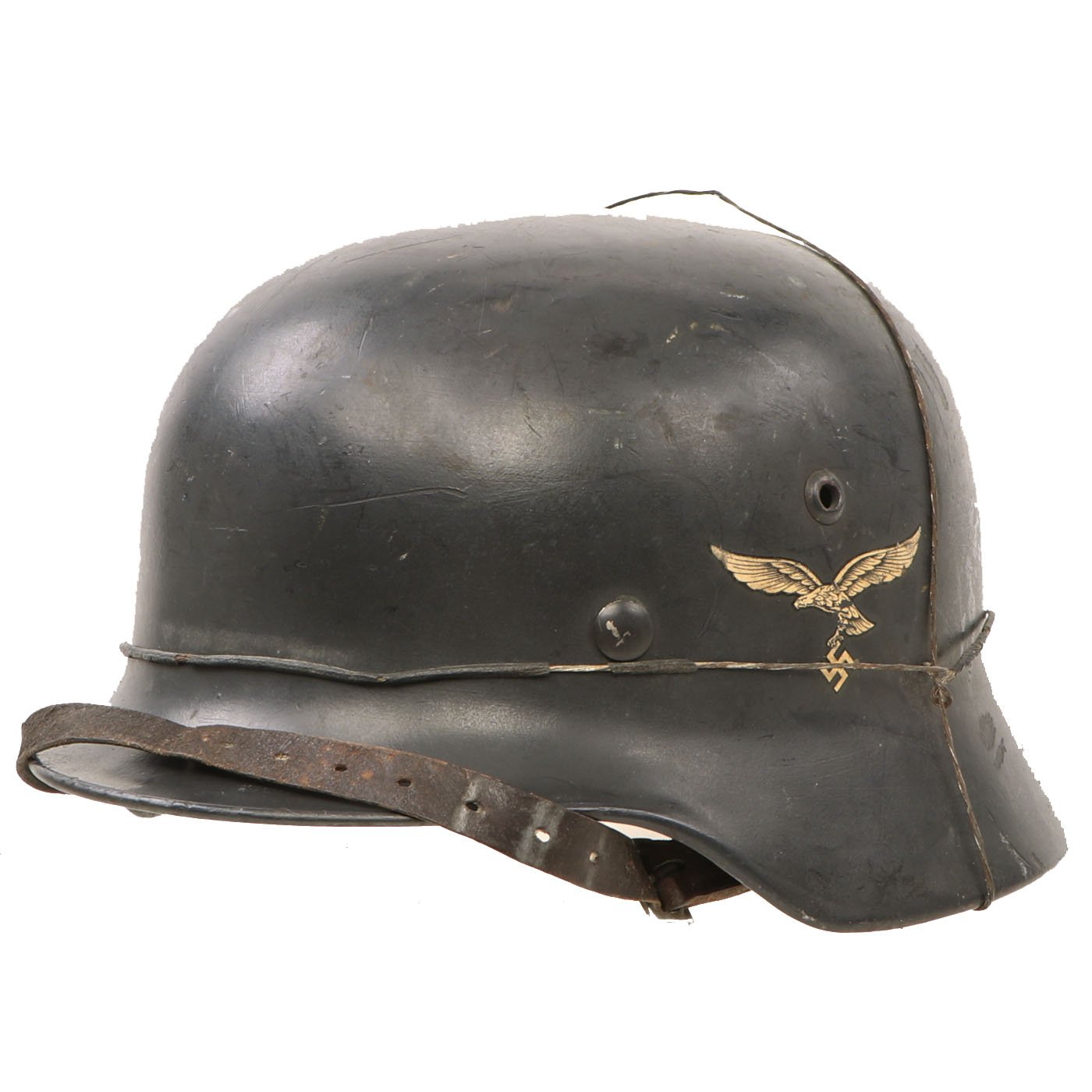 Original Item: Only One Available. This is a great lightly used all original example Model 1935 German WWII "single decal" helmet, with a Luftwaffe Eagle decal on the left side, and wire wrapping for attachment of camouflage material. This wire was originally coated, but most has worn off. Also, the right side of the helmet clearly shows that it had a "National Colors" decal, which was removed, so this was originally a "double decal" helmet, correct for early war issue. The use of the second decal was discontinued in 1940, and in 1943 it was ordered that helmets with the national colors have them removed, which is why this helmet no longer has one.
