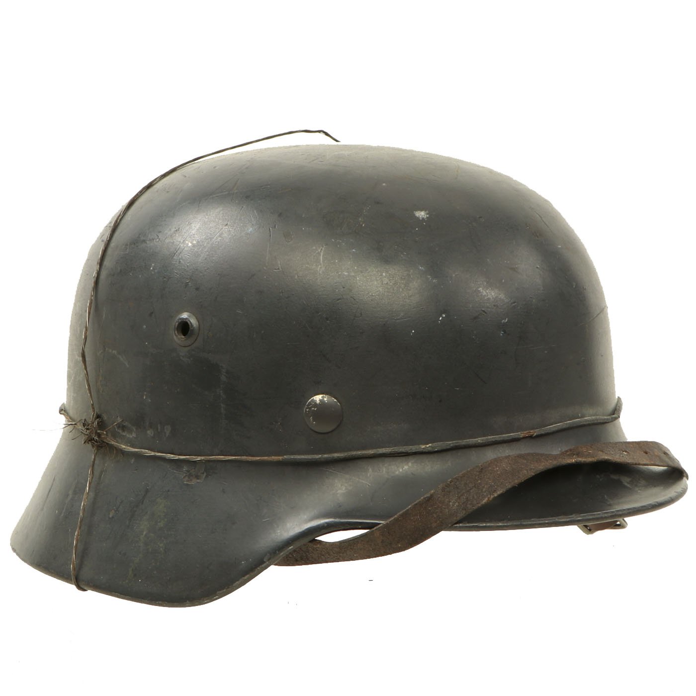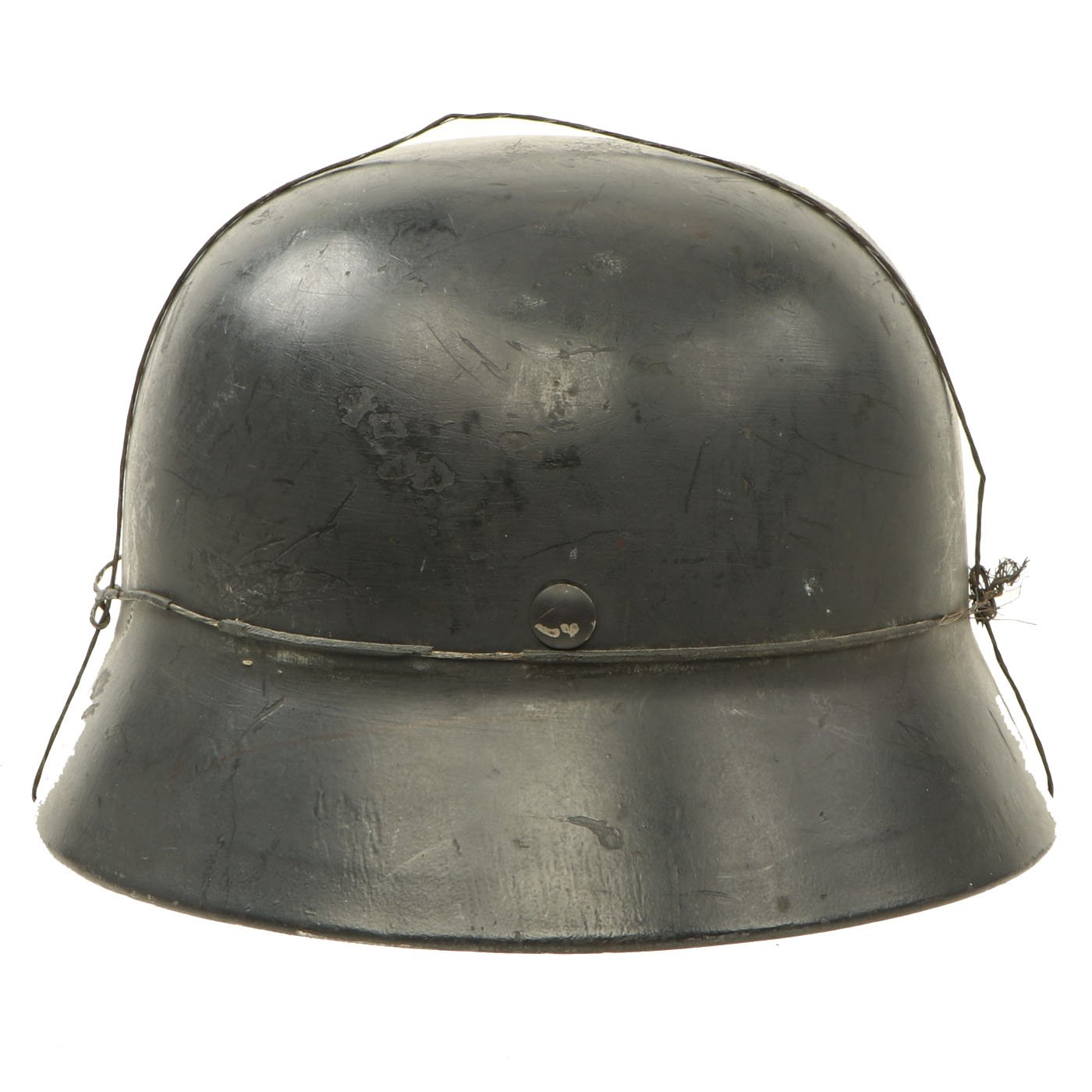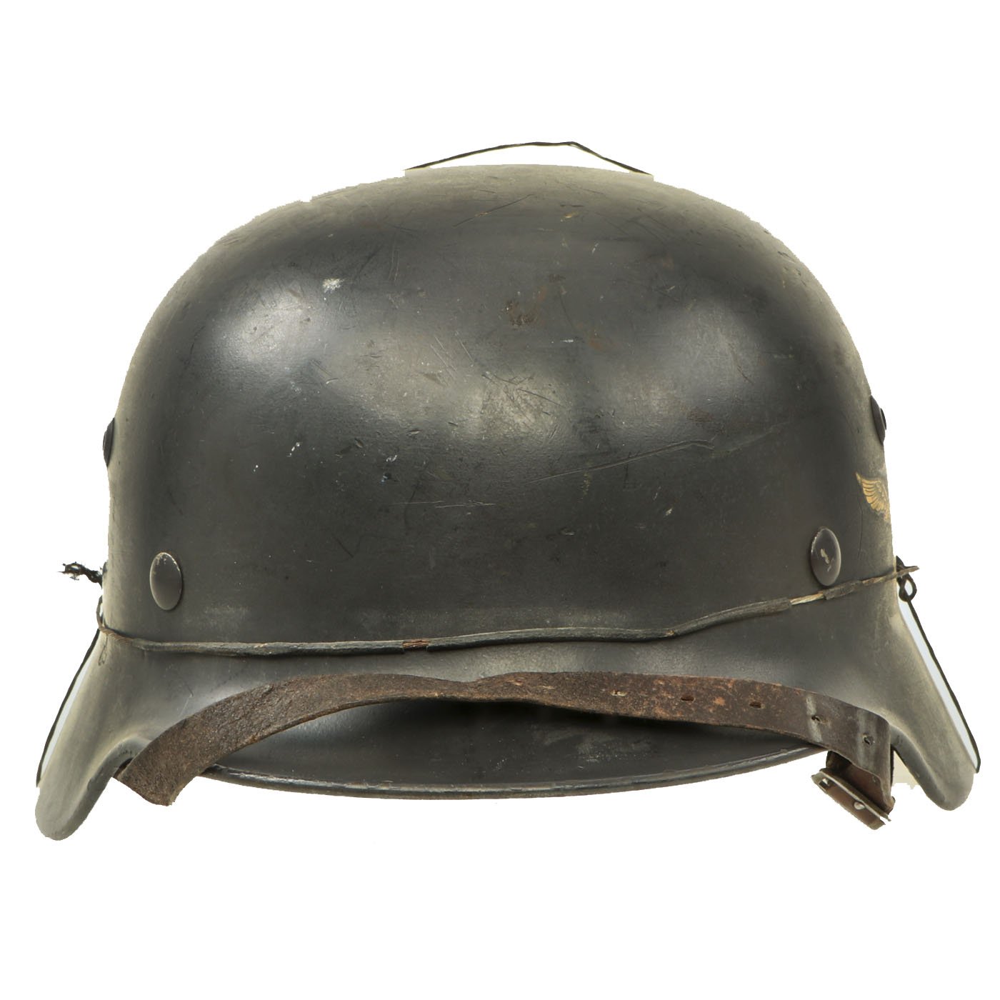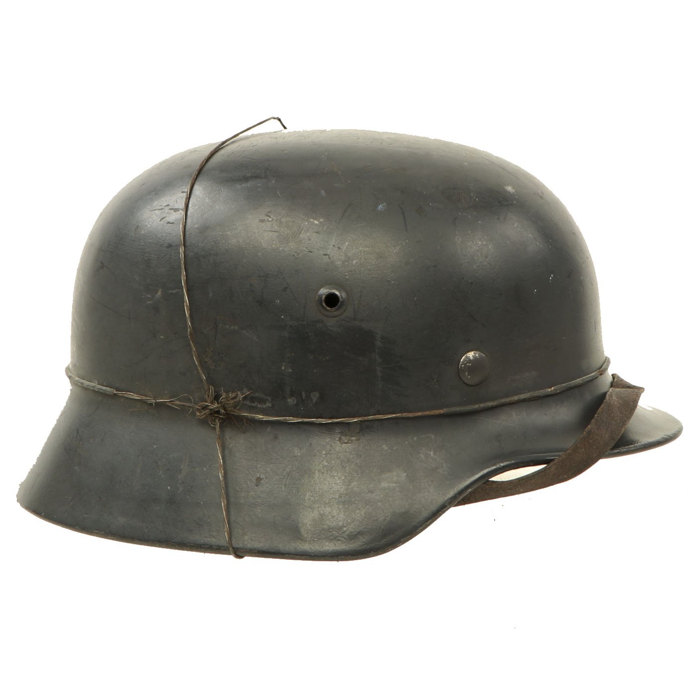 Original Item: Only One Available. This is a great lightly used all original example Model 1935 German WWII "single decal" helmet, with a Luftwaffe Eagle decal on the left side, and wire wrapping for attachment of camouflage material. This wire was originally coated, but most has worn off. Also, the right side of the helmet clearly shows that it had a "National Colors" decal, which was removed, so this was originally a "double decal" helmet, correct for early war issue. The use of the second decal was discontinued in 1940, and in 1943 it was ordered that helmets with the national colors have them removed, which is why this helmet no longer has one.