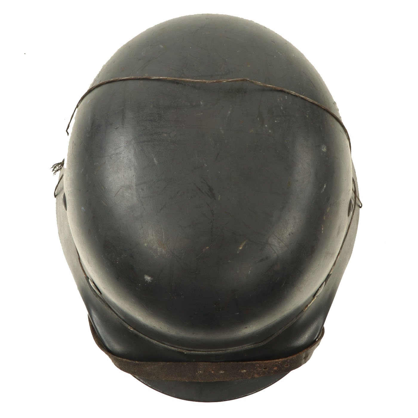 The chin strap is present, though it is definitely worn and somewhat delicate. It has the correct aluminum securing studs and buckle, so it is most likely original to the helmet. It is maker marked by PAUL KLOPFER, however we cannot make out the rest of the marking.
