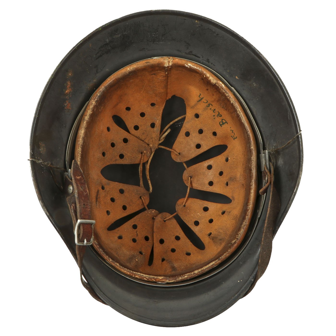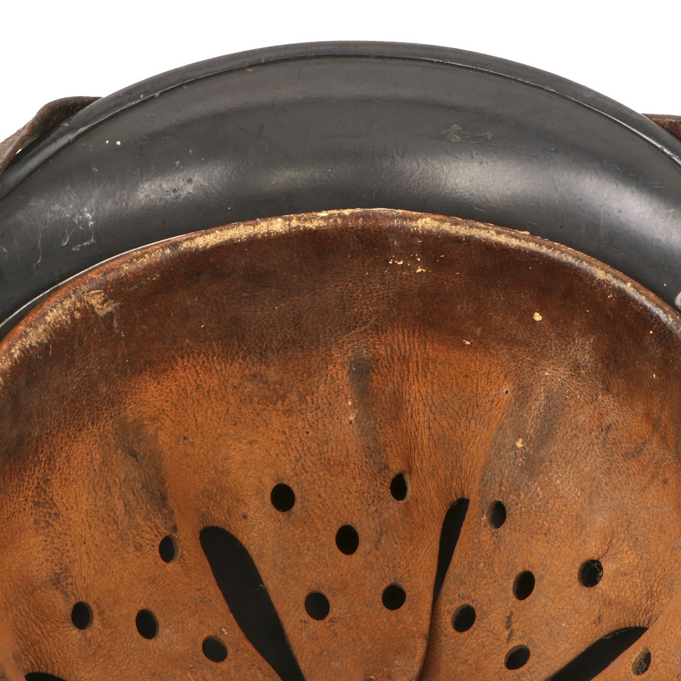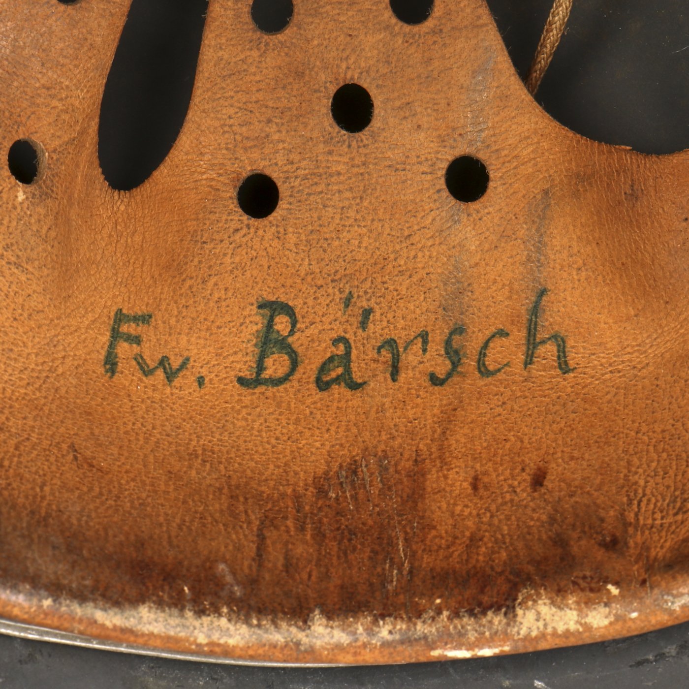 The helmet still has its correct very good condition M31 liner with all of the 8 fingers present and supple. The liner also still has its original size adjustment string, and overall there is only light wear do the liner, as with the rest of the helmet. It is also named on the liner to Fw. Bärsch, with "Fw" standing for Feldwebel, a Luftwaffe NCO rank equivalent to a U.S. Technical Sergeant.