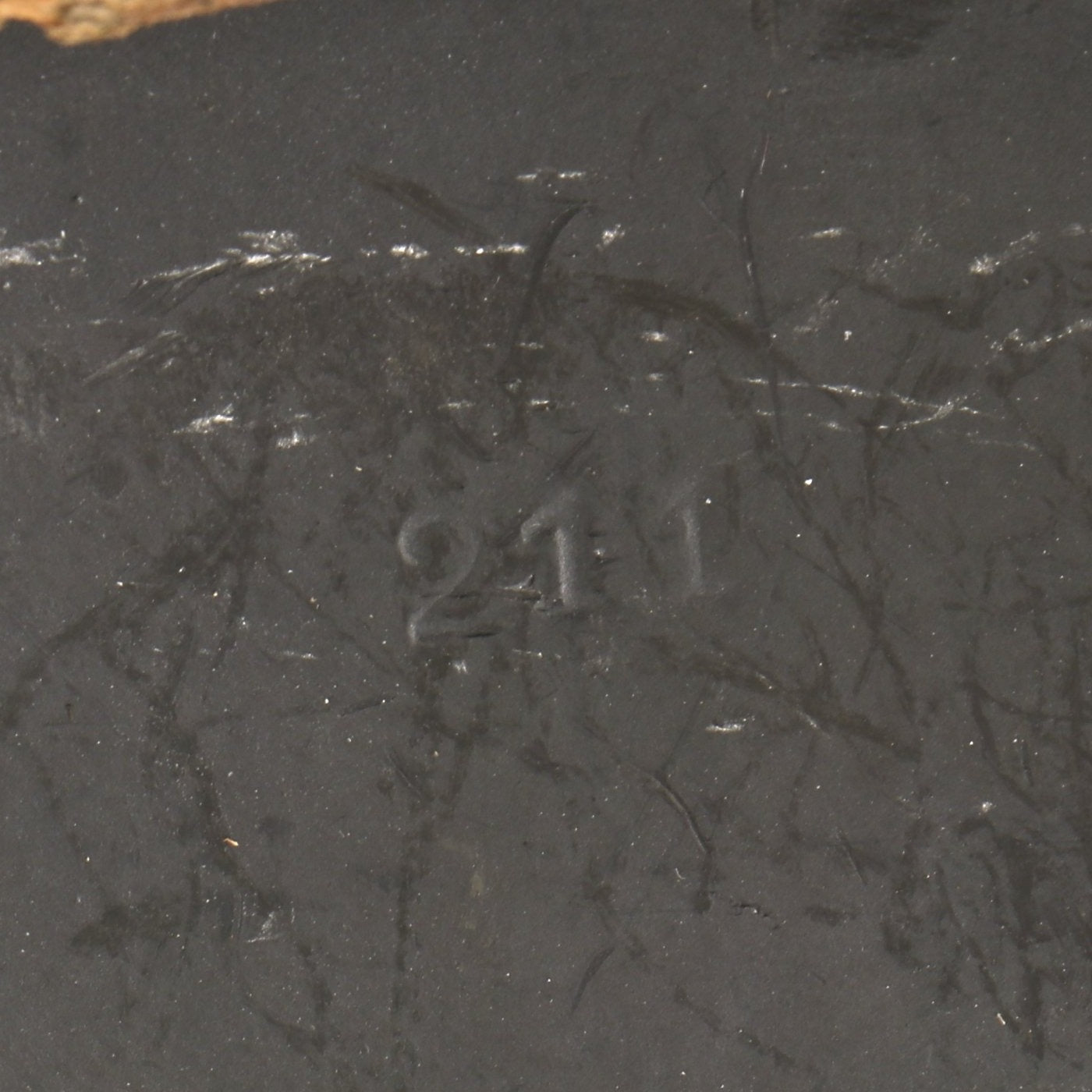 The reverse, interior, neck guard apron is serial number stamped 211 and the interior, left side, apron has the stamped manufacturer's code and size, Q66 indicating that it was manufactured by Quist in the German city of Esslingen. Size 66 is a nice large size that can accommodate liners from 58cm to 59cm or US 7 1/4 to 7 3/8. Size 66 shells are the hardest to find and are therefore more valuable to a collector.