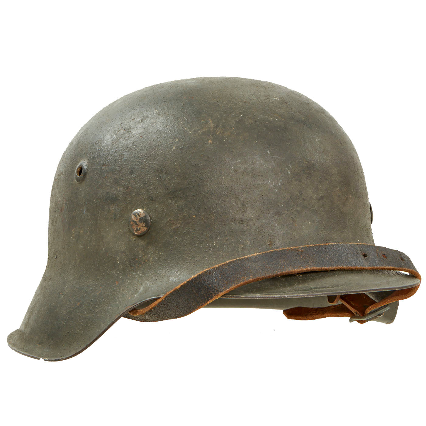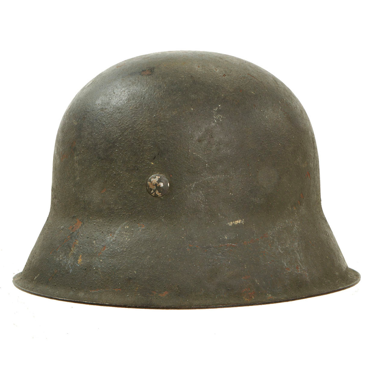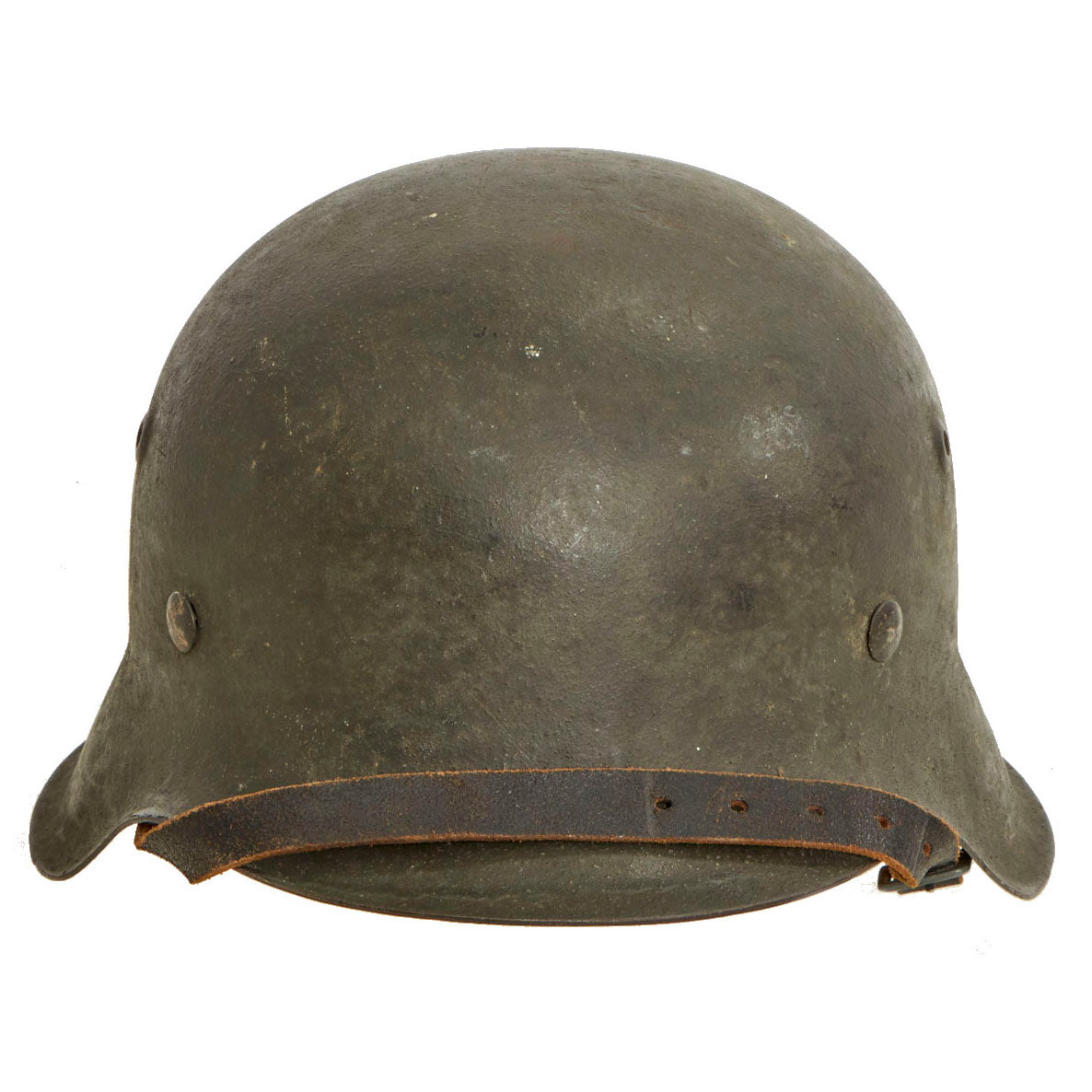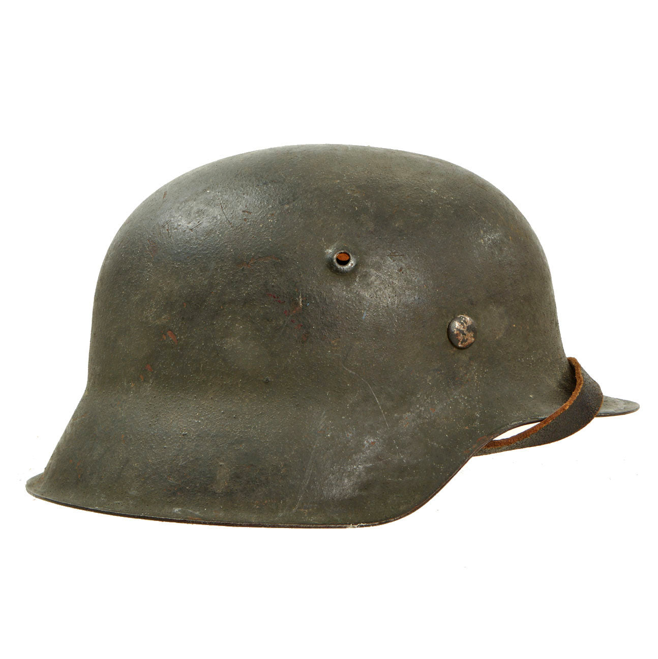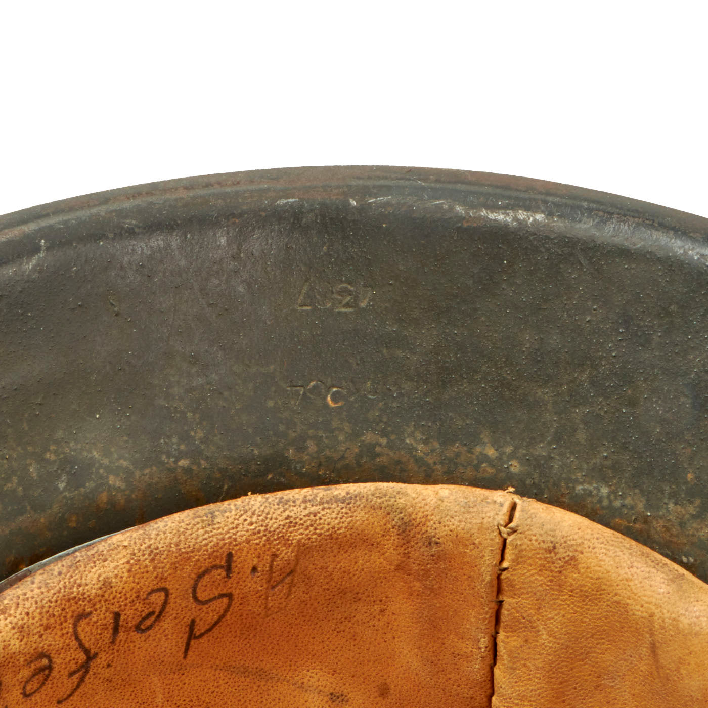 Original Item: Only One Available. This is a very nice original example of a named and complete German Model 42 Steel helmet, as issued to the Wehrmacht Heer (army). This stamped sheet steel construction helmet retains about 85% of its original paint, with overall wear consistent with use in service. There are some areas where the paint was scuffed or scraped down to the steel, and this helmet also never had a decal applied. This is not uncommon with late war helmets, as sometimes there were no decals available, and the factories needed to make helmets as fast as they could.
