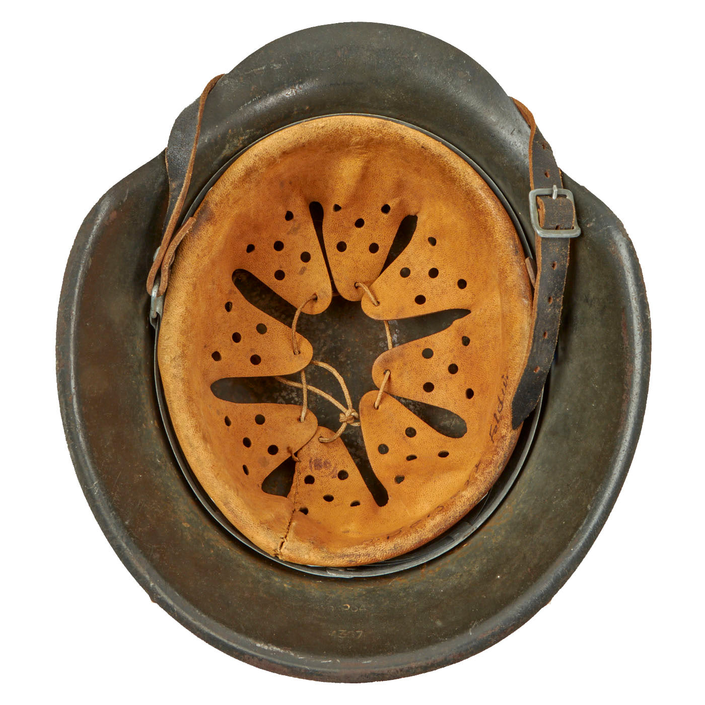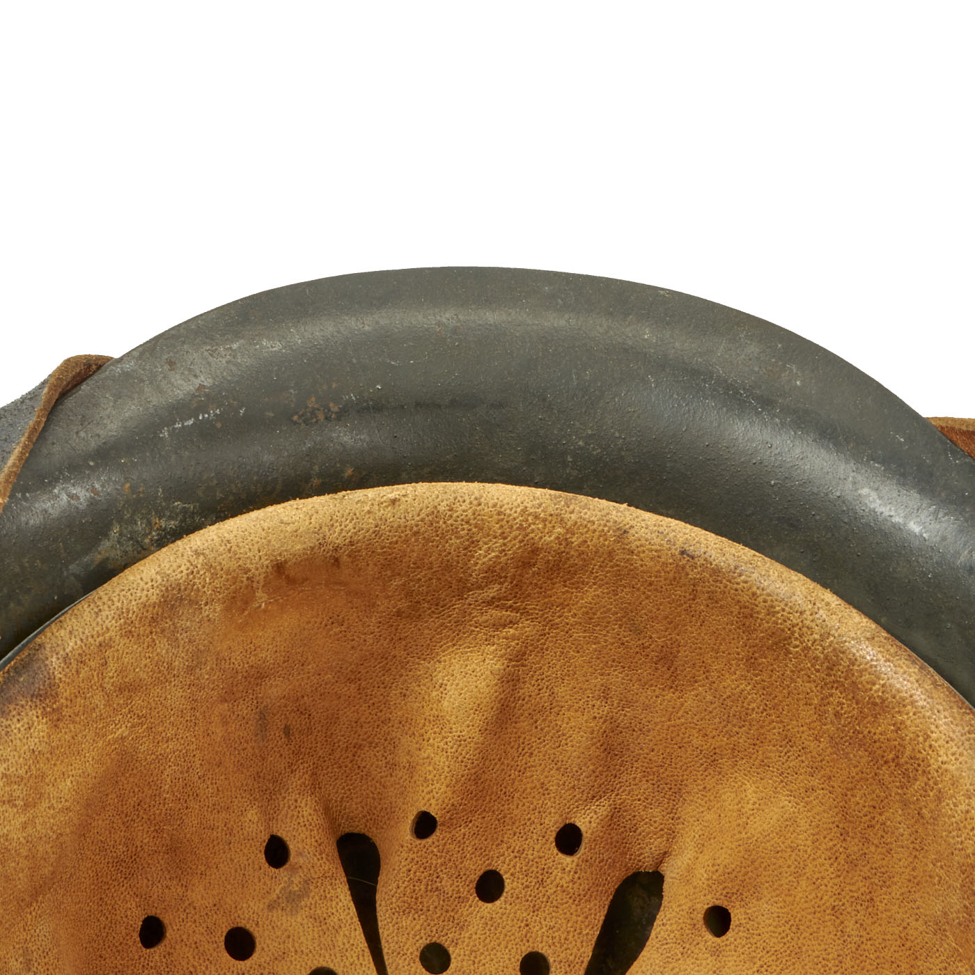 All three liner retaining pins are intact, with the exterior paint well retained on all. The interior of the helmet still has the original M31 leather liner, complete with all 8 fingers with top adjustment string in great condition. There is the expected discoloration of age, but it still has the original 56 marked on it indicating the size. The late war issue galvanized steel liner band is marked on the left outer side with 64 n.A. / 56, indicating that the liner is a size 56, intended for a 64 shell. The right side displays the full manufacture information, as well as a date, though it is very faintly stamped: