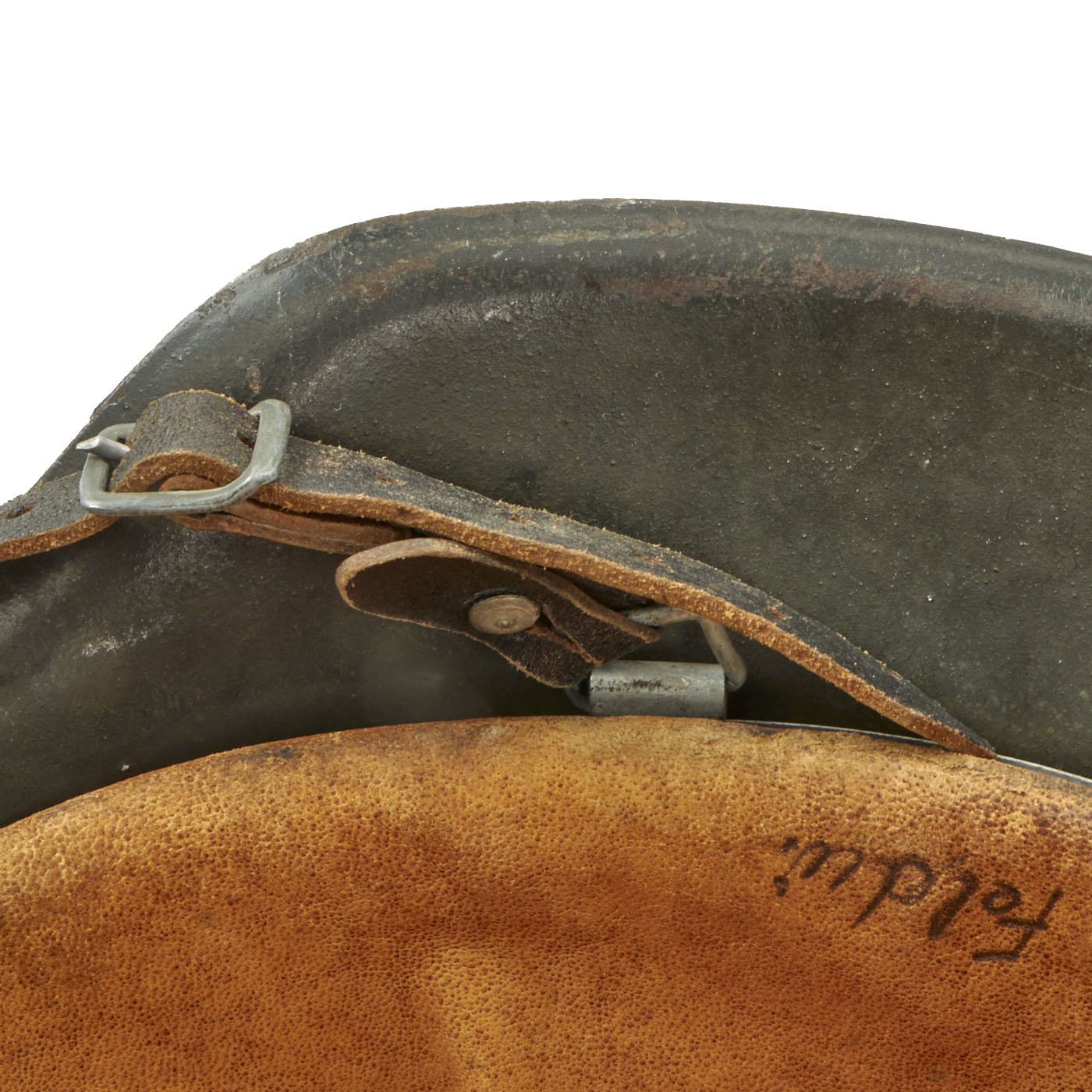 The chinstrap is intact, with the correct buckle and steel securing studs. We were not able to see any maker markings on the leather, which is still in excellent condition.