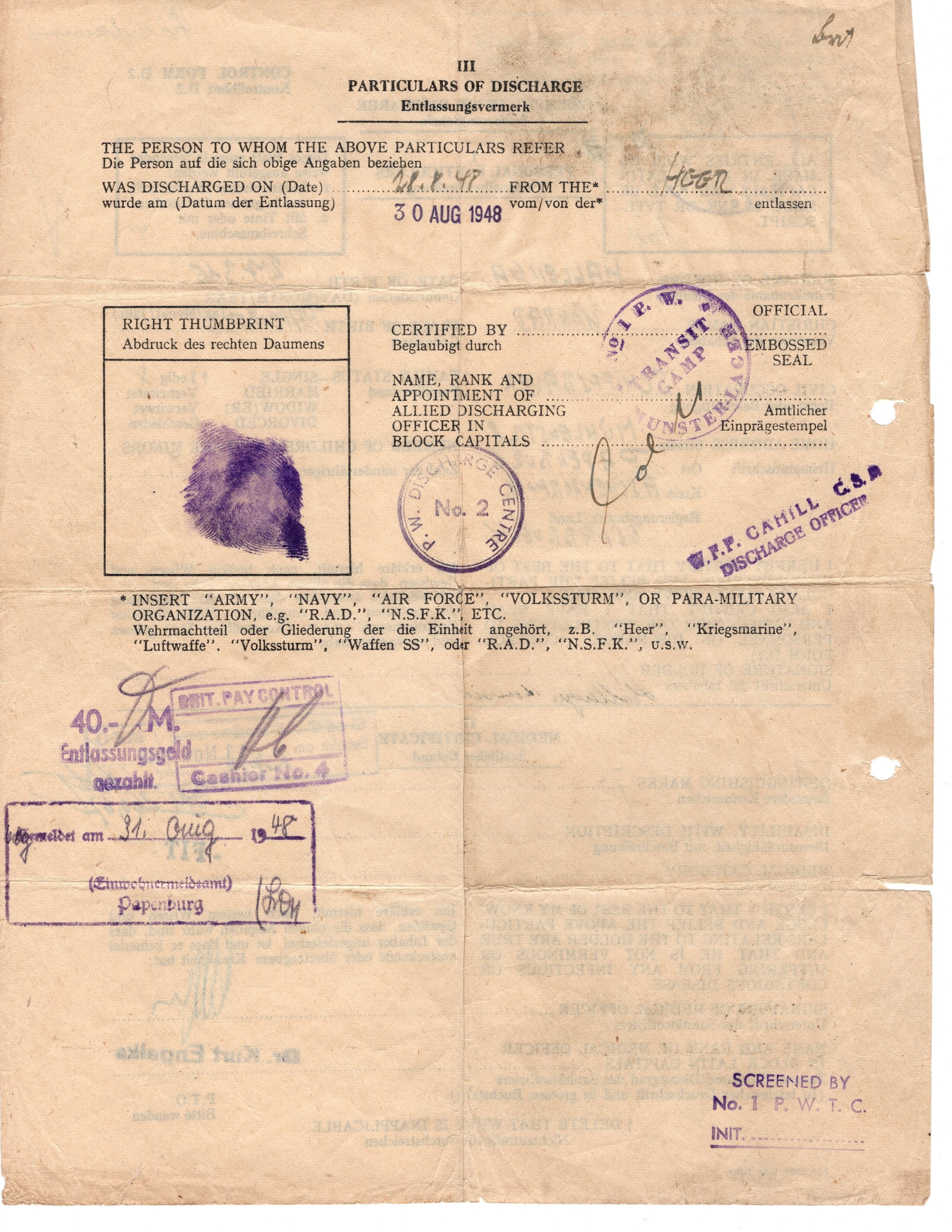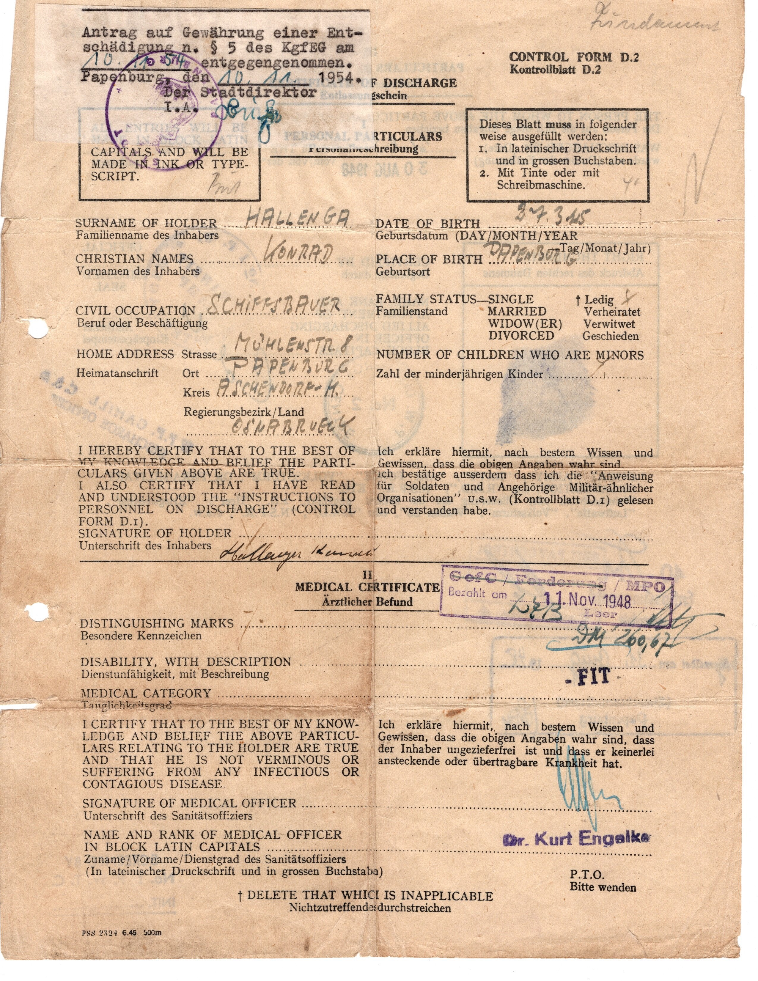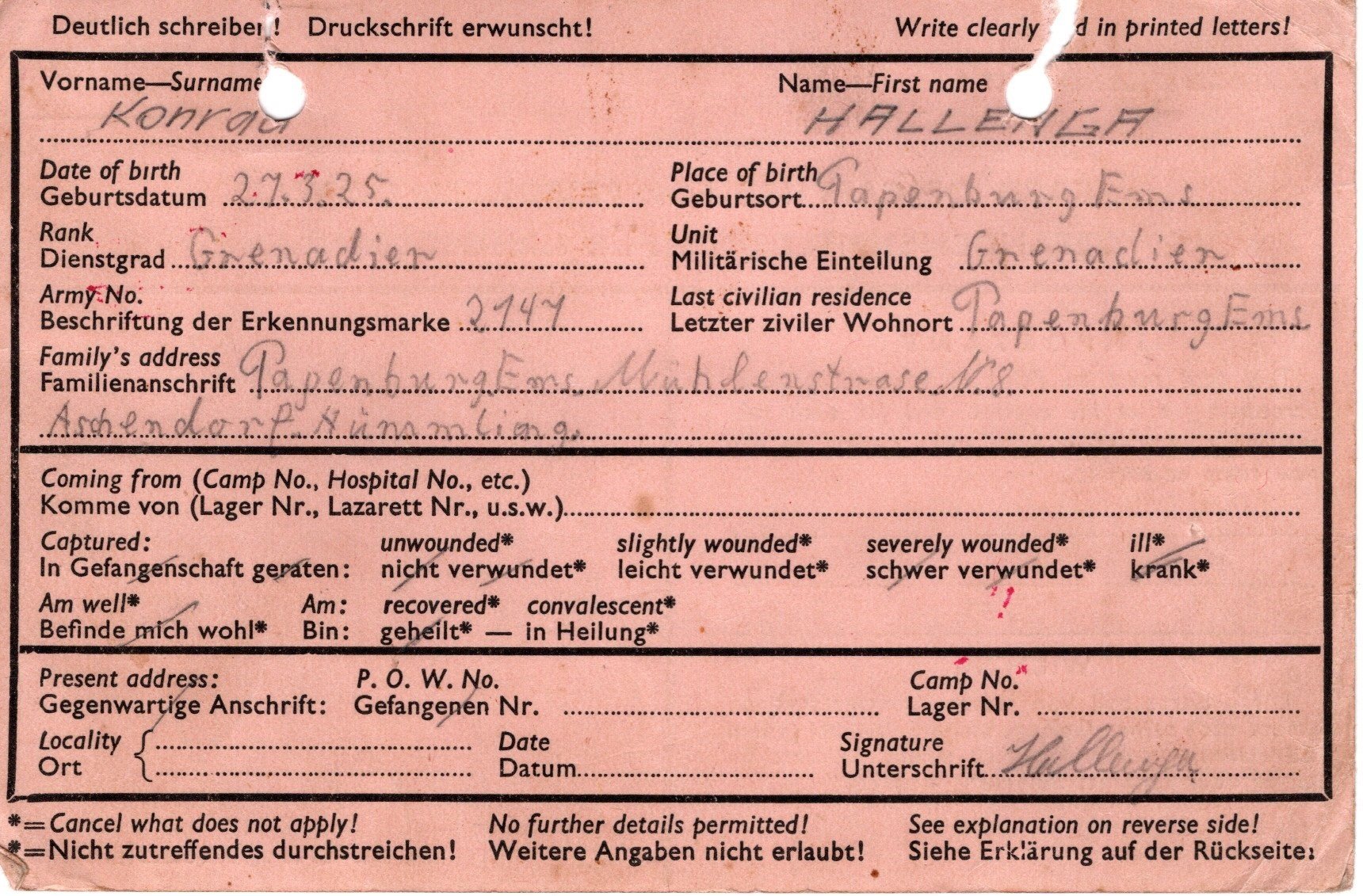 Original Items: One-of-a-kind Set. This is a set of original paperwork a World War Two German soldier named Konrad Hallenga who was born March 27th, 1925 and was a Grenadier in the German Army. His army serial number was 31G120127. Konrad came from the German city Papenburg which is located in the Northwest of Germany. This paperwork set consits of the following pieces: