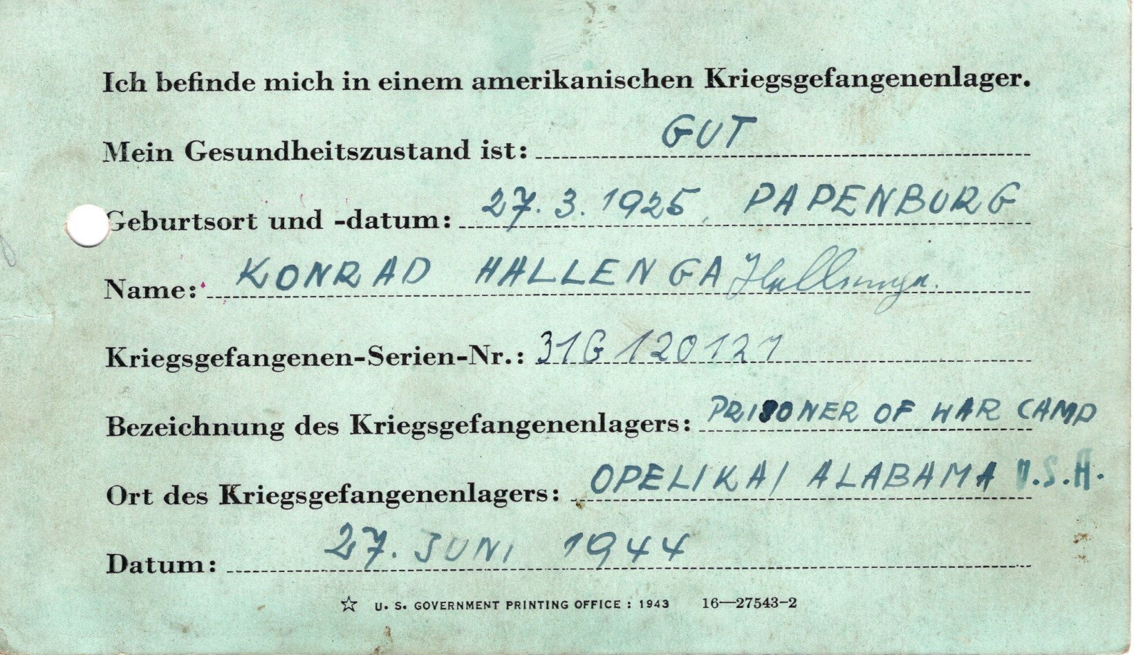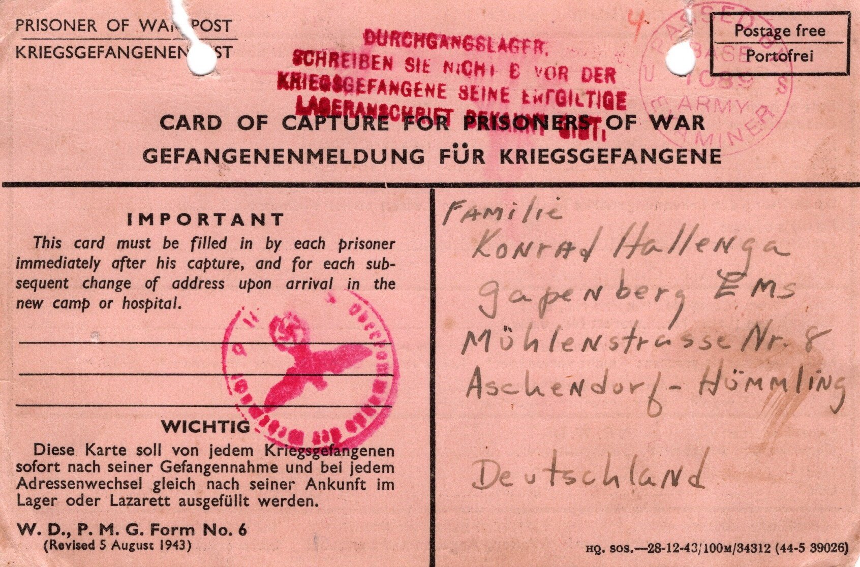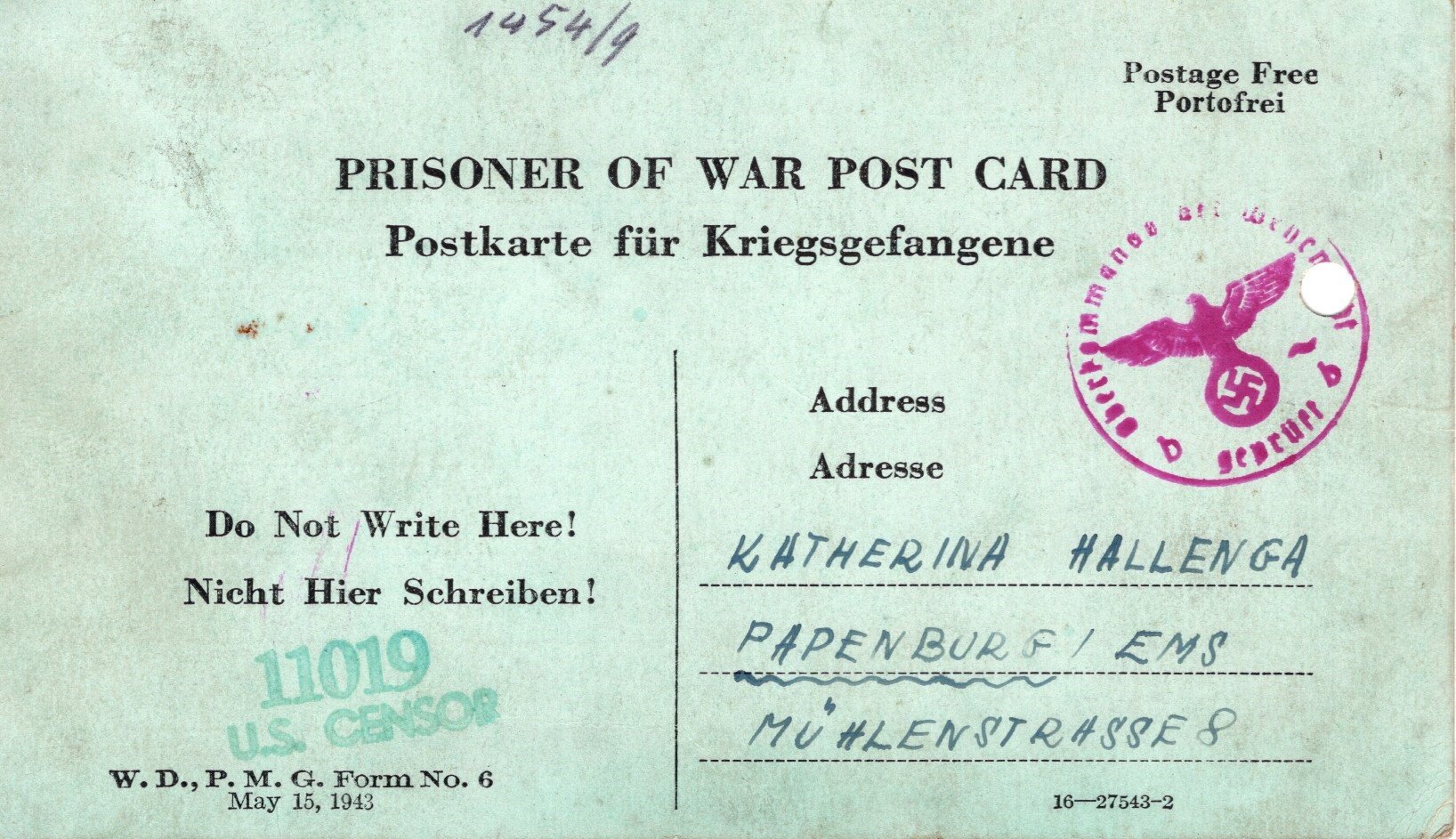 - POW Post card to Katherina Hallenga dated June 27th, 1944.