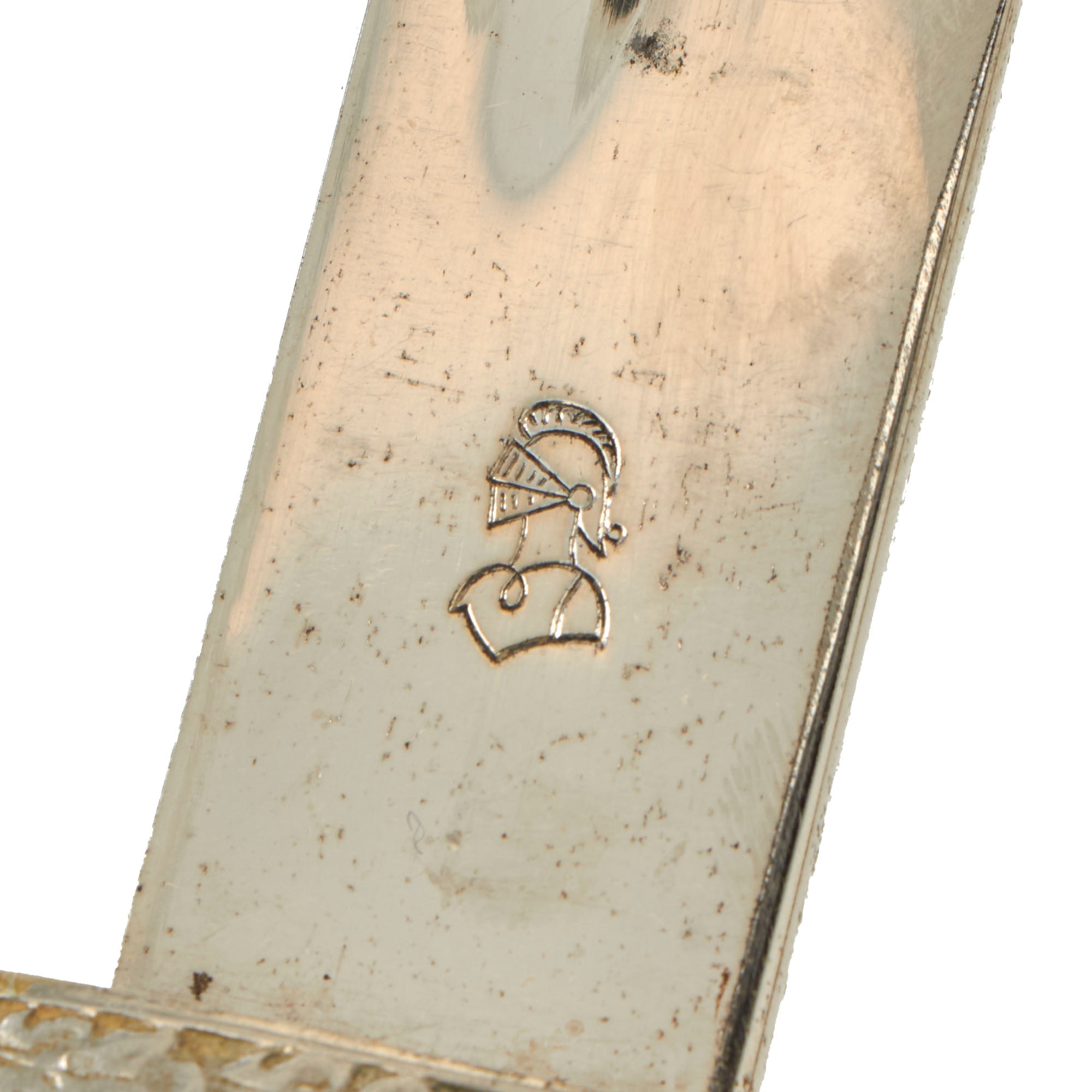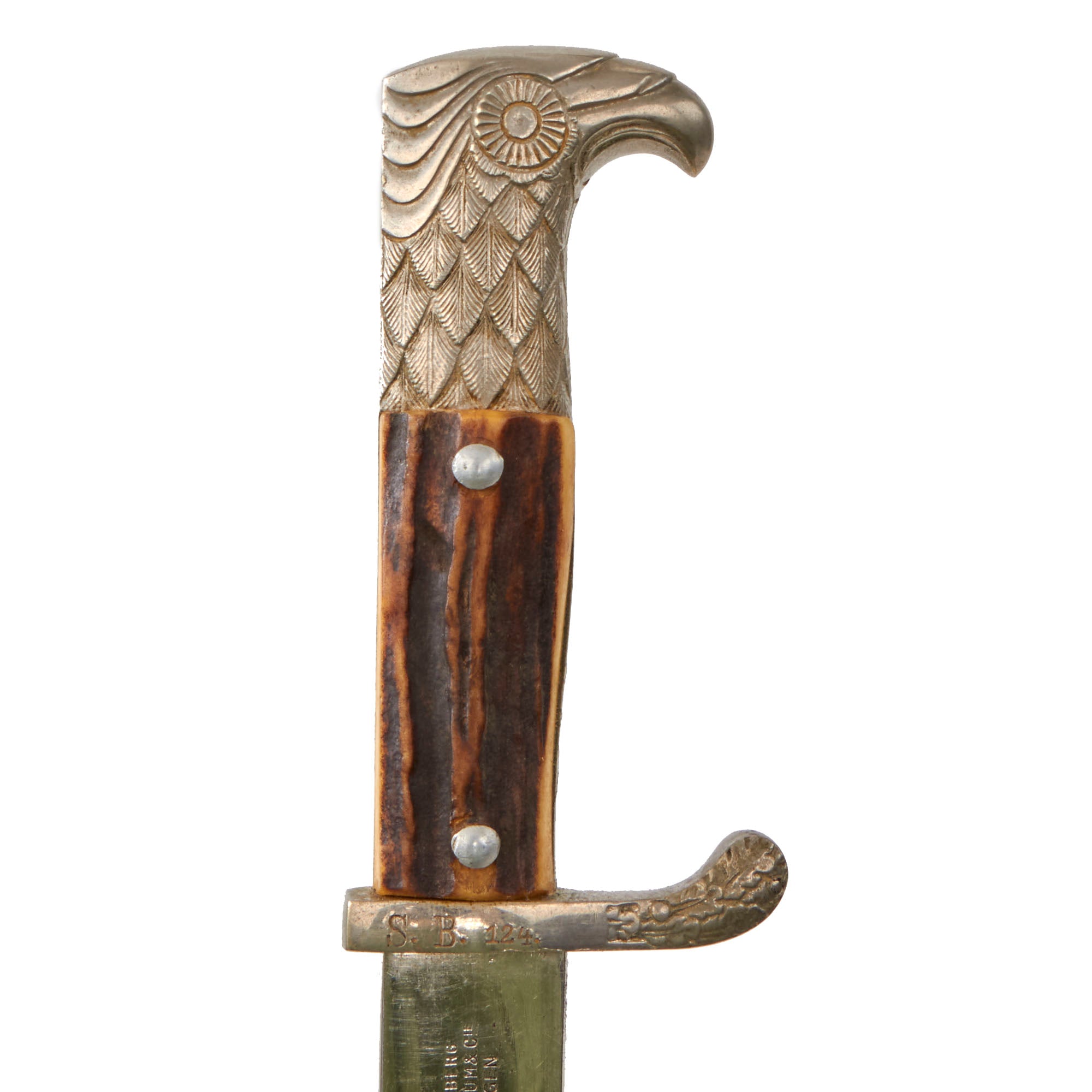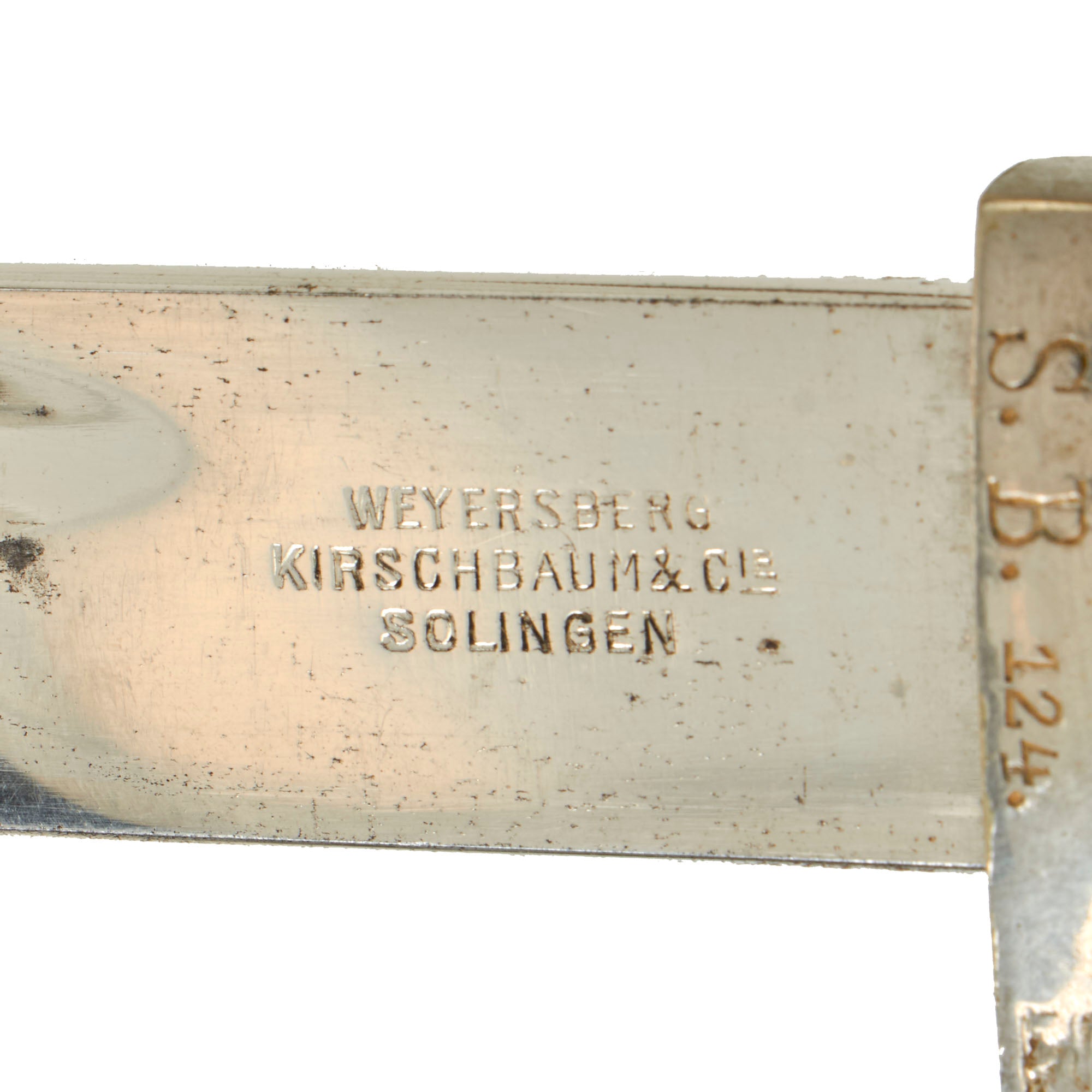 The blade ricasso is maker marked WEYERSBERG KIRSCHBAUM & Co. SOLINGEN with the firms trademark "Knights-Head" (Ritter-helm) logo on the opposite side of the ricasso. This company is a famous manufacturer of military swords and cutlery in Solingen, Germany - a city famous since the middle ages for its metal-working and craftsmanship in sword making. Per J. Anthony Carter's fine work GERMAN SWORD AND KNIFE MAKERS, the traditional manufacturing of swords at WKC dates back to the year 1774 when the Weyersberg first registered the ''Kings head'' as their trademark. Later in 1883 the company merged with the Kirschbaums and the company Weyersberg Kirschbaum & Cie was formed, which continued into the Weimar Period. It then rebranded as W.K.C. Waffenfabrik GmbH, and produced many edged weapons during the NSDAP Period. The company is still in operation today.