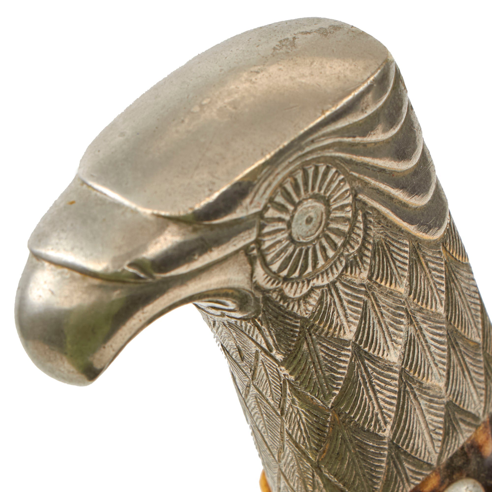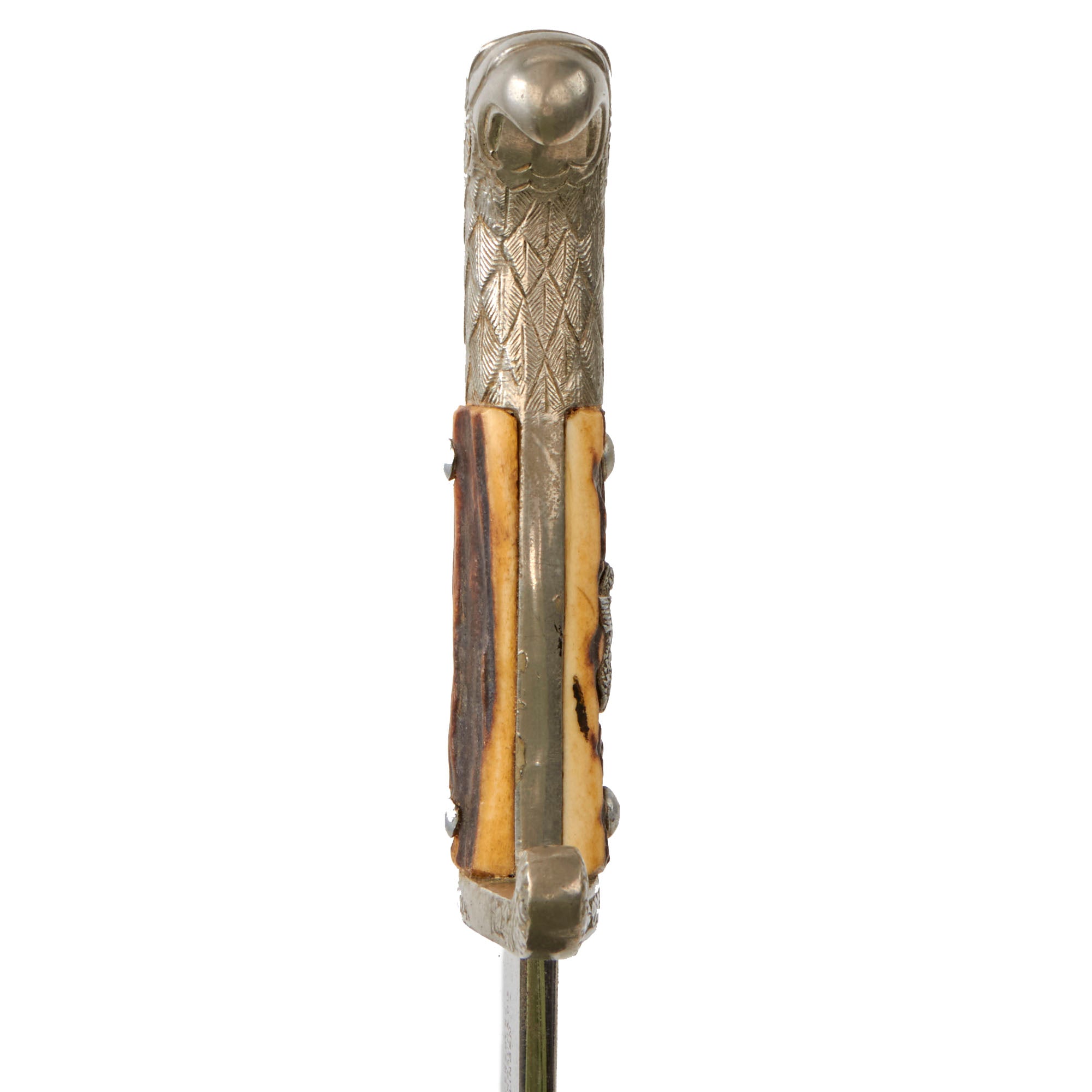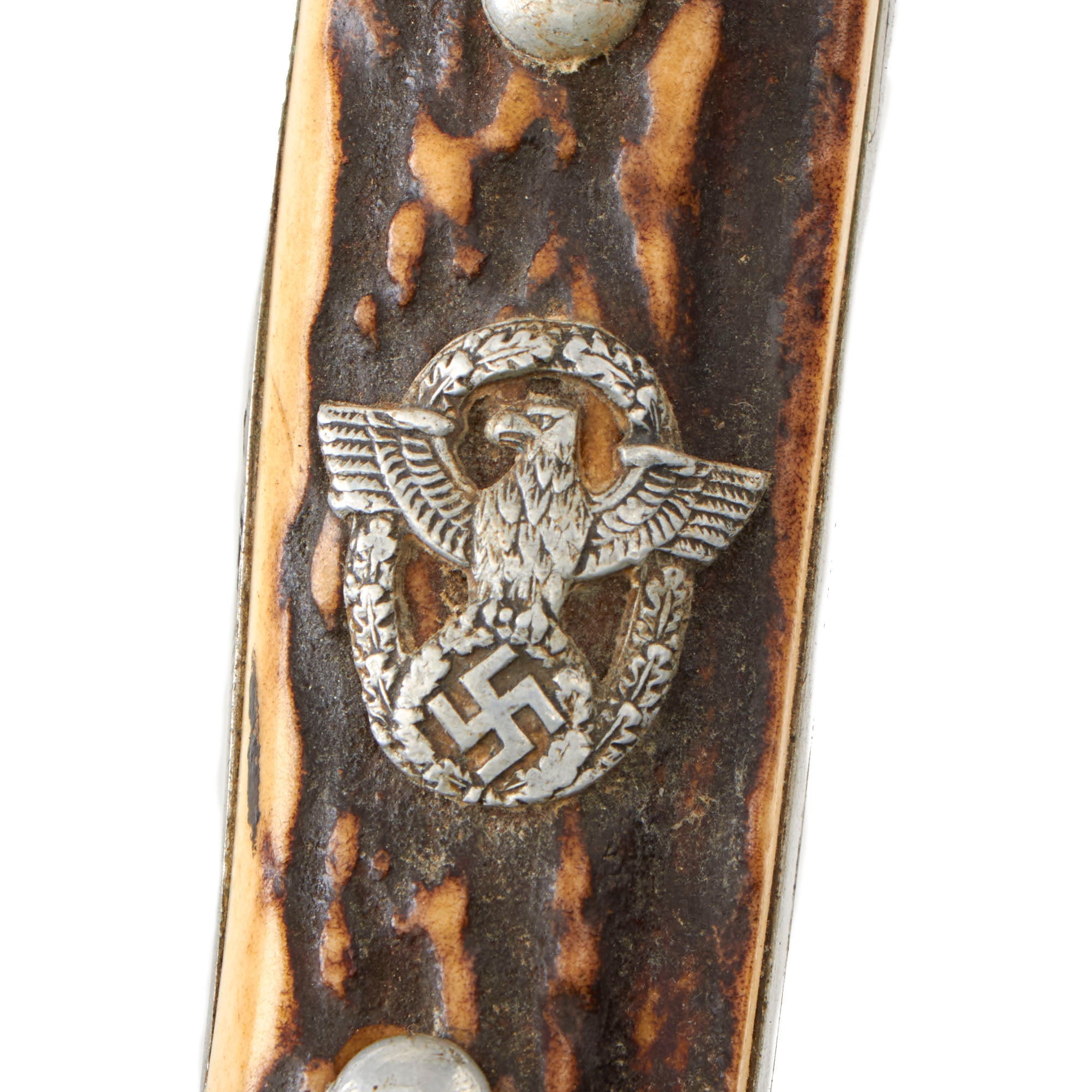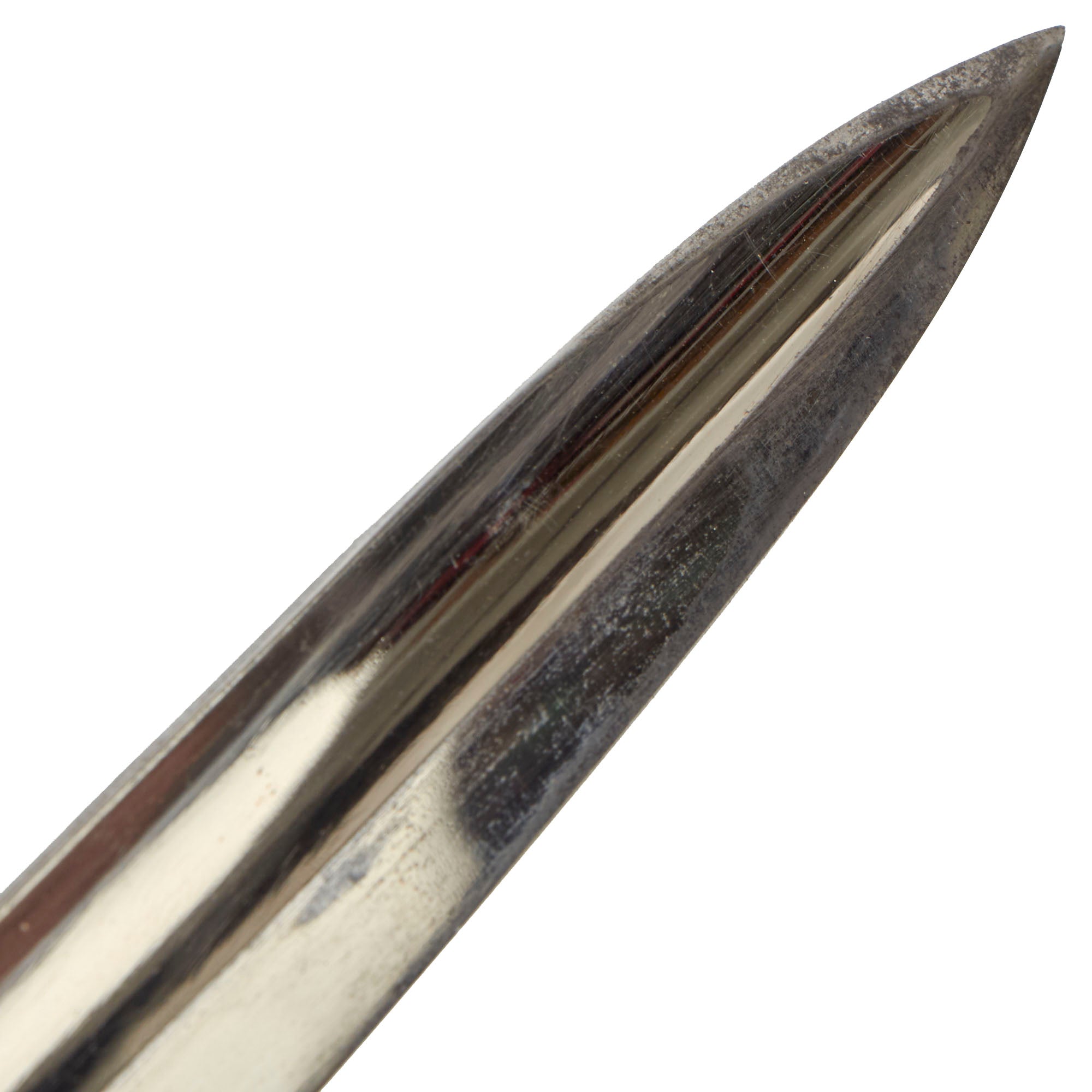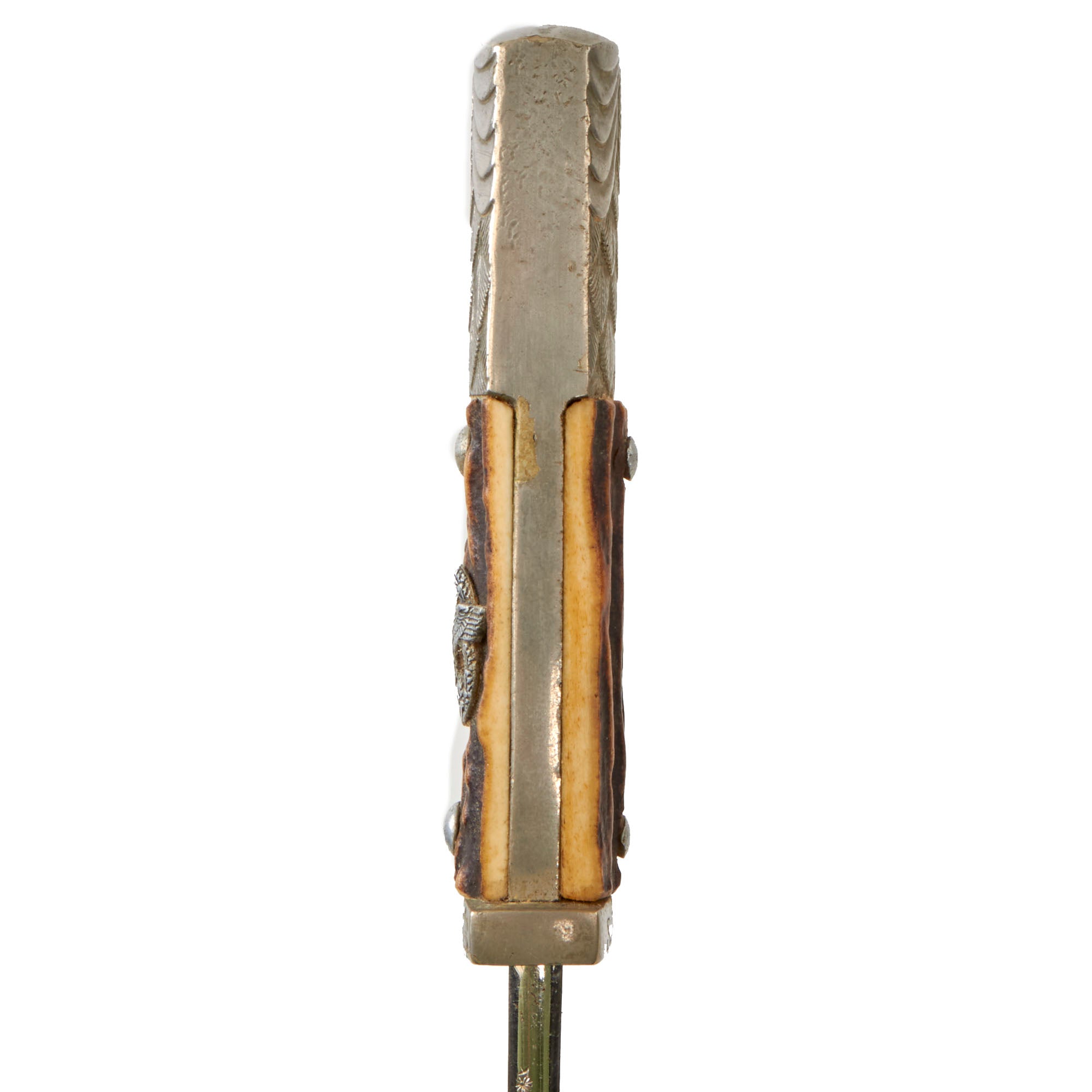 The leather buffer washer on this example is no longer present. The bayonet grip scales are made of stag-horn with an aluminum police insignia firmly inset on one side. These are held with solid aluminum rivets between the upswept cross guard decorated with oak leaves, and the stylized eagle’s head pommel. Both cross guard and eagle’s head are well detailed and in very good condition, with almost all of the original nickel plating present.