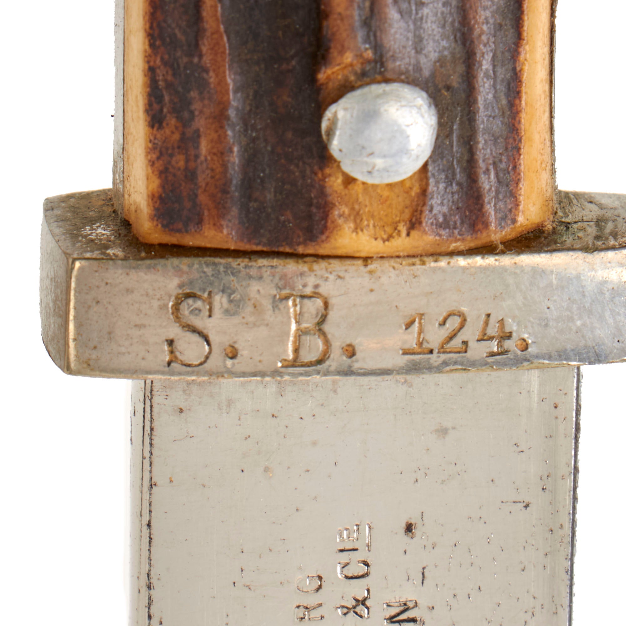 It features a beautiful Stag Handle, with an inlaid aluminum Civic Police emblem. The pommel is a solid nickel plated alloy decorated "Birds Head" without a bayonet slot, and there is a unit marking on the reverse guard of the bayonet: