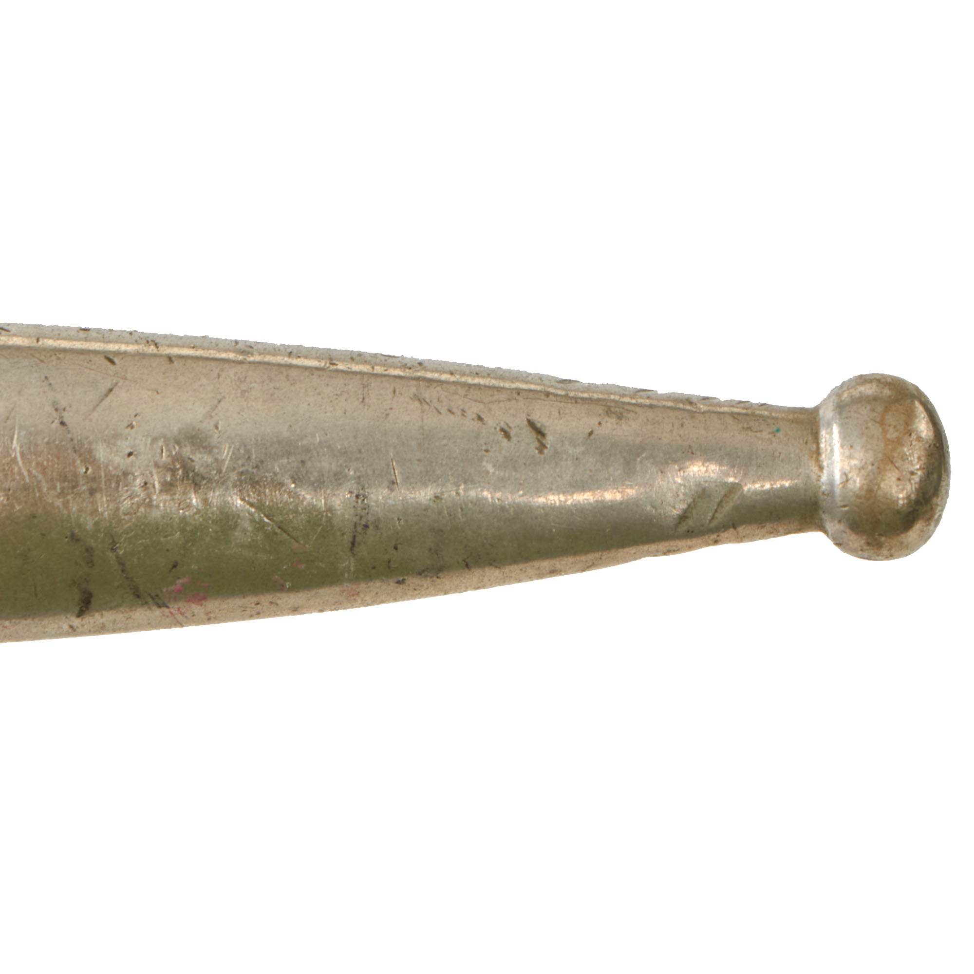 The bayonet has a lovely approximately 33 cm (12.75 inches) long nickel plated steel blade, which was forged "cut-down" style, with the fuller running to the tip. Blade is nice and bright, of excellent quality, and still has over 90+% of the original nickel plating, with a slight area of wear to the tip.