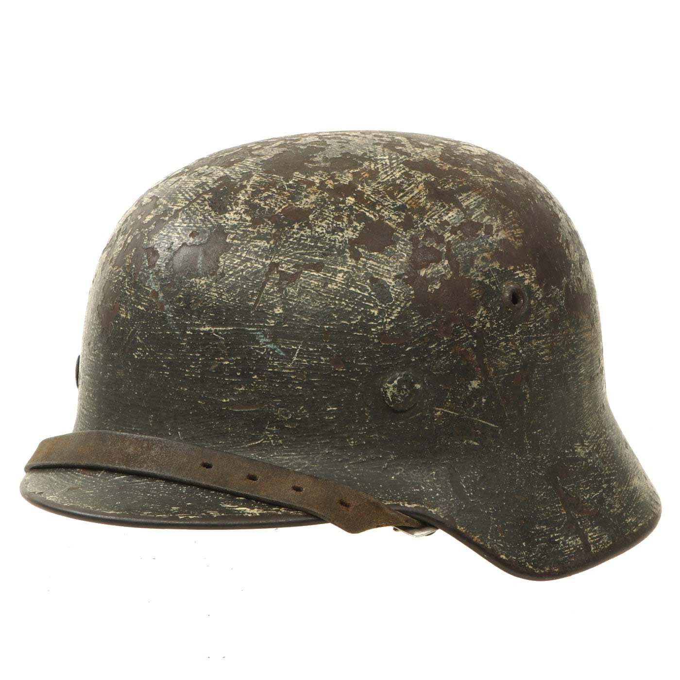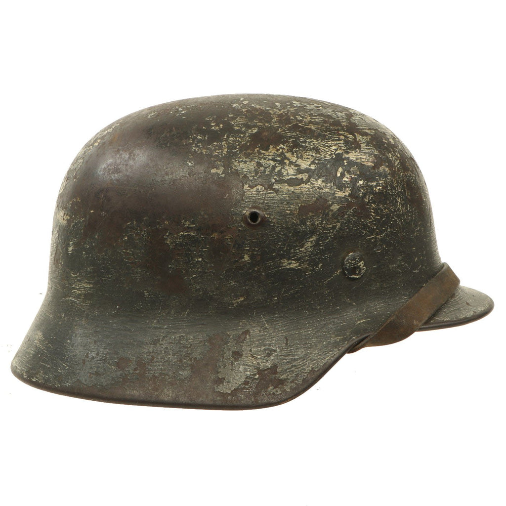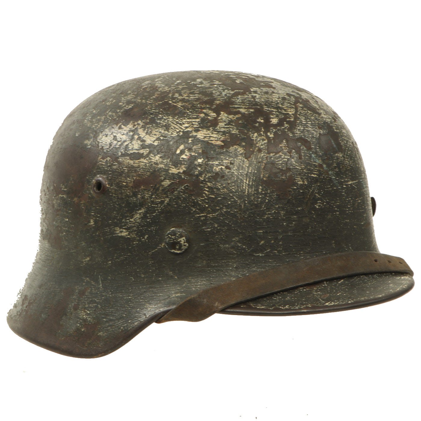 Original Item: Only One Available. This is an incredible all original service worn example of an early WWII Model 1935 German helmet, which has definitely had an interesting history! This looks to be a Heer (Army) issued helmet, though it does not have any decals we can see. It looks to have had the original Panzergrau paint on the outside stripped during the war, and then was repainted white for use during the winter. It saw much service, and then was repainted with Panzergrau over the white. It then saw more service after that, wearing through to the white in places, and giving it a lovely impossible to duplicate subtle camouflage paint job. It is retained at about 50%, with oxidation, wear, and loads of patina!