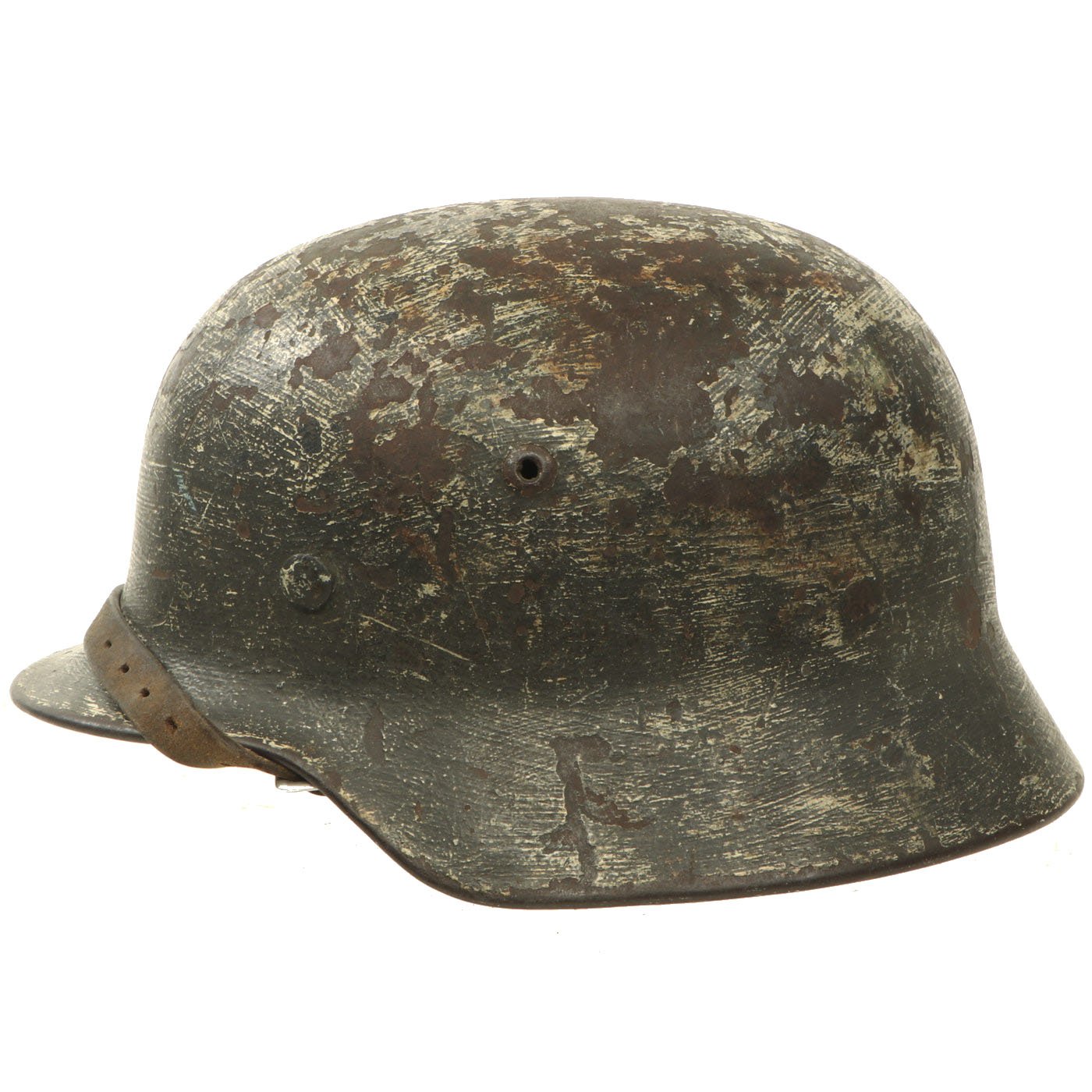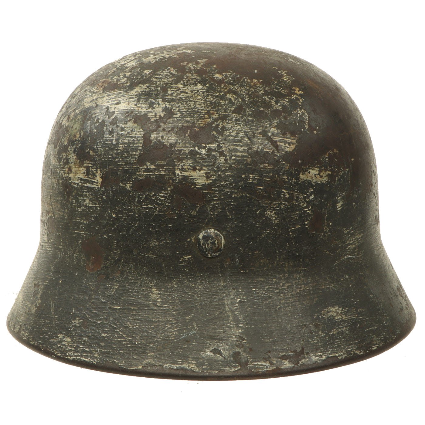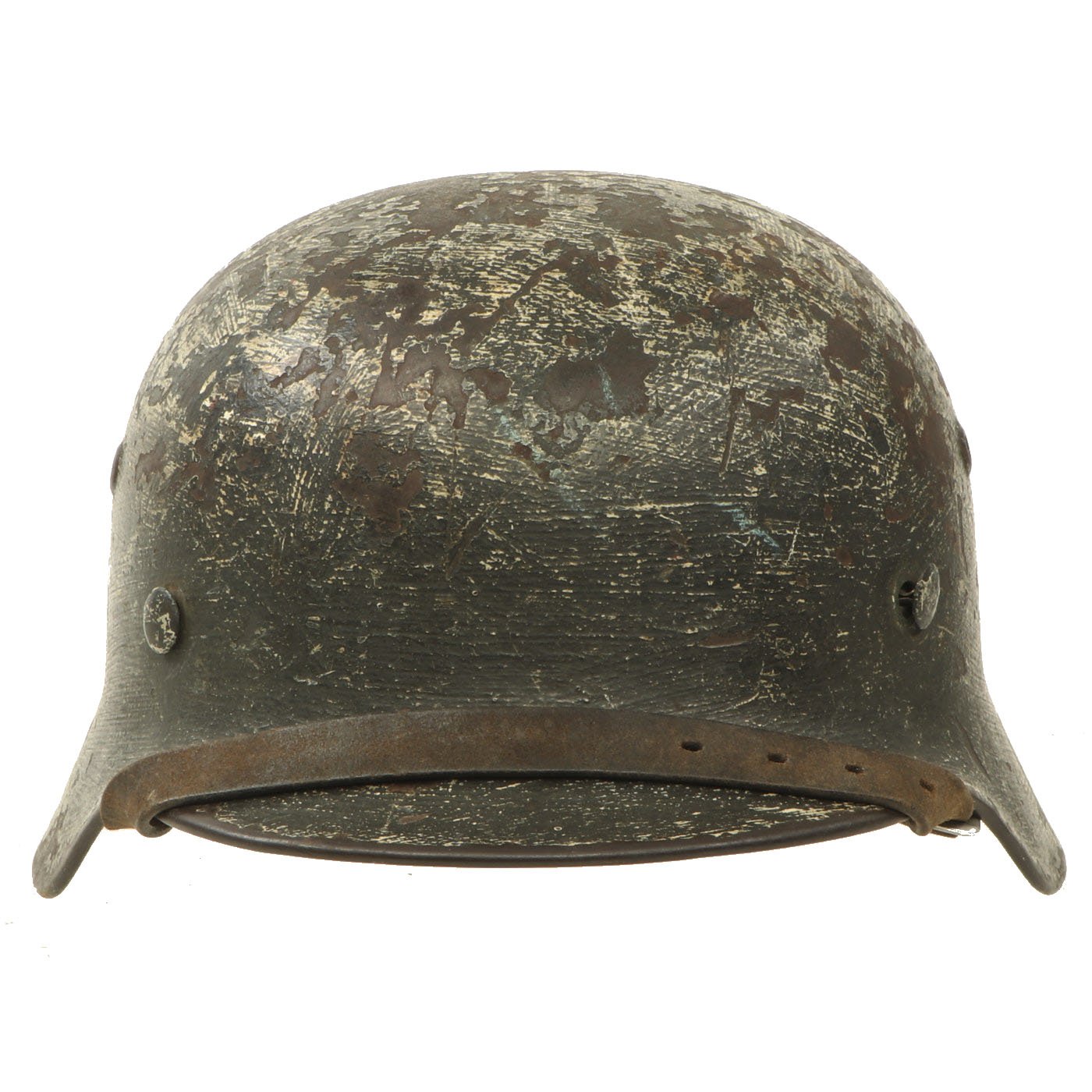 Original Item: Only One Available. This is an incredible all original service worn example of an early WWII Model 1935 German helmet, which has definitely had an interesting history! This looks to be a Heer (Army) issued helmet, though it does not have any decals we can see. It looks to have had the original Panzergrau paint on the outside stripped during the war, and then was repainted white for use during the winter. It saw much service, and then was repainted with Panzergrau over the white. It then saw more service after that, wearing through to the white in places, and giving it a lovely impossible to duplicate subtle camouflage paint job. It is retained at about 50%, with oxidation, wear, and loads of patina!