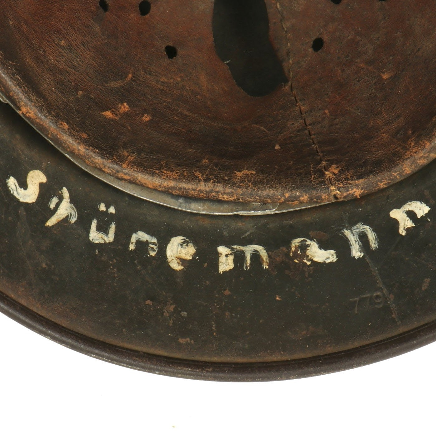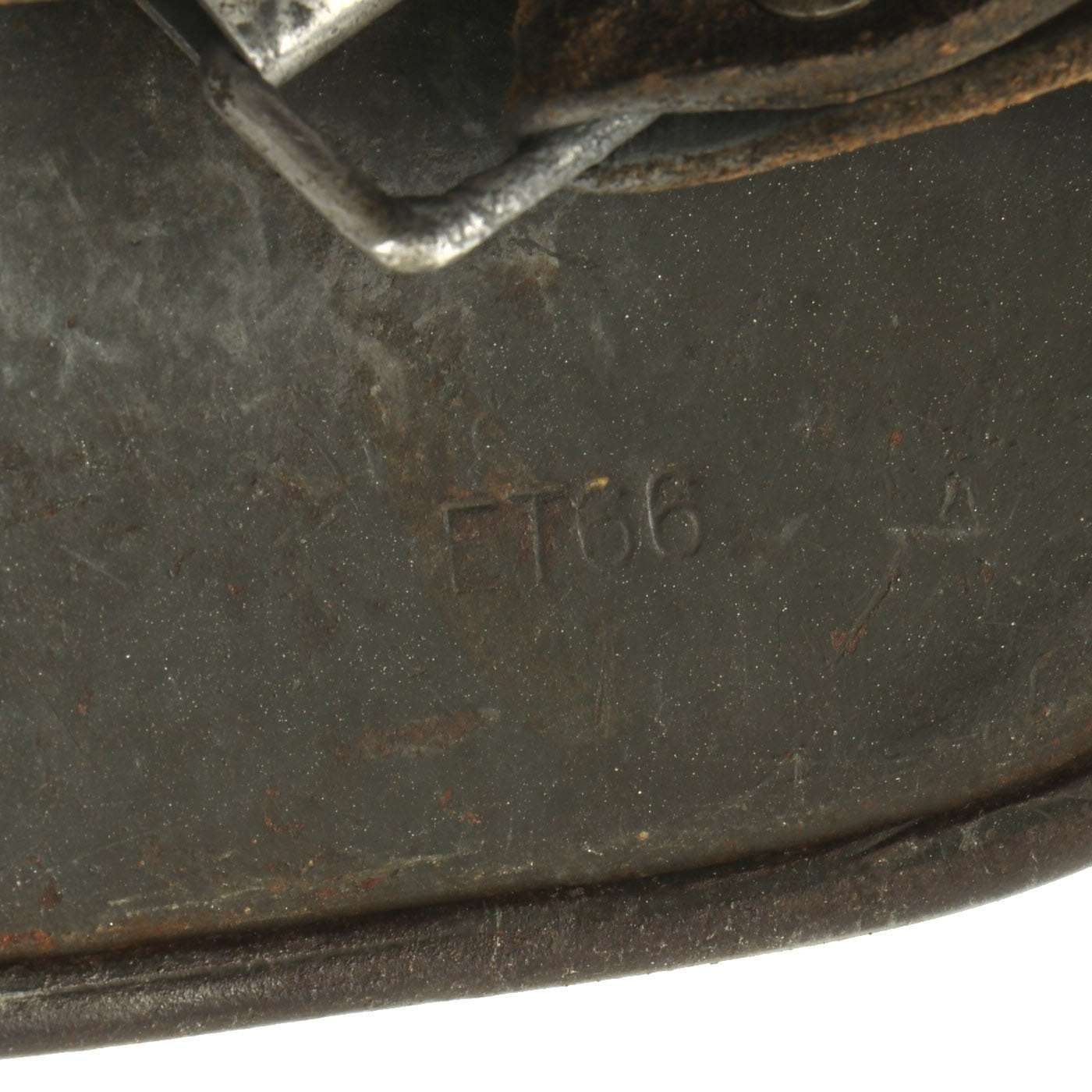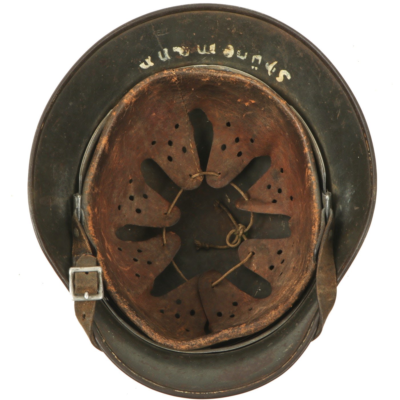 The reverse, interior, neck guard apron is serial number stamped 4782, and the interior, left side, apron has the stamped manufacturer's code and size, E.T.66 indicating that it was manufactured by Eisenhuttenwerk AG of Thale, located in the Harz district in Saxony, Germany. Size 66 is a nice larger size that can accommodate liners from 58cm to 59cm or US 7 1/4 to 7 5/8. Size 66 shells are harder to find and are therefore more valuable to a collector. It also is named to Spünemann with white paint under the rear skir.