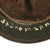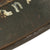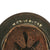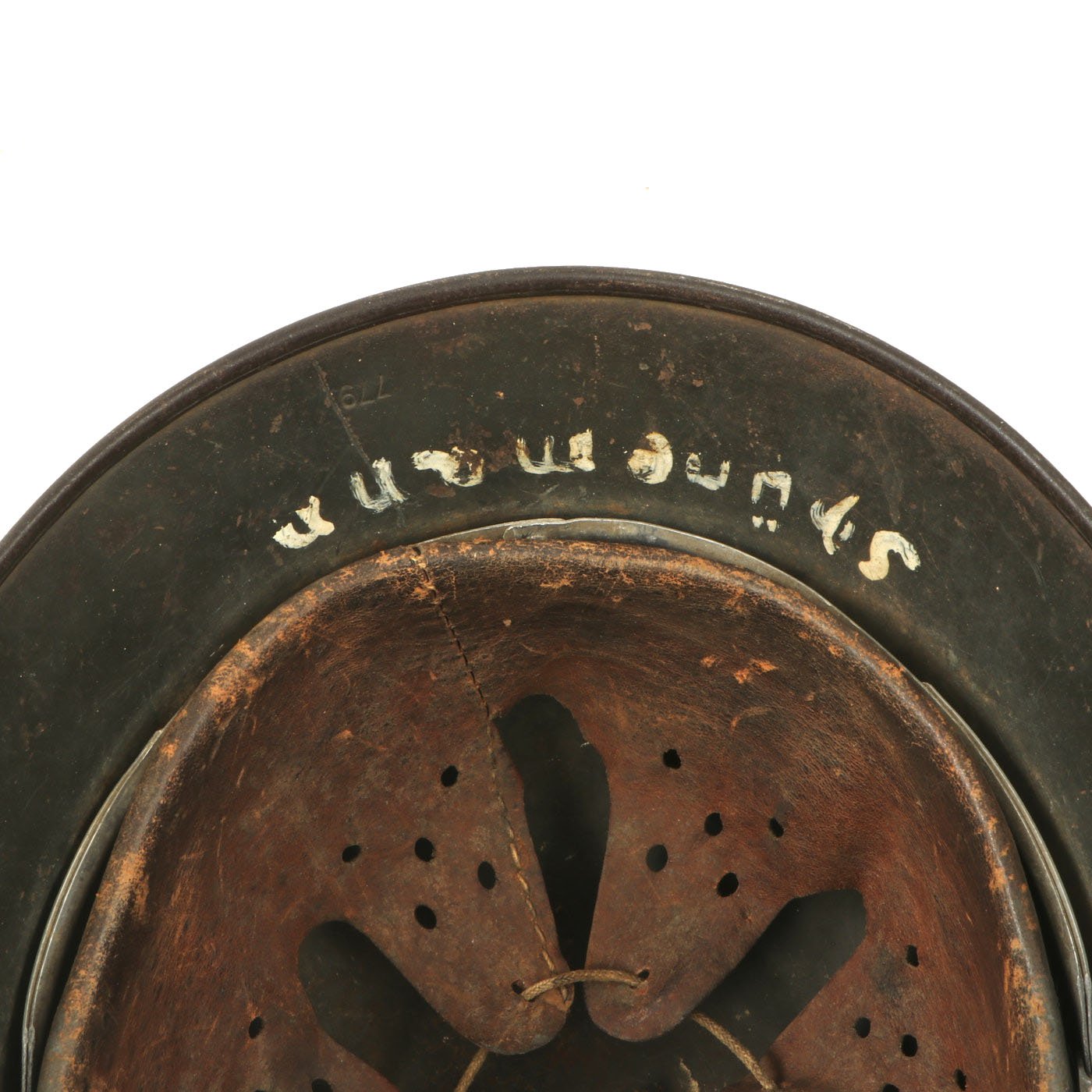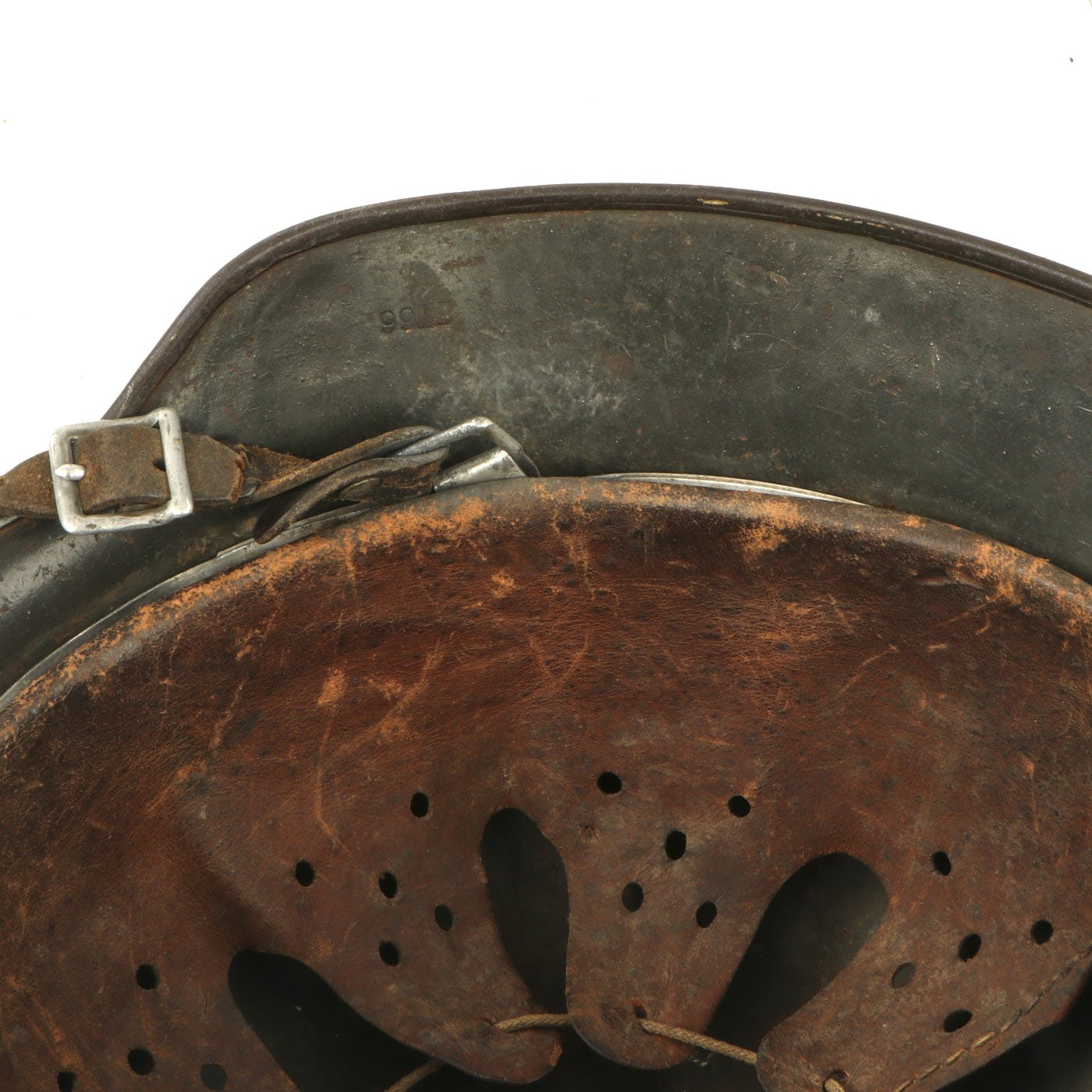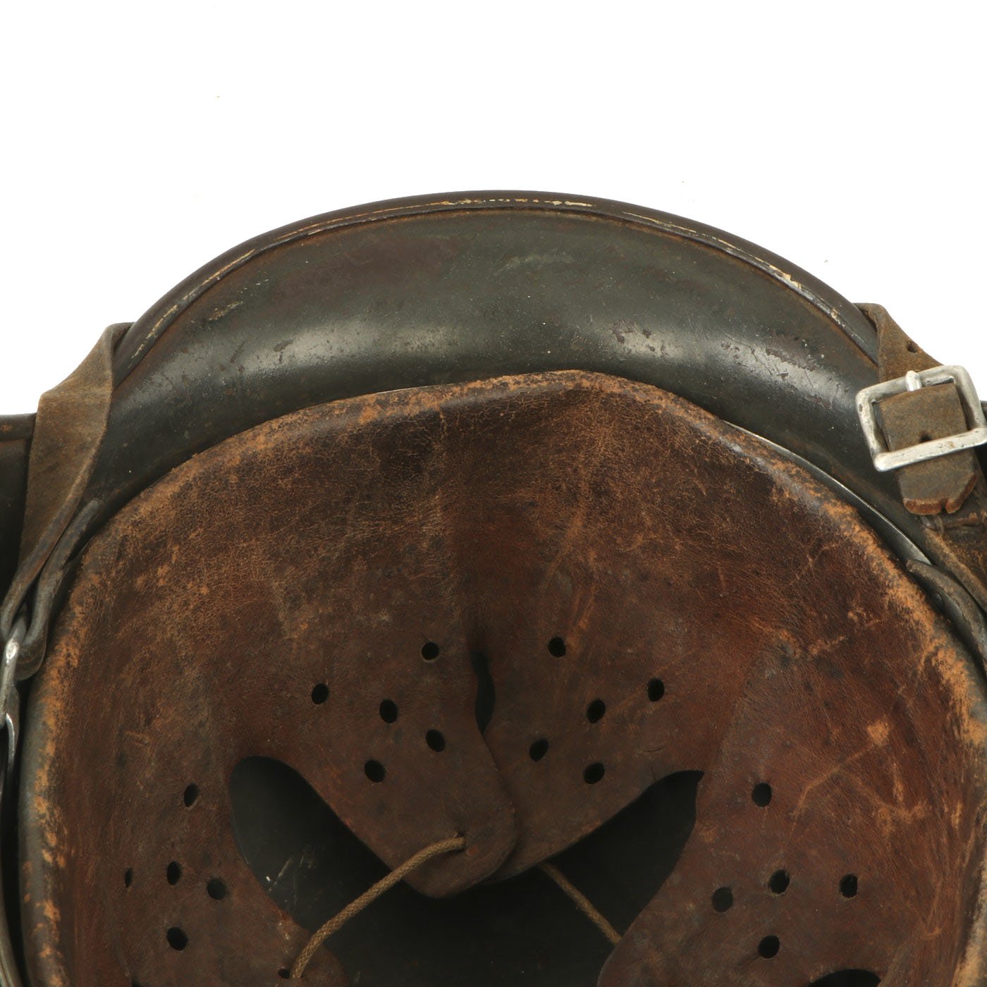 All three liner retaining pins are intact, with much of the original paint still retained. The interior of the helmet still has the original M31 leather liner with all eight of its fingers intact, though it is now somewhat dark and worn from age and use. The original top tie is still present, and in good shape. The liner band is aluminum, with square aluminum chin strap loops attached to reinforced sides. This is the last pattern before the move to galvanized steel bands. The left exterior of the liner band is marked 66 n.A / 59, indicating that it is a size 58 liner for a size 66 shell. It is also maker marked and dated on the other side: