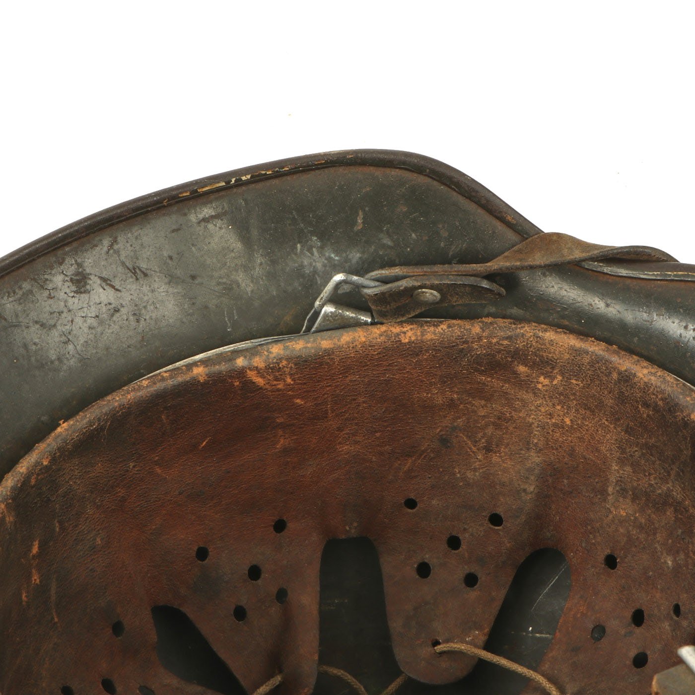 This indicates production by the metal and leather working company Werner Zahn, based in Berlin - Charlottenburg, in the year 1940, which fits right into the early war period. Attached to the liner is a totally correct chin strap with all aluminum hardware. The leather is somewhat dry, and there is some missing leather on the end of the longer strap, which now only has 7 adjustment holes. The inside of the loops going around the chinstrap show that the aluminum has worn off onto the leather, so this chin strap has been on this helmet while in service for a long time.
