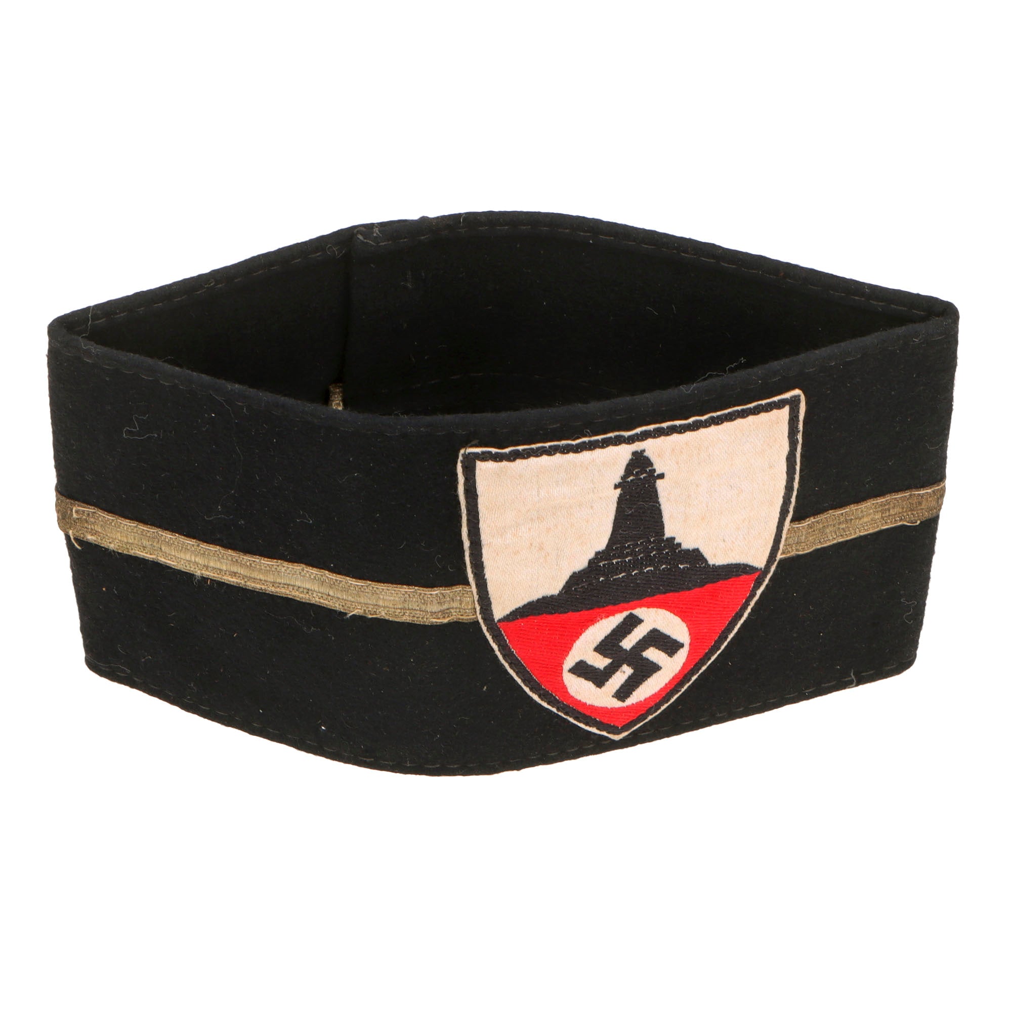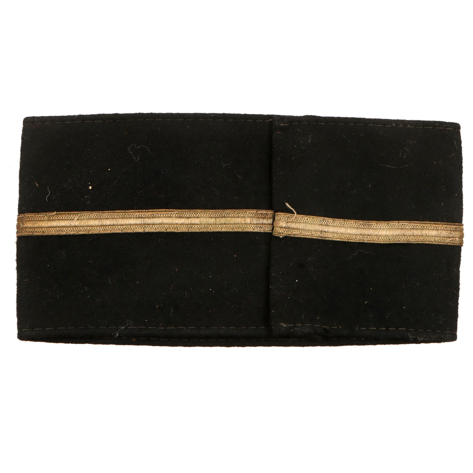 This NSRKB Armband is in very good used condition, measuring approximately 13 1/2" x 3 3/8", and is sewn together in the back with some tack stitches. There is about 3/4 of an inch of overlap, so it was sized to fit. It bears the correct NSRKB emblem, which is "BeVo" style machine embroidered and sewn to the armband, under which is a central band of bullion tresse style piping, indicating officer issue. The body of the band is very nice very dark navy blue or black woven felt, which still has lots of the original fuzzy "nap" to the fabric, with no mothing we can see.