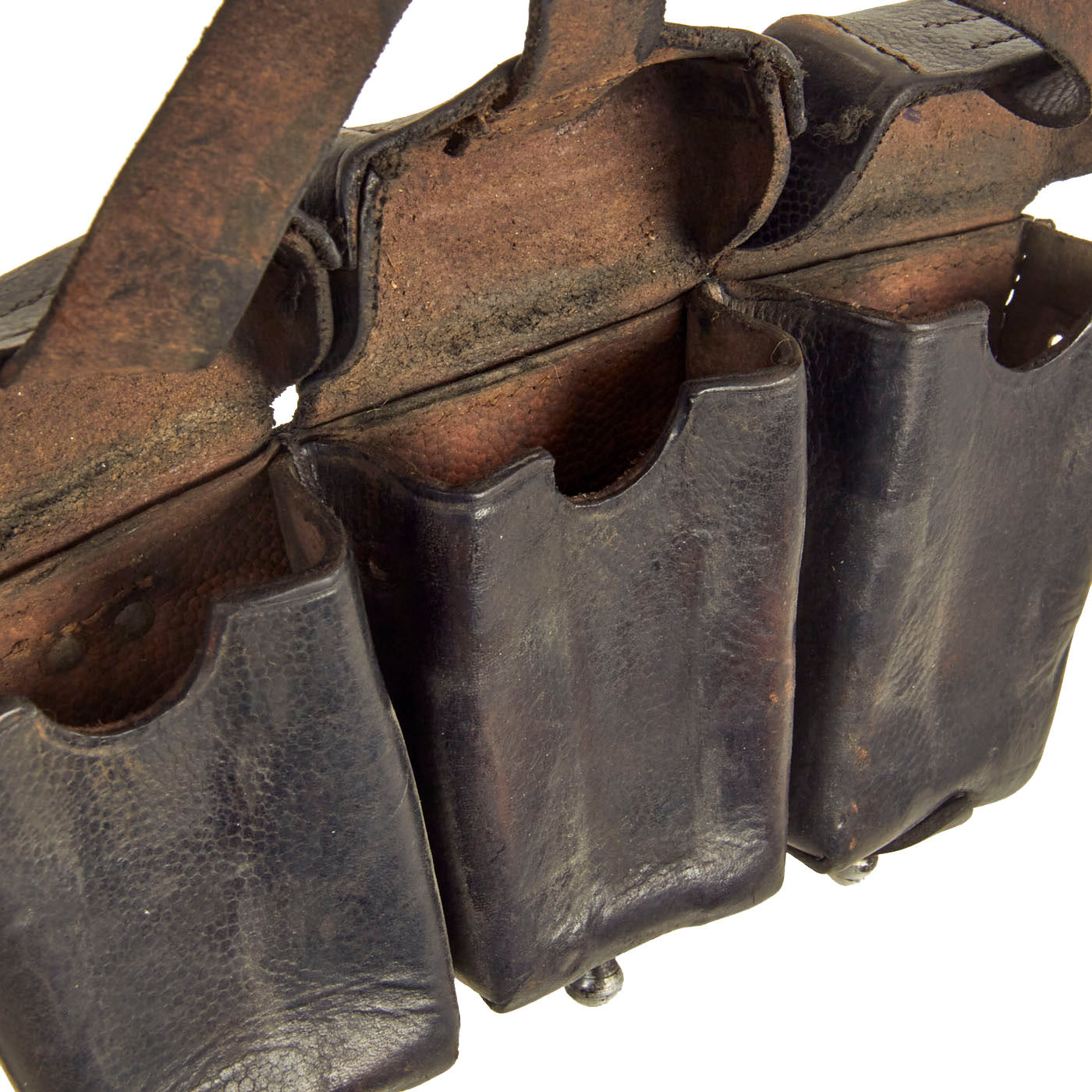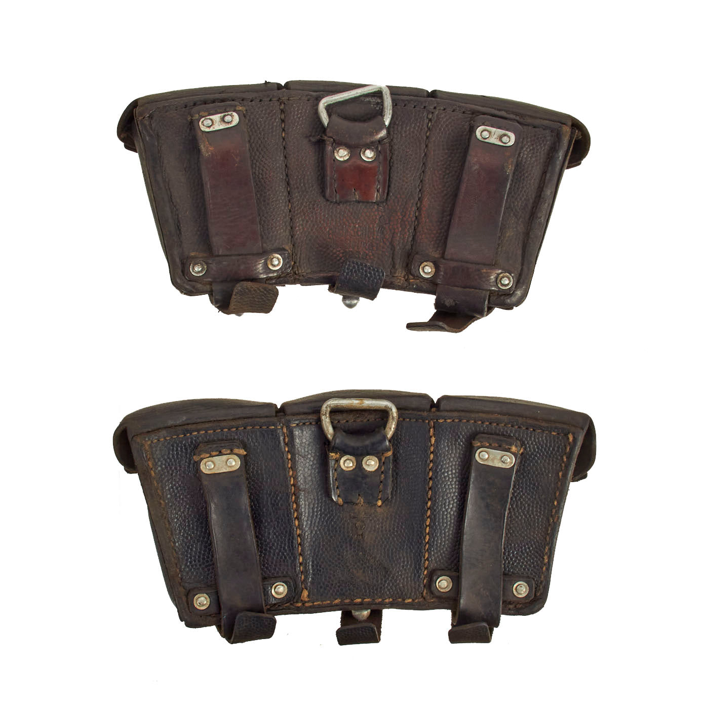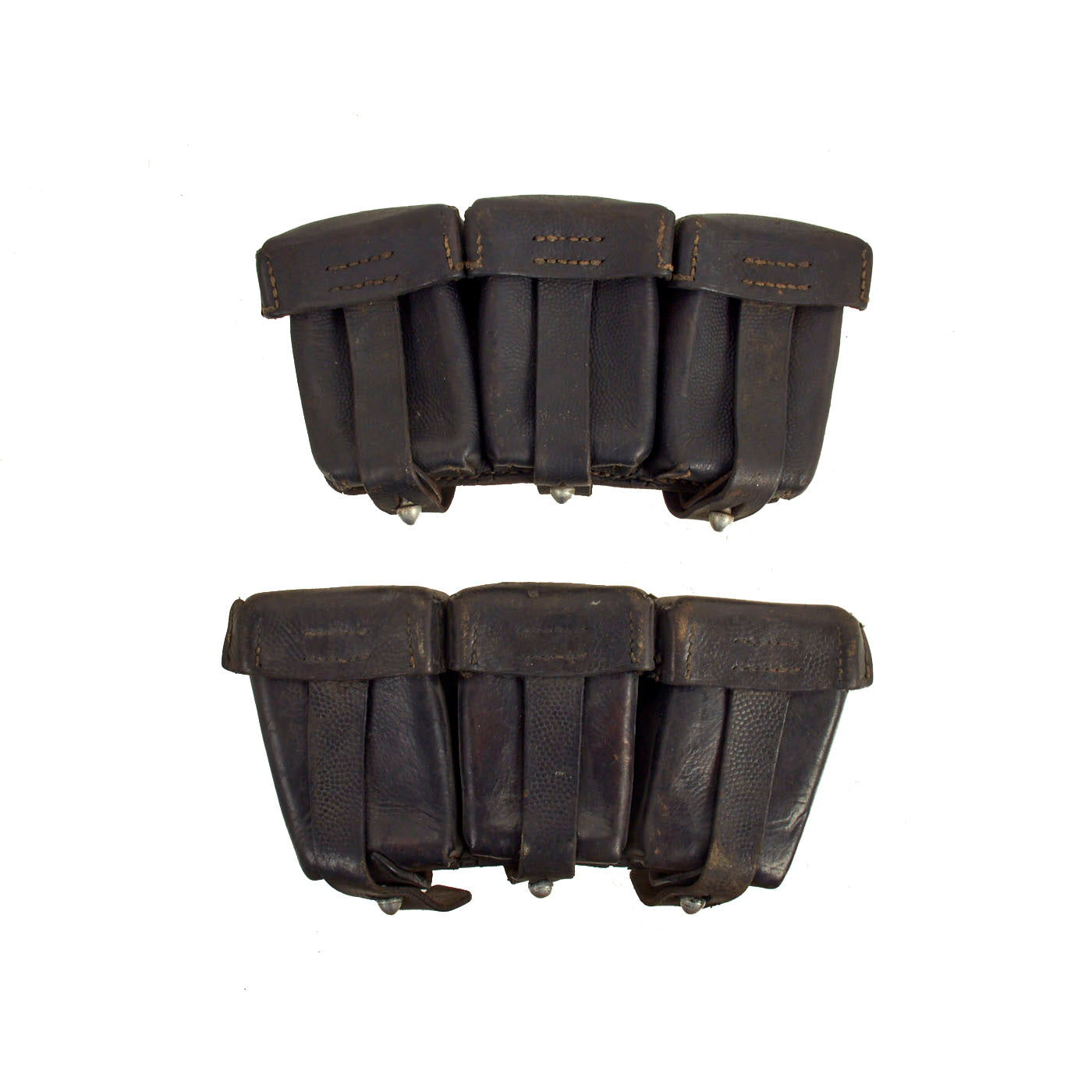 Original Item: Only One Lot of 2 Available. These are very nice German WWII Naval-issue black pebble-grain leather triple Patronentaschen (ammunition pouch), designed to hold stripper clips for the Mauser k98K rifle. This was the standard German infantry rifle throughout WWII for all forces, even the Kriegsmarine / Navy. These pouches would be attached to the waist belt, and would be attached to combat suspenders using the rings on the back. Each pocket holds two stripper clips of 5 rounds, so each pouch holds 6 clips, or 30 rounds.
