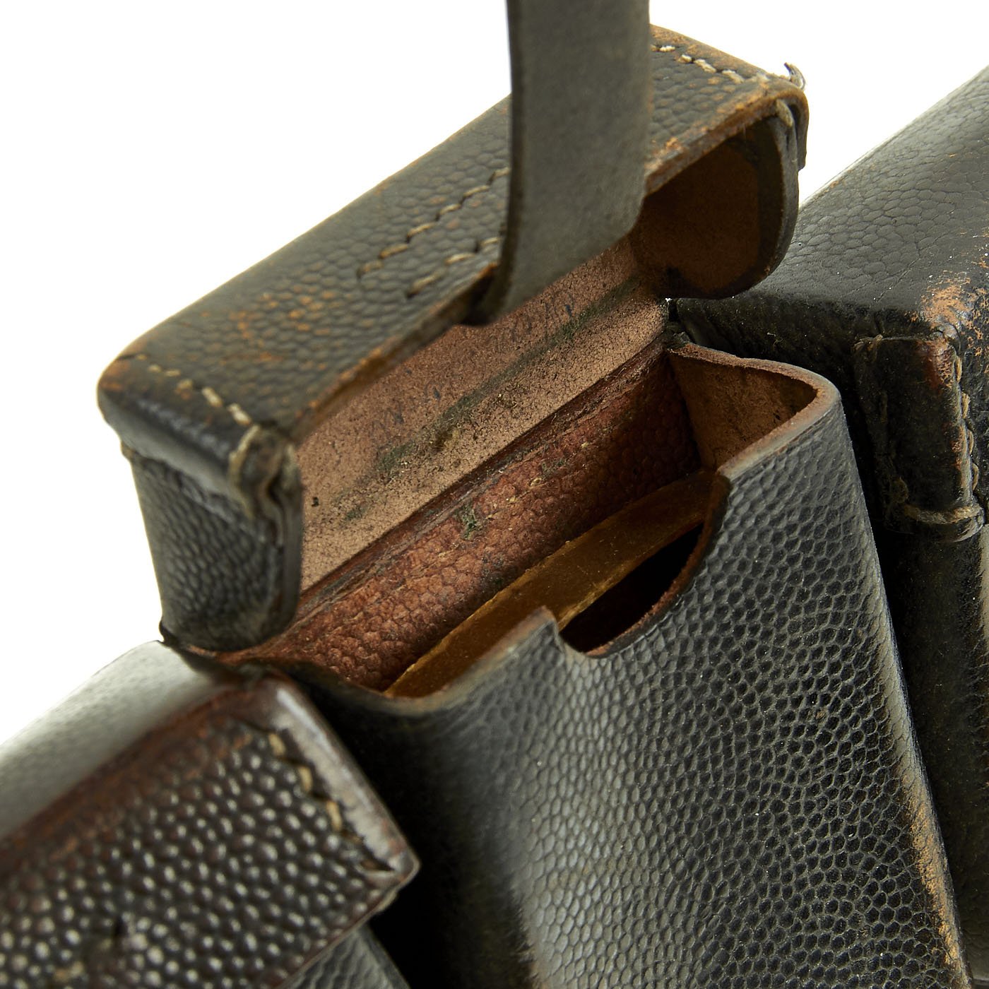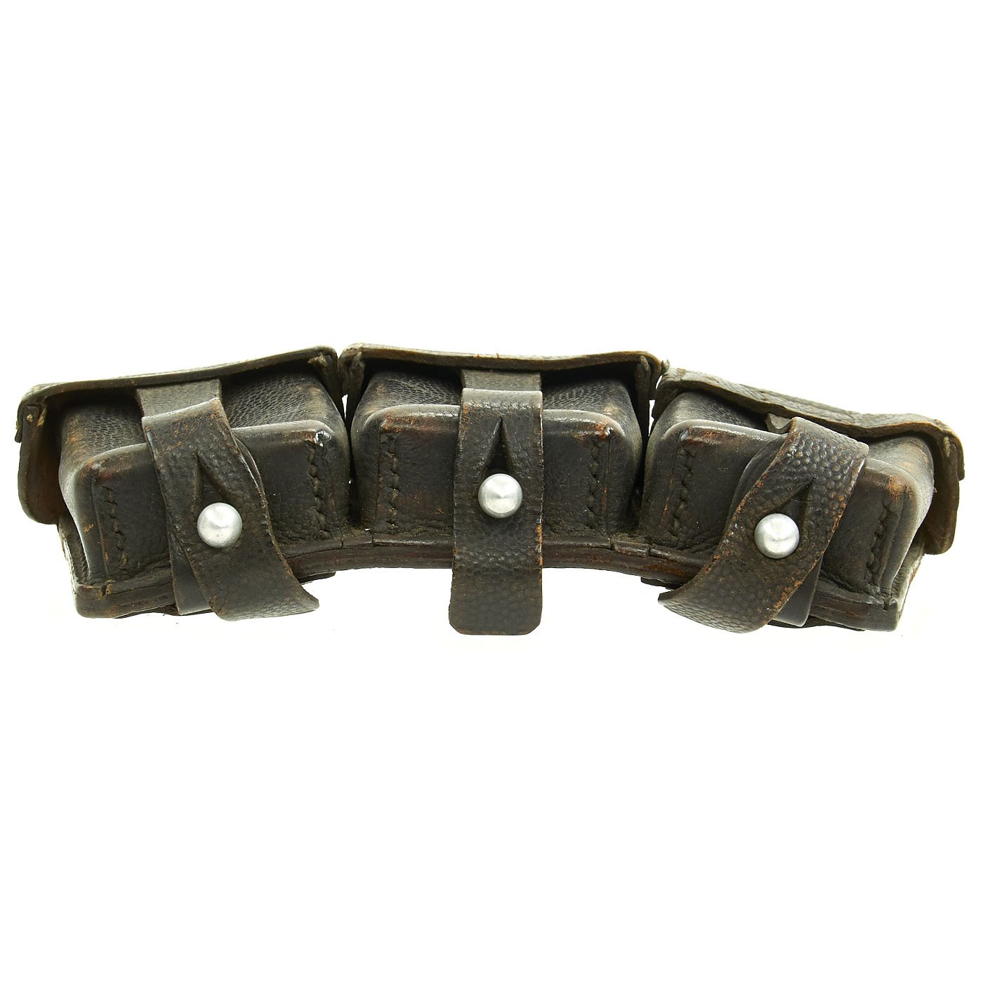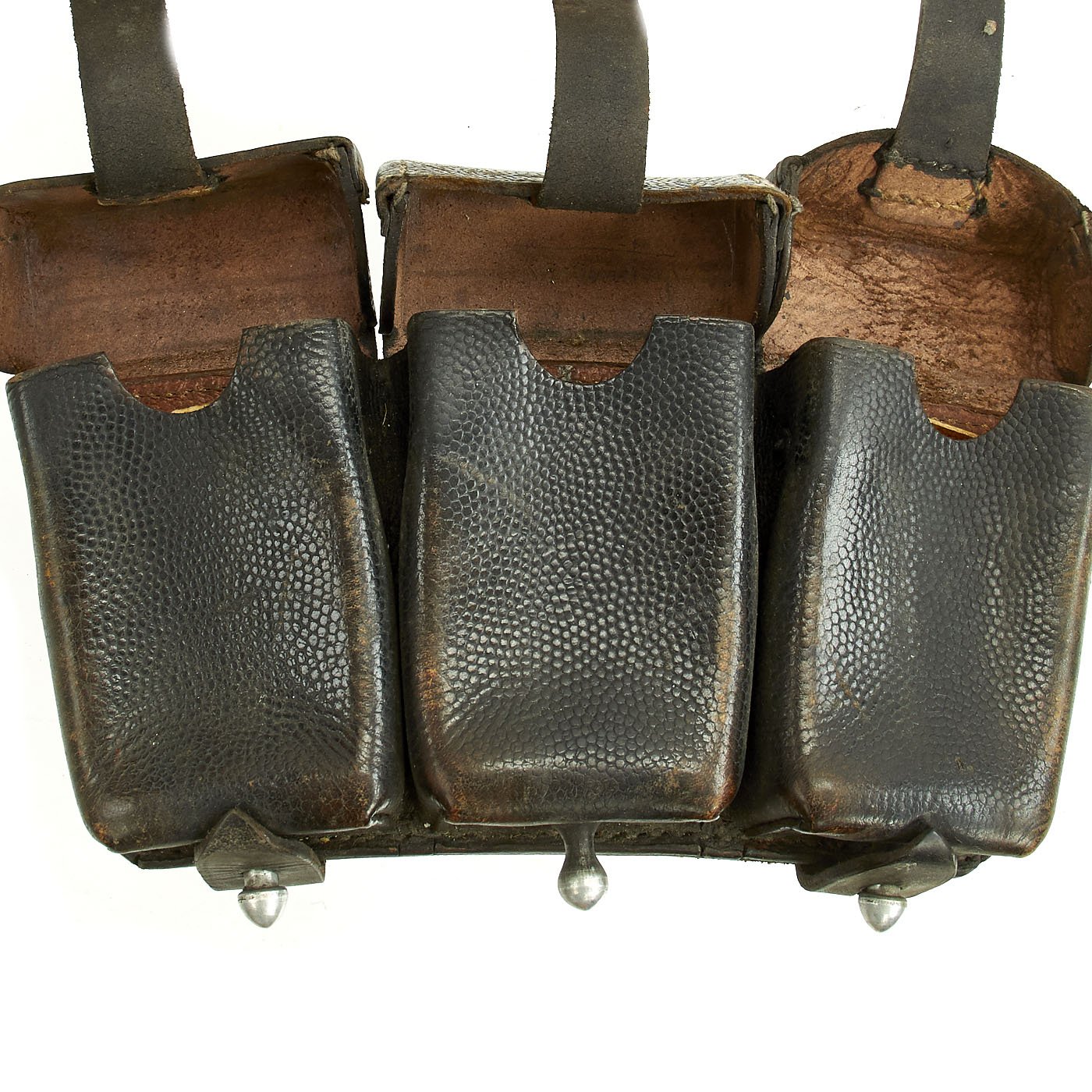 Original Item: Only One Set Available. This is an excellent example of a German WWII Naval-issue black pebble-grain leather triple Patronentaschen (ammunition pouch), designed to hold stripper clips for the Mauser k98K rifle. This was the standard German infantry rifle throughout WWII for all forces, even the Kriegsmarine / Navy. These pouches would be attached to the waist belt, and would be attached to combat suspenders using the rings on the back. Each pocket holds two stripper clips of 5 rounds, so each pouch holds 6 clips, or 30 rounds