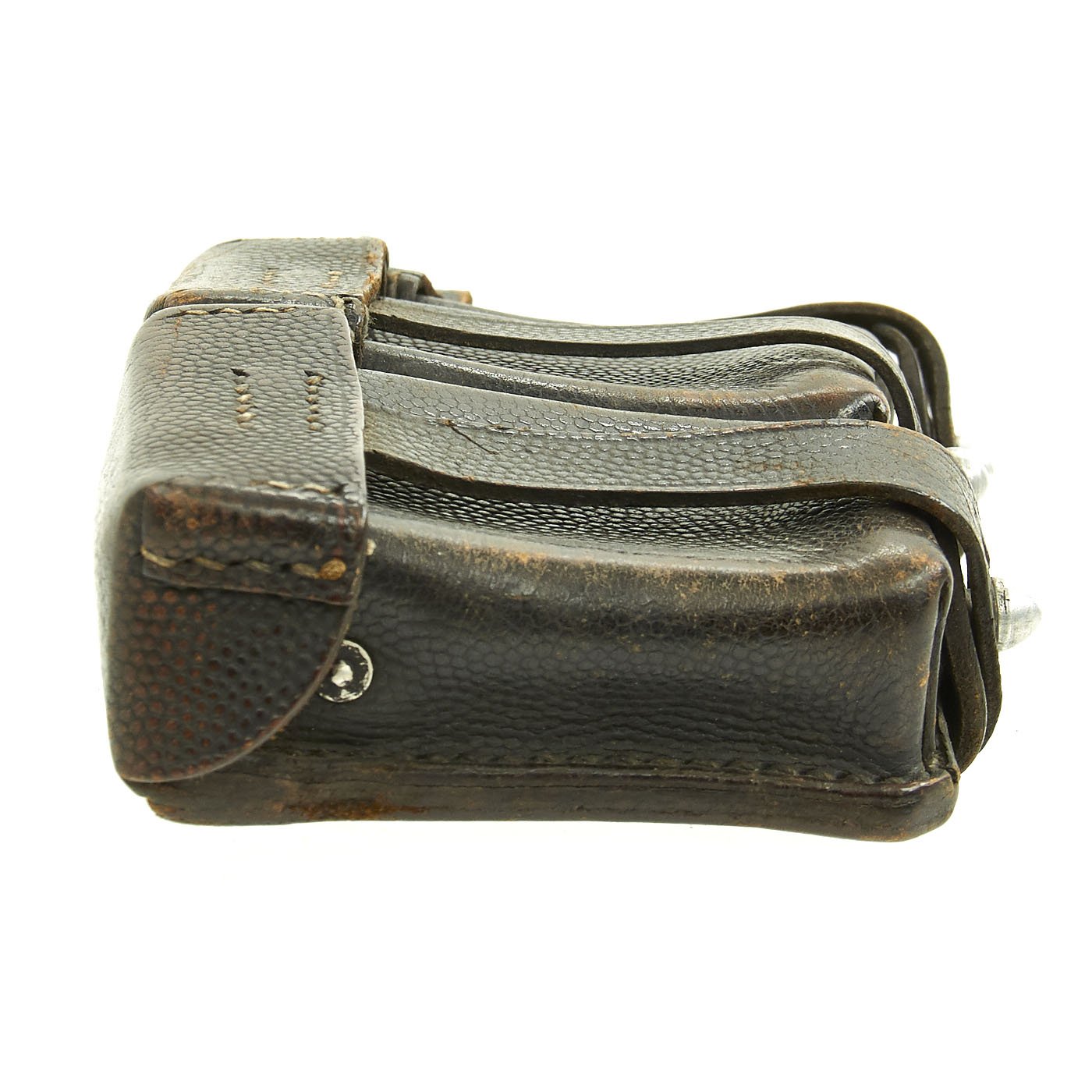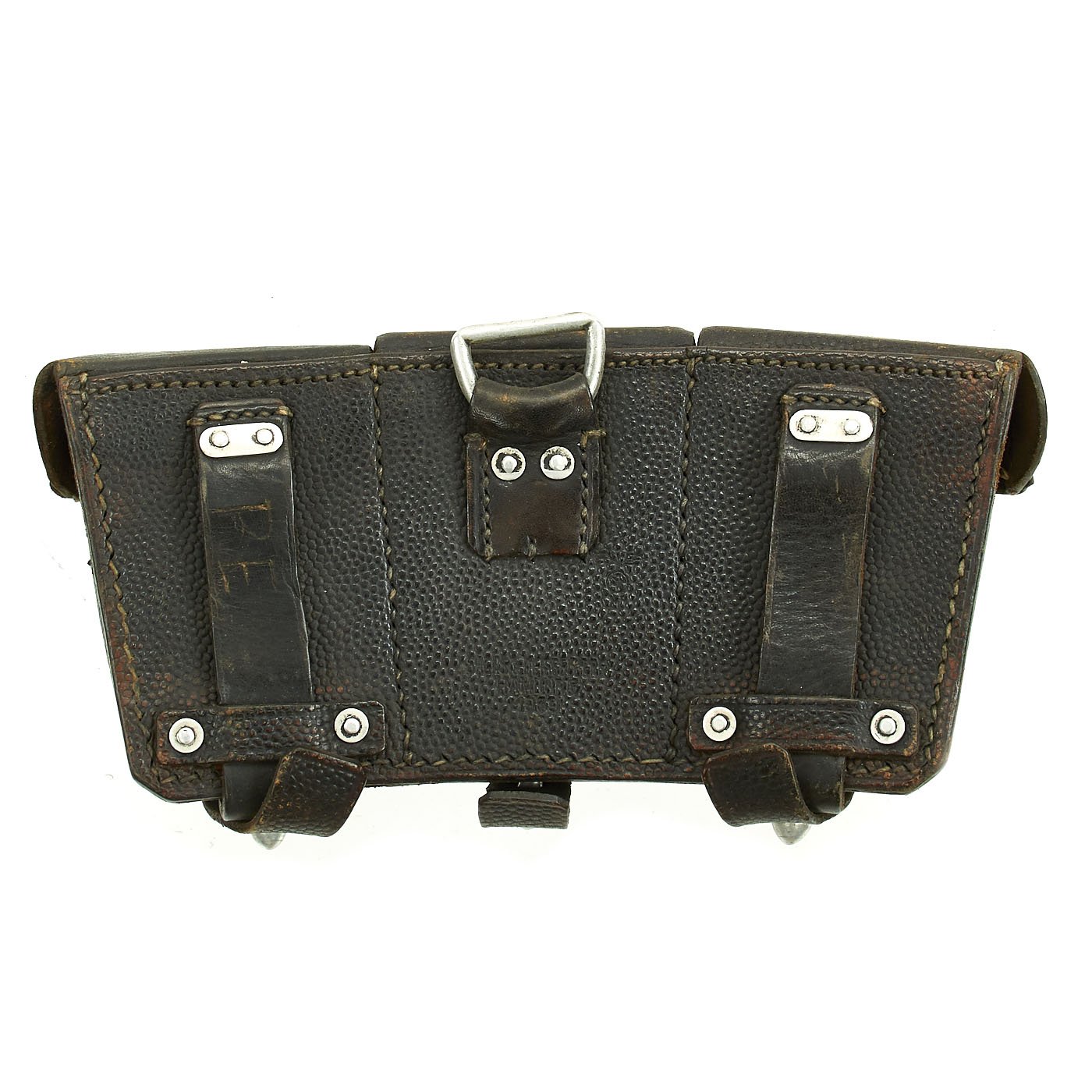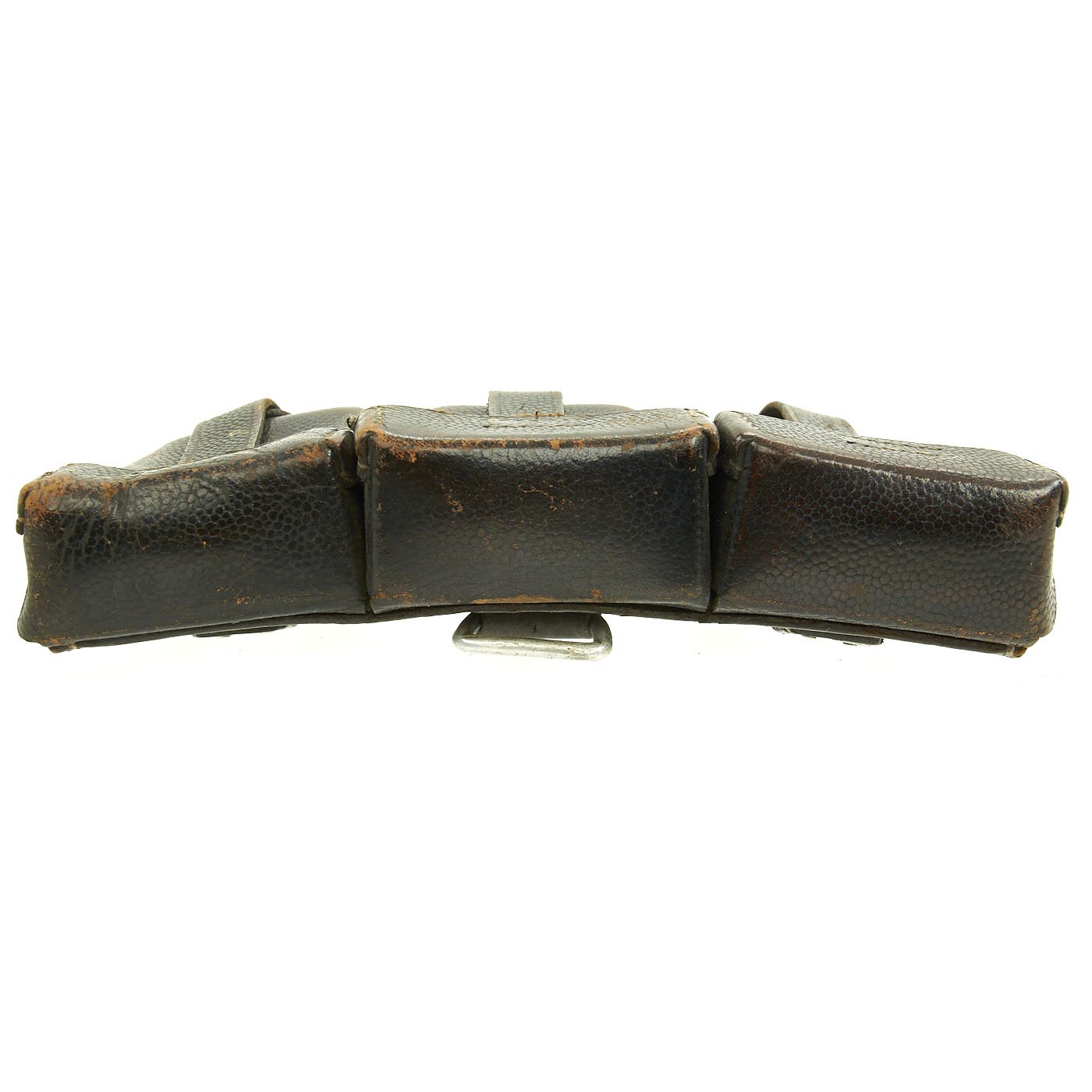 Original Item: Only One Set Available. This is an excellent example of a German WWII Naval-issue black pebble-grain leather triple Patronentaschen (ammunition pouch), designed to hold stripper clips for the Mauser k98K rifle. This was the standard German infantry rifle throughout WWII for all forces, even the Kriegsmarine / Navy. These pouches would be attached to the waist belt, and would be attached to combat suspenders using the rings on the back. Each pocket holds two stripper clips of 5 rounds, so each pouch holds 6 clips, or 30 rounds