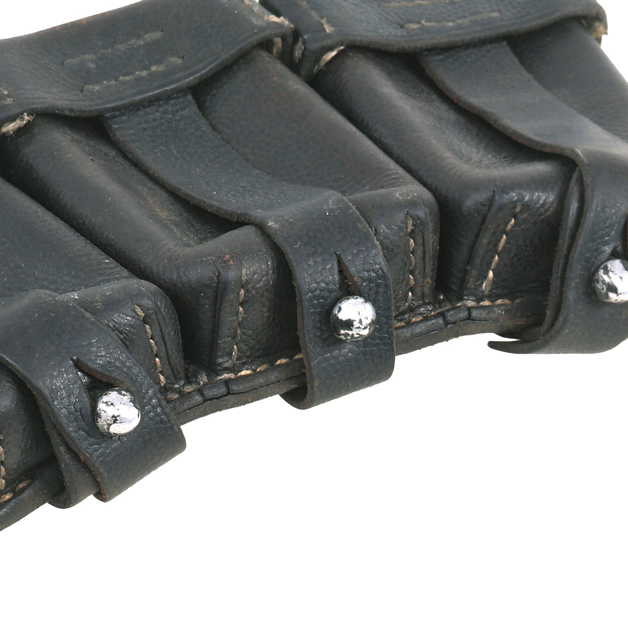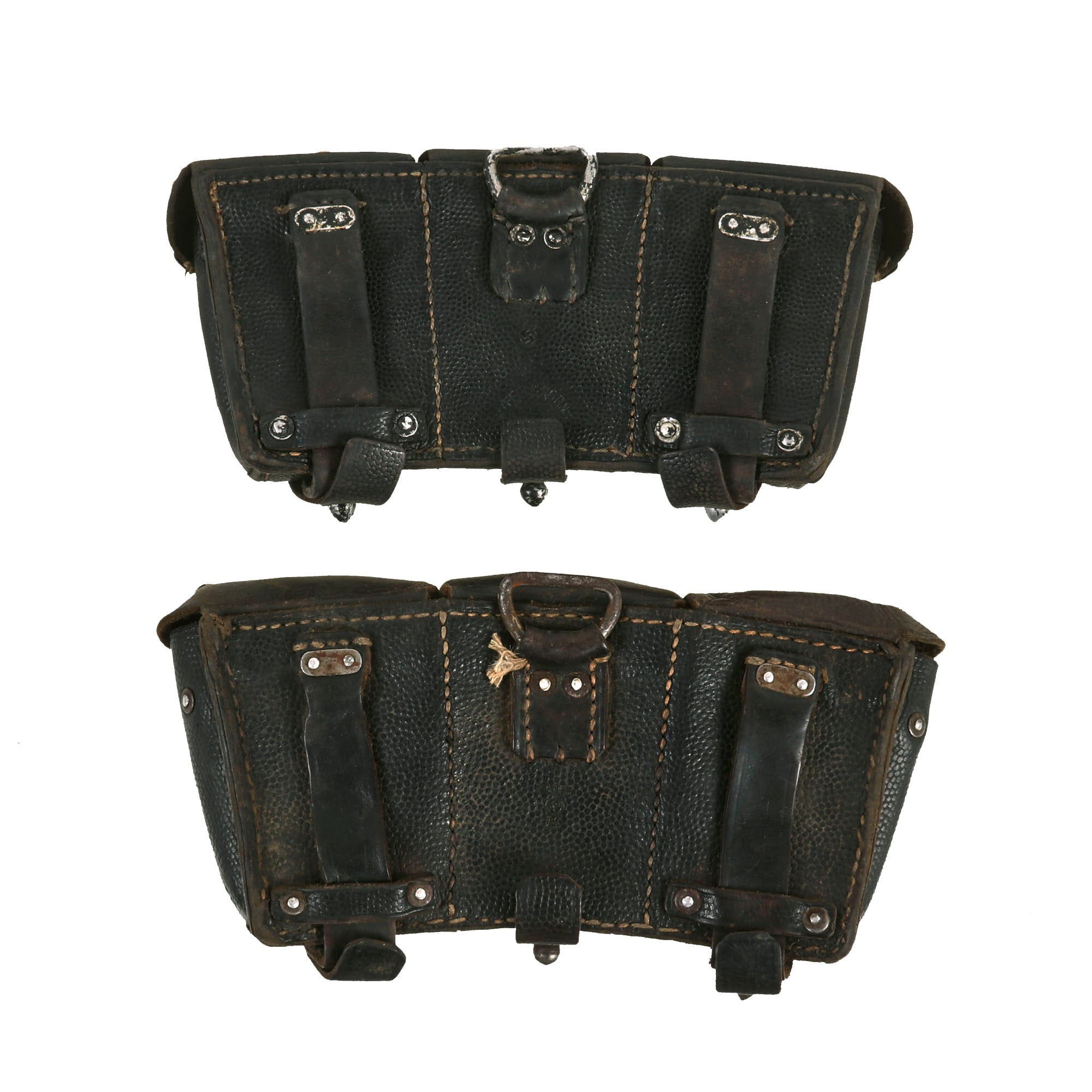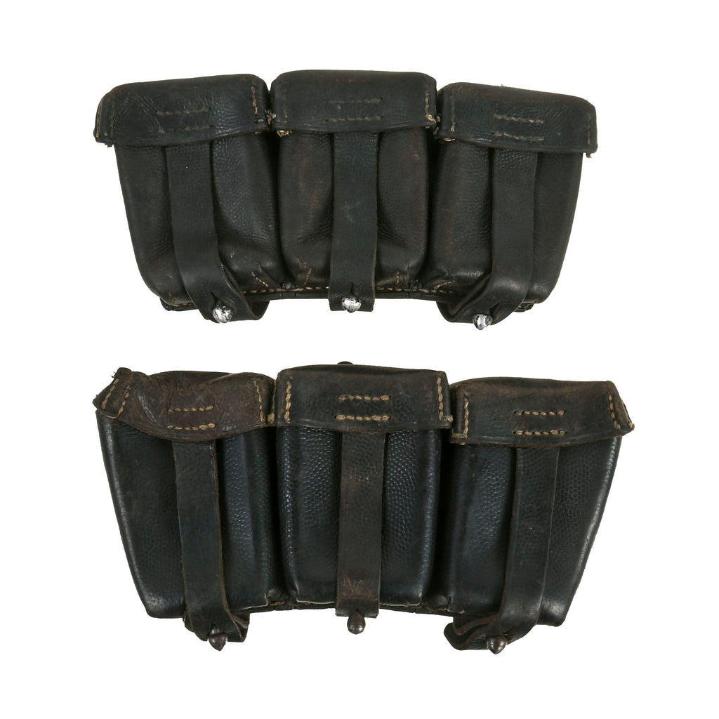 Original Item: Only One Lot of 2 Available. These are very nice German WWII Naval-issue brown pebble-grain leather triple Patronentaschen (ammunition pouch), designed to hold stripper clips for the Mauser k98K rifle. This was the standard German infantry rifle throughout WWII for all forces, even the Kriegsmarine / Navy. These pouches would be attached to the waist belt, and would be attached to combat suspenders using the rings on the back. Each pocket holds two stripper clips of 5 rounds, so each pouch holds 6 clips, or 30 rounds.