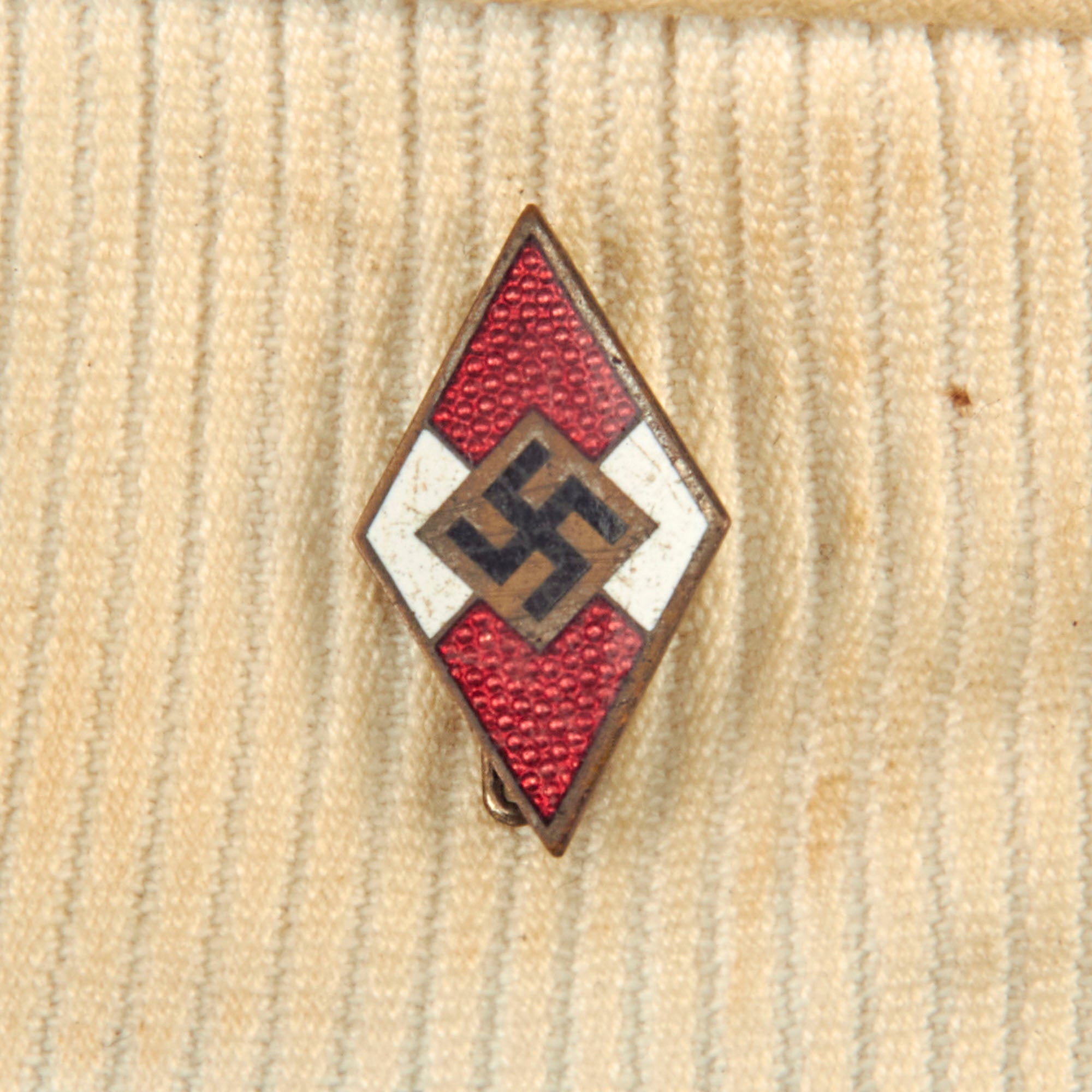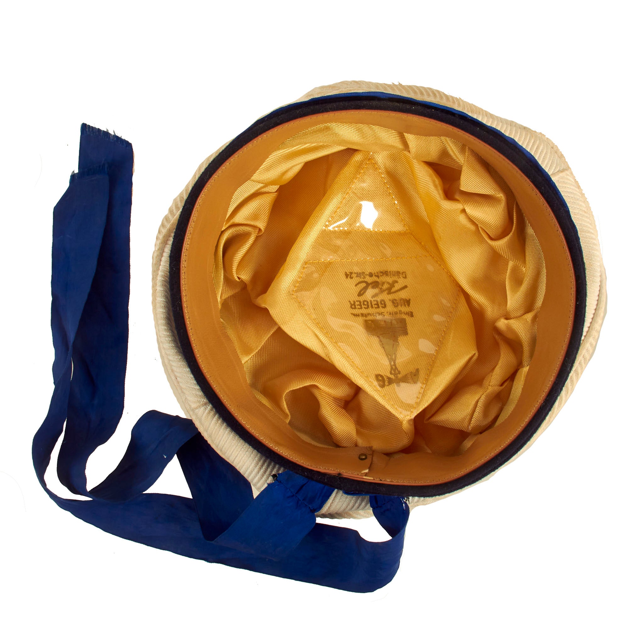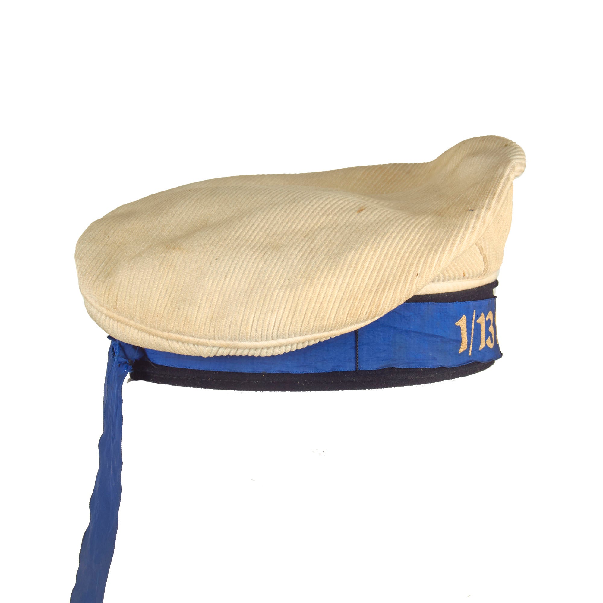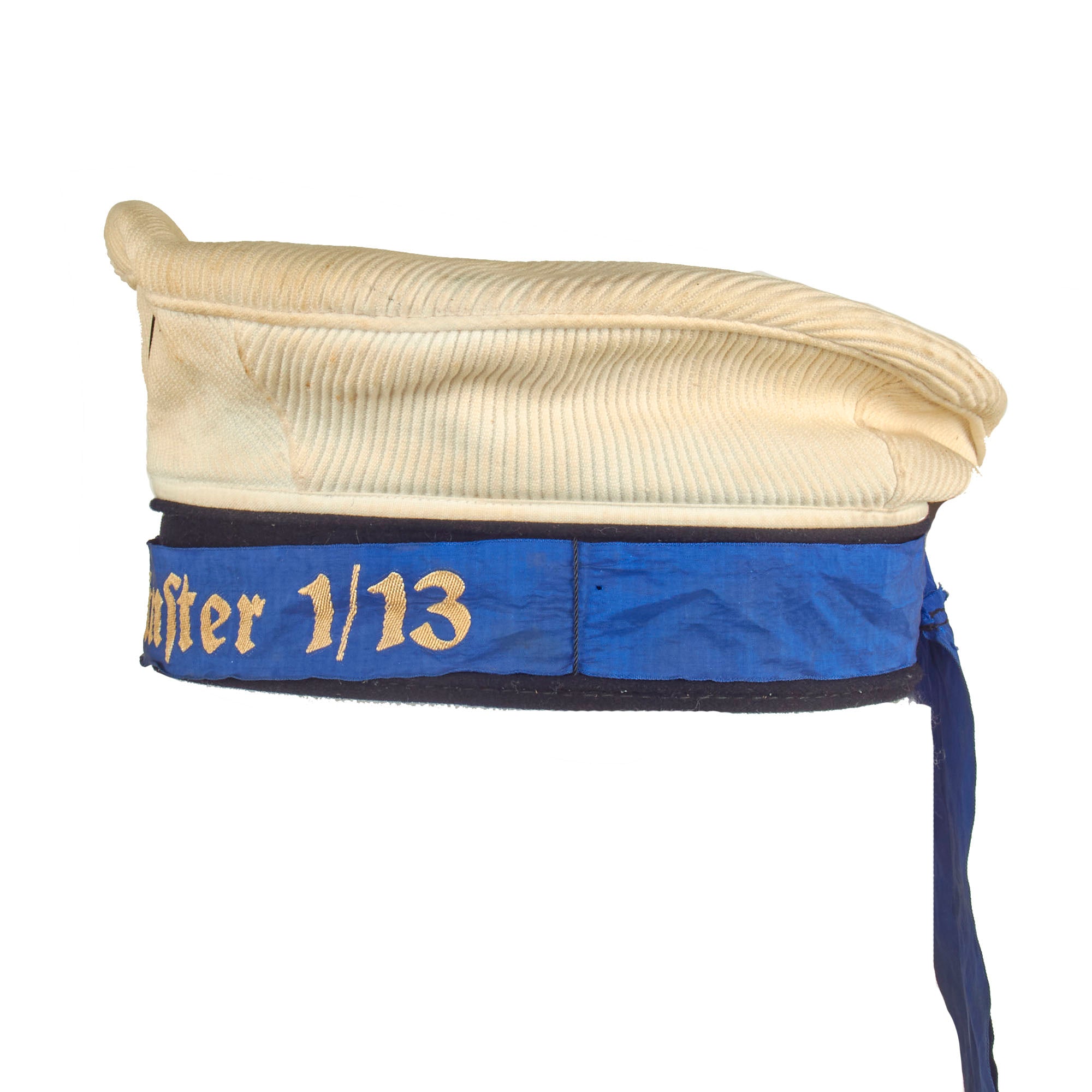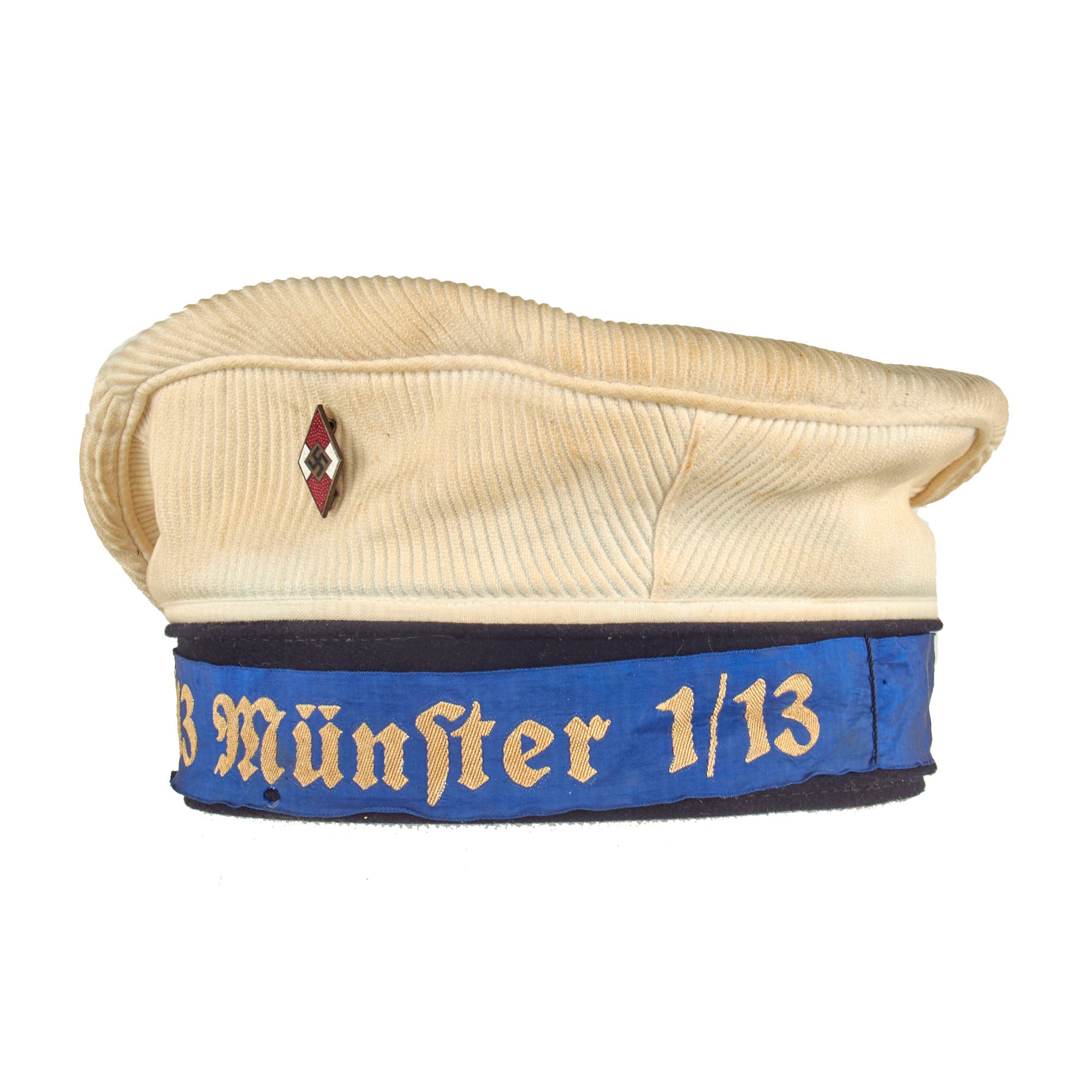 The bottom of the cap is dark navy blue, and has a blue HJ cap tally with 1/13 Münster 1/13 machine embroidered onto it, which would be the HJ unit that the owner was with. This style of cap has a removable crown, so the band was designed to be rather stiff, which helps hold on the top portion. This way the sailor would only have to buy one cap, and use different colors depending on the color uniform they were wearing. This cap is fitted with a lovely white corduroy "summer" style top, which can be removed.