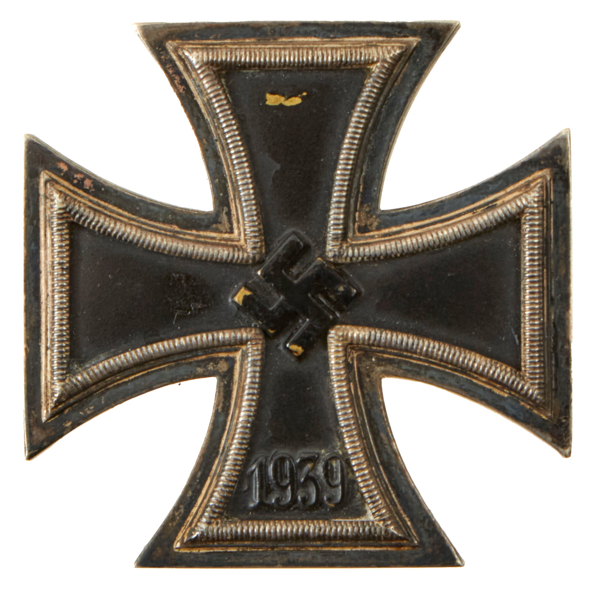 The basic design of the WWII crosses is a central Tatzenkreuz (cross pattée) struck from iron and mounted in a silver frame which has a raised crenulated decorative border. The obverse of the cross bears the date 1939 under a "mobile" swas. Second class crosses would have a ring at the top where a ring was attached, and had more markings on the back. The first class award, however, was meant to attach directly to the front of the uniform.