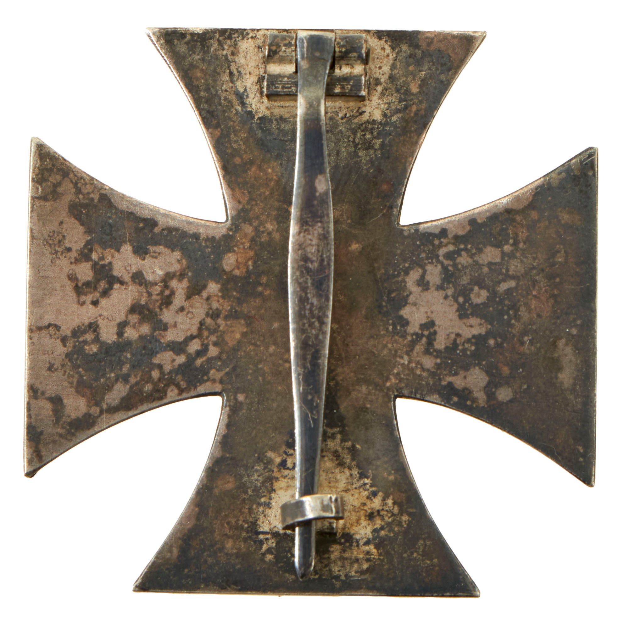 The medal is in very good condition, with the silver on the front tarnished to a lovely patina, showing that it is indeed real silver, while the back is a bit less tarnished, showing a mottled look. The black paint on the cross is very good, showing only light crazing and checking due to age. There is just a bit of missing paint on the swas in the center and on the top arm, showing a bit of the brass core material. The pinback attachment is fully functional, showing only a bit of a bend, and looks great!
