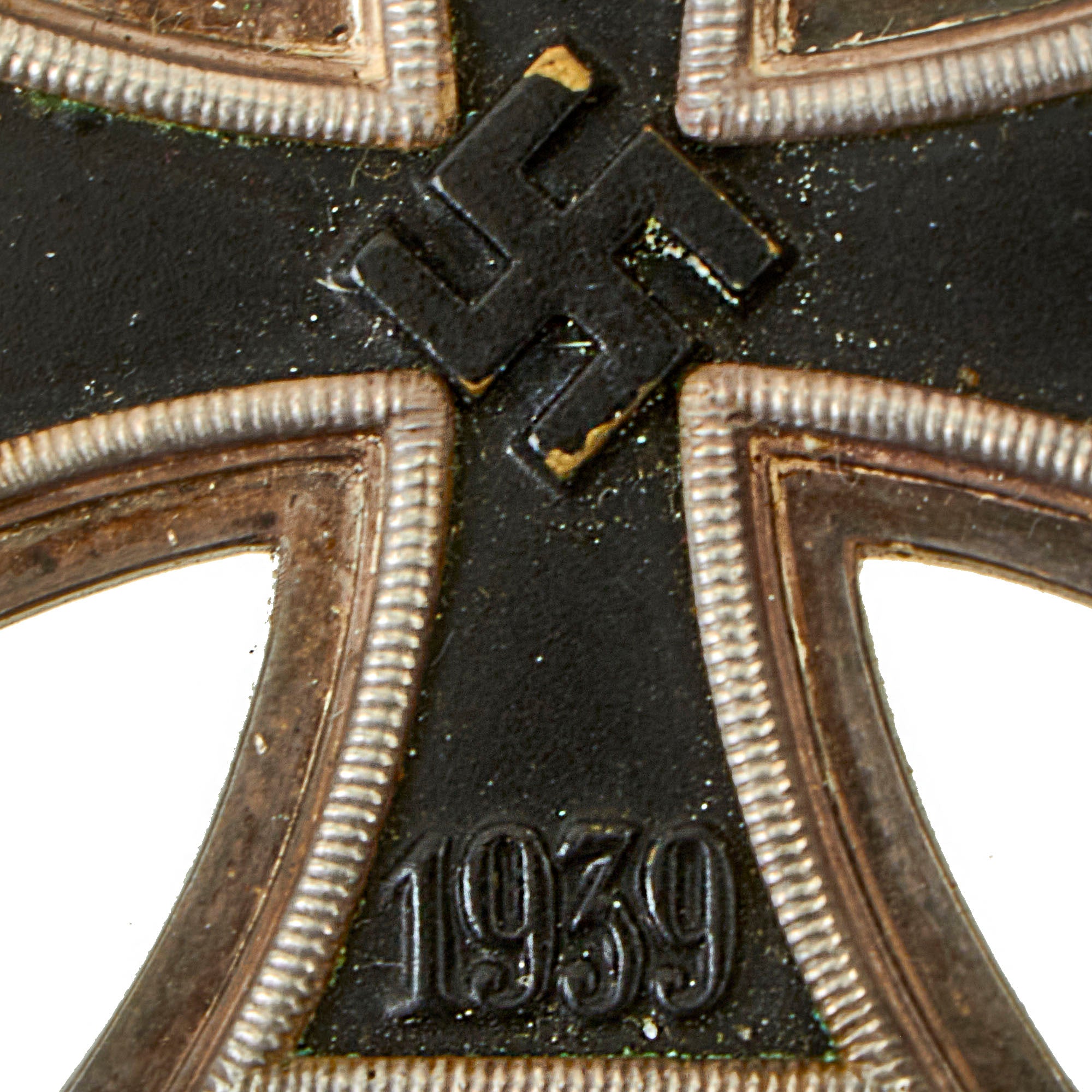 The basic design of the WWII crosses is a central Tatzenkreuz (cross pattée) struck from iron and mounted in a silver frame which has a raised crenulated decorative border. The obverse of the cross bears the date 1939 under a "mobile" swas. Second class crosses would have a ring at the top where a ring was attached, and had more markings on the back. The first class award, however, was meant to attach directly to the front of the uniform.