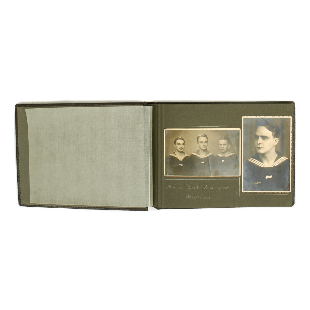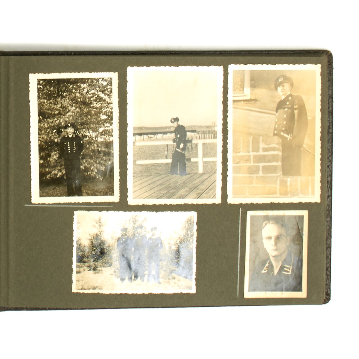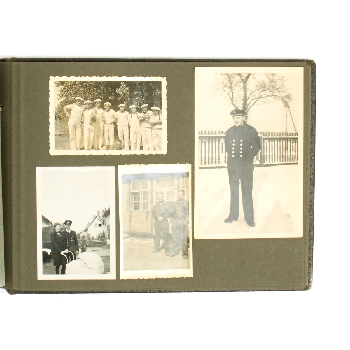 Original Item: One-of-a-kind-set. True Kriegsmarine material is always hard to find. This personal photo album features a young sailor in uniform and is 16 pages in length with 50 photos. The photos feature everything from the sailor in uniform with his young wife, to his fellow sailors, life on the sea, ships, officers and more. A very nice well kept and notated album from the hardest branch to find material the German Kriegsmarine!