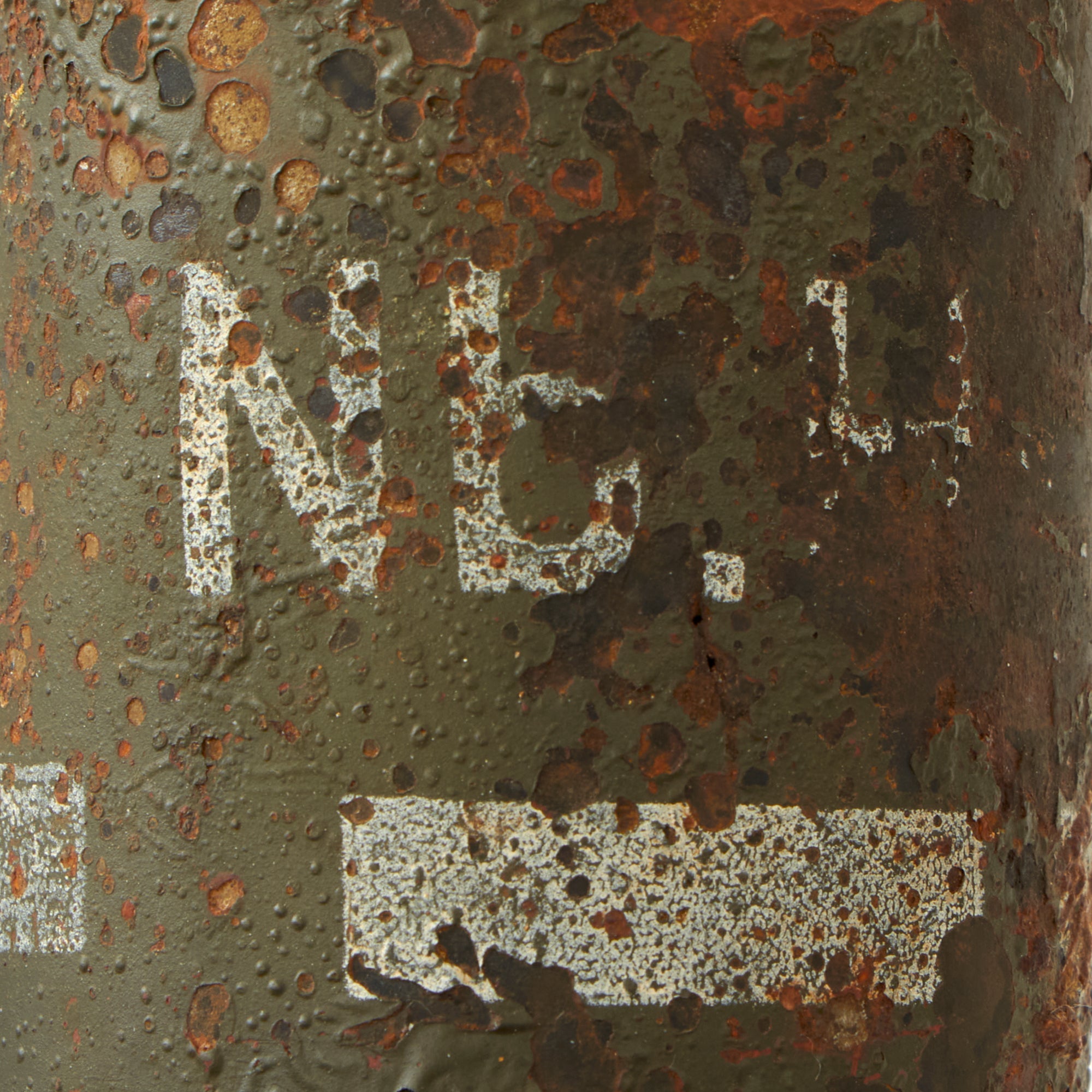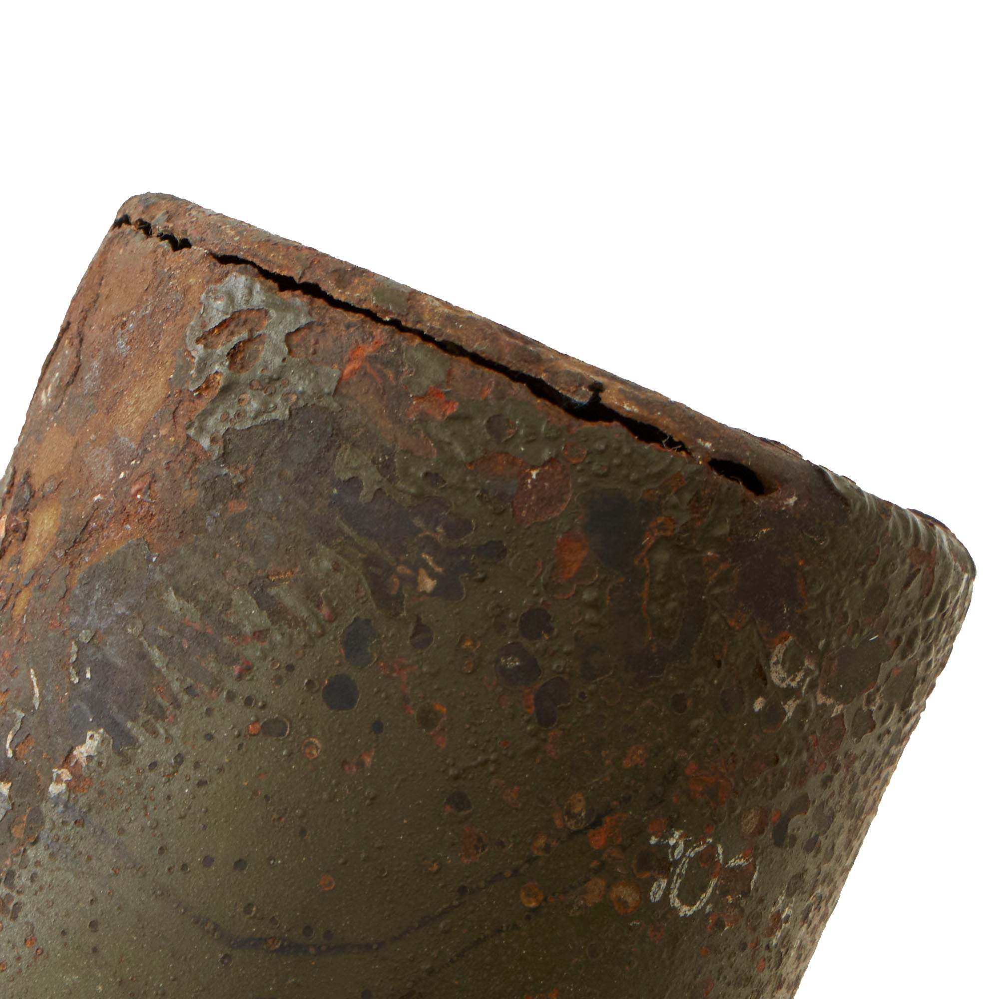 The warhead bears faint partial original paint including a clear white paint stencil that reads Nb. [Hgr. 39], along with the white band, for ease of identification as a smoke grenade and not a traditional M1924. The head also has the correct ventilation holes on the underside, where the smoke would exit once the grenade went off.