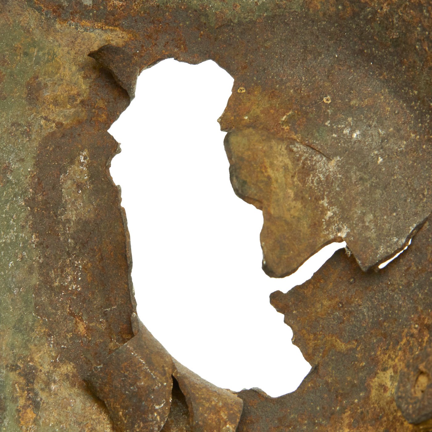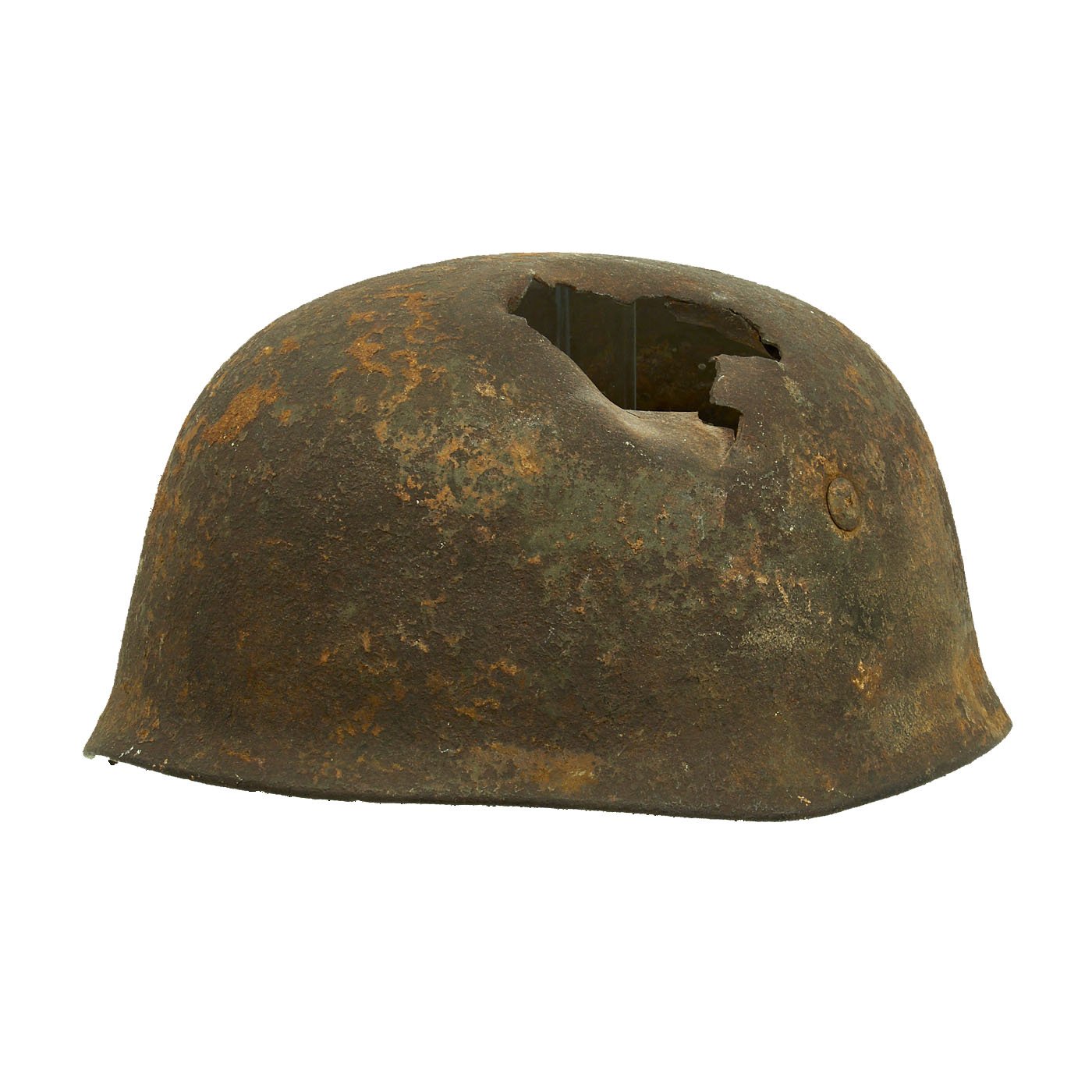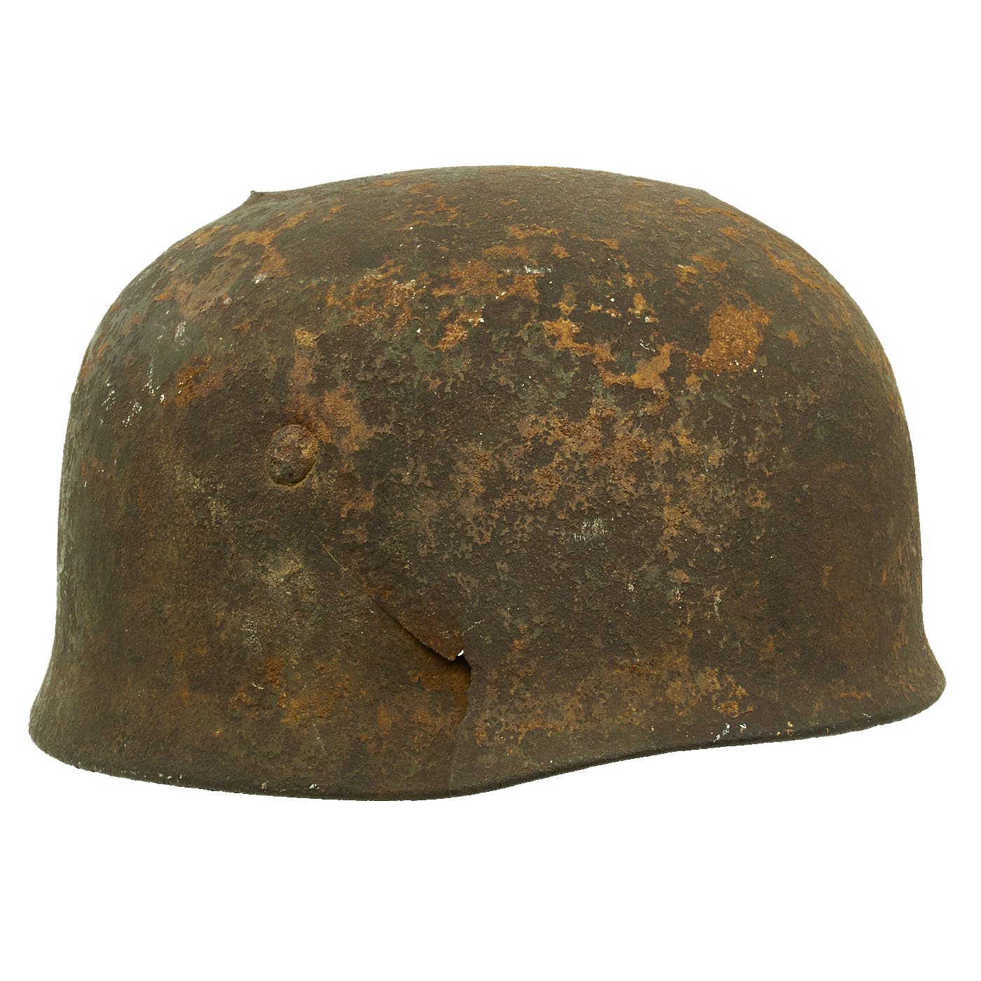 Original Item: One of a Kind. This is a genuine "Battlefield Pickup" example of a German WWII M38 Luftwaffe Fallschirmjäger (Paratrooper) Helmet. It was recovered some time after the war in Lichtenvoorde, a small town in the eastern Netherlands. The helmet had lain for some time undisturbed, so all of the original rigging and liner are completely absent, and it is now just a shell. Amazingly, there is still some of the original paint present, mostly on the inside of the helmet, but overall it is quite rusty, and looks every bit of its age.
